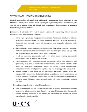 WYPRZEDAśE – PRAWA KONSUMENTÓW Ubrania przecenione nie podlegają reklamacji – sprzedawca, który informuje o tym klientów – łamie prawo. Nawet rzecz kupioną na wyprzedaŜy moŜna reklamować, ale juŜ jej zwrot zaleŜy tylko od dobrej woli sprzedawcy. Przypominamy o prawach korzystających z wyprzedaŜy [Warszawa, 2 stycznia 2015 r.] W czasie sezonowych wyprzedaŜy klienci powinni pamiętać o kilku podstawowych zasadach: • 2 lata – tyle wynosi czas na zgłoszenie reklamacji. Reklamację składamy w sklepie, w którym zrobiliśmy zakupy. Najlepiej na piśmie. Kupując rzeczy na wyprzedaŜy, ekspozycji lub z promocji – mamy tyle samo praw, co w przypadku zakupu po cenie regularnej. • MoŜemy Ŝądać: w przypadku rzeczy kupionych po 25 grudnia - naprawy, wymiany, obniŜenia ceny (konsument musi wskazać o ile powinna spaść cena) lub gdy wada jest istotna - zwrotu pieniędzy. Wybór naleŜy do klienta. • 1 rok od momentu zauwaŜenia wady – w takim czasie musimy zawiadomić sprzedawcę o tym, Ŝe produkt jest wadliwy. • Zwrot produktu, który po prostu nam się nie podoba – zaleŜy tylko od dobrej woli sprzedawcy. Gdy oferuje moŜliwość zwrotu towaru, sam określa warunki. MoŜe Ŝądać np. dołączenia opakowania, metek. W zamian – moŜe zaproponować konsumentowi m.in. zwrot gotówki, wymianę czy bon na zakupy w tej samej sieci. • Dowód zakupu – jest konieczny do zgłoszenia reklamacji. Najprostszym jest paragon, który powinniśmy dostać od kaŜdego sprzedawcy, nawet handlującego na bazarze. Ponadto – dowodem zakupu moŜe być teŜ potwierdzenie płatności kartą, wyciąg z konta, faktura, a nawet zeznania osób, które nam towarzyszyły podczas zakupów. Zwracajmy uwagę równieŜ na sztuczki sprzedawców: • 5,99 zł brzmi lepiej niŜ 6 zł - magiczne końcówki 99 groszy, odpowiednie ułoŜenie towarów na półce, muzyka, duŜe koszyki – to sztuczki sprzedawców, których nie zawsze jesteśmy świadomi, a ich celem jest zachęcenie do kupowania. Warto poznać choćby niektóre z nich. • Inne ceny - zdarzają się róŜnice w cenach podanych przy towarze z cenami zakodowanymi w kasie, czytniku oraz podanymi w gazetkach reklamowych. WaŜne: cena podana na półce lub na metce jest obowiązującą. W związku z tym, mamy prawo kupić produkt po tej właśnie cenie. • Gratisy muszą być bezpłatne jednak w rzeczywistości za taki prezent albo musimy zapłacić, albo okazuje się, Ŝe zakup towaru bez upominku jest znacznie bardziej opłacalny. Zdarza się, Ŝe kupując w komplecie np. szczoteczkę i pastę do zębów, zapłacimy więcej niŜ wtedy, gdy te same produkty weźmiemy osobno. Pamiętajmy, Ŝe towar oznaczony jako gratis musi być bezpłatny. • Reklamacja z pudełkiem? Opakowanie nie jest konieczne do złoŜenia reklamacji, dlatego sprzedawca nie moŜe go wymagać od klienta. Pomoc dla konsumentów: Inspekcja Handlowa, rzecznicy konsumentów, Federacja Konsumentów pod numerem infolinii 800 007 707. Porady są udzielane takŜe drogą elektroniczną pod adresem [email protected] . Dodatkowe informacje dla mediów: Małgorzata Cieloch, Rzecznik prasowy UOKiK pl. Powstańców Warszawy 1, 00-950 Warszawa Tel.: 22 827 28 92, 55 60 106, 55 60 314 E-mail: [email protected]