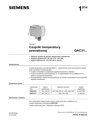 1 181401 814 Symaro™ Czujniki temperatury zewnętrznej QAC31... • Aktywne czujniki do pomiaru temperatury zewnętrznej • Napięcie zasilania 24 V AC lub 13,5…35 V DC • Sygnał wyjściowy 0...10 V DC lub 4...20 mA Zastosowanie Czujniki temperatury zewnętrznej QAC31... przeznaczone są do stosowania w instalacjach wentylacji i klimatyzacji jako: • Czujniki prowadzące w pogodowej regulacji temperatury zasilania • Czujniki pomiarowe wykorzystywane np. do optymalizacji lub do podłączenia do systemu zarządzania budynkiem • Wysokiej jakości czujniki pomieszczeniowe do pomiaru temperatury w przestrzeniach obiektów handlowych. Zestawienie typów Oznaczenie typu Zakres pomiarowy Napięcie zasilania Sygnał wyjściowy QAC3161 −50...+50 °C 24 V AC ±20 % / 13,5...35 V DC 0...10 V DC QAC3171 −50...+50 °C 13,5...35 V DC 4...20 mA Zamawianie i dostawa Przy zamówieniu należy podać nazwę i oznaczenie typu urządzenia, np.: Czujnik temperatury zewnętrznej QAC3161 Czujnik dostarczany jest z dławikiem kablowym M16. CE1N1814pl 27.04.2004 Siemens Building Technologies HVAC Products Urządzenia współpracujące Wszystkie systemy lub urządzenia, do których można podłączyć aktywny sygnał wyjściowy czujnika 0...10 V DC lub 4...20 mA. Działanie Czujnik dokonuje pomiaru temperatury zewnętrznej za pomocą elementu pomiarowego, którego rezystancja zmienia się w funkcji temperatury. Zmiana rezystancji przetwarzana jest na sygnał wyjściowy 0...10 V DC lub 4...20 mA, zależnie od typu czujnika. Sygnał wyjściowy odpowiada wybranemu zakresowi temperatury. Sygnał pomiarowy z czujnika podłączany jest do odpowiedniego regulatora. Budowa Kanałowy czujnik temperatury QAC31... składa się z obudowy, obwodu drukowanego, zacisków podłączeniowych i sondy pomiarowej. W skład dwuczęściowej obudowy wchodzi podstawa oraz zdejmowana pokrywa (mocowana wkrętami). Obwód pomiarowy i element nastawczy umieszczone są na obwodzie drukowanym wewnątrz pokrywy, a zaciski podłączeniowe znajdują się w podstawie. Sonda pomiarowa przykręcona jest do obudowy od dołu. Przewody mogą być doprowadzone do czujnika od tyłu (okablowanie podtynkowe) lub od dołu (okablowanie natynkowe). Do tego celu, w podstawie można wyłamać specjalny otwór lub zastosować dławik kablowy M16 przykręcając go od dołu do podstawy. Range 1 2 3 Zakres temp. 123 Funkcja testowania U1 I1 10 V 20 mA 5V 12 mA 0V 4 mA 5V 12 mA 1814Z03pl Element nastawczy Element nastawczy umieszczony jest wewnątrz pokrywy. Składa się z 6-pinowego złącza oraz zwory. Element ten jest używany do wyboru wymaganego zakresu pomiarowego oraz do włączania funkcji testowania. Różne położenia zwory mają następujące znaczenie: • Do wyboru zakresu pomiarowego: Zwora w lewym położeniu (R1) = 0...50 °C Zwora w środkowym położeniu (R2) = −50...+50 °C (nastawa fabryczna) Zwora w prawym położeniu (R3) = −35...+35 °C • Do uaktywnienia funkcji testowania: Zwora w położeniu poziomym. Sygnał wyjściowy czujnika przyjmuje wartości zgodnie z tabelką „Funkcja testowania”. Awaria W przypadku awarii, sygnał wyjściowy czujnika przyjmuje wartość 0 V (4 mA) po upływie 60 sekund. Wskazówki do projektowania Do zasilania czujnika wymagany jest transformator na niskie napięcie bezpieczne (SELV) z odseparowanymi uzwojeniami i przeznaczony do pracy ze 100 % obciążeniem. Przy doborze i elektrycznym zabezpieczaniu transformatora należy przestrzegać lokalnych przepisów dotyczących bezpieczeństwa. 2/4 Siemens Building Technologies HVAC Products Czujniki temperatury zewnętrznej QAC3161, QAC3171 CE1N1814pl 27.04.2004 Przy doborze transformatora należy uwzględnić pobór mocy czujnika temperatury zewnętrznej. Informacje dotyczące prawidłowego okablowania – patrz karta katalogowa urządzenia, z którym czujnik jest stosowany. Przestrzegać dopuszczalnych długości przewodów. Przy układaniu kabli pamiętać, że im dłuższe są równolegle prowadzone kable i im mniejsza między nimi odległość, tym większe występują zakłócenia elektryczne. Do wtórnej strony zasilania i do linii sygnałowych wymagana jest skrętka. Prowadzenie i dobór kabli Wskazówki do montażu Zależnie od zastosowania, czujnik temperatury może być montowany następująco: Miejsce montażu • Przy regulacji: Na ścianie domu lub budynku z oknami najczęściej użytkowanego pomieszczenia, ale na czujnik nie może oddziaływać poranne promieniowanie słoneczne. W razie wątpliwości, czujnik należy montować na północnej lub północno-zachodniej ścianie. • Przy optymalizacji: Zawsze na najzimniejszej ścianie domu lub budynku (zwykle ściana północna). Czujnik w żadnym wypadku nie może być narażony na poranne promieniowanie słoneczne. Wysokość montażu Montaż czujnika zaleca się wykonać na środku domu lub budynku lub strefy grzewczej, ale na wysokości nad ziemią co najmniej 2,5 m. Czujnika nie można montować w następujących miejscach: • Nad oknami, drzwiami, wywietrznikami lub innymi źródłami ciepła • Pod balkonami lub okapami dachowymi Aby uniknąć błędów pomiaru spowodowanych cyrkulacją powietrza, korytko kablowe przy czujniku powinno być uszczelnione. Czujnika nie wolno malować. Instrukcja montażu wydrukowana jest na opakowaniu. Wskazówki do uruchomienia Przed włączeniem zasilania sprawdzić okablowanie. W razie potrzeby, w czujniku ustawić wymagany zakres pomiarowy temperatury. Dane techniczne Zasilanie Napięcie zasilania Częstotliwość Pobór mocy Długość kabla sygnału pomiarowego Dopuszczalne długości kabla Kabel miedziany ∅0,6 mm Kabel miedziany 1,0 mm2 Kabel miedziany 1,5 mm2 Zakres pomiarowy Dane funkcjonalne ∆ϑ [K] 1814D01 1.0 0.5 Element pomiarowy Stała czasowa Dokładność pomiaru Sygnał wyjściowy, liniowy (zacisk U1) 0.0 −0.5 −1.0 −50 −40 −30 −20 −10 Sygnał wyjściowy, liniowy (zacisk I1) 0 10 20 30 40 50 ϑ [°C] patrz „Z