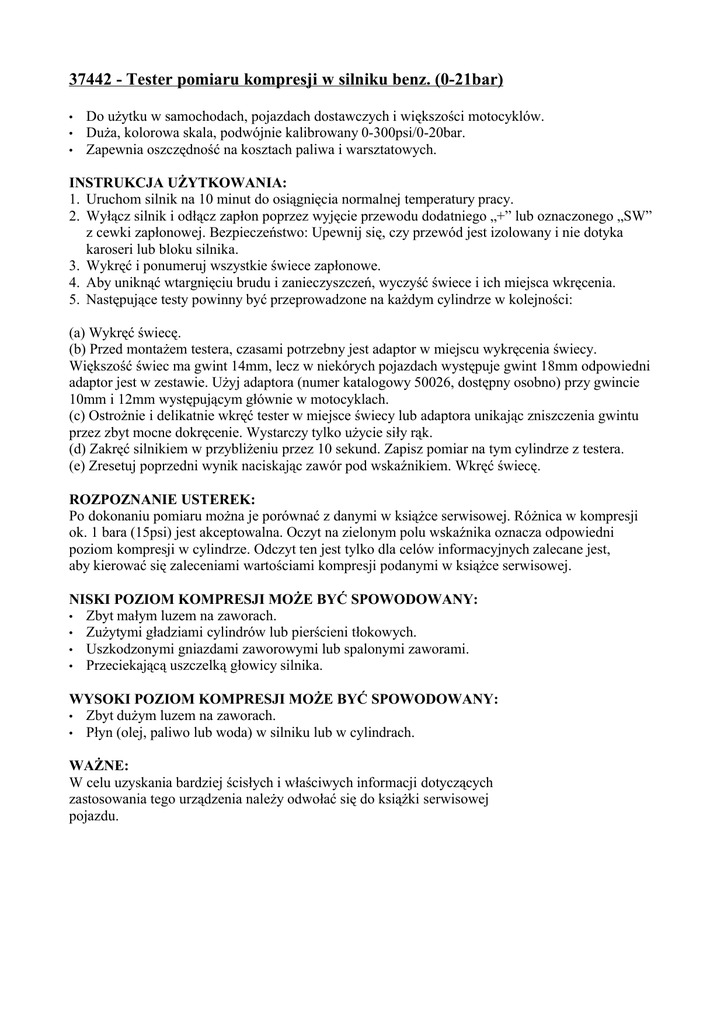 37442 - Tester pomiaru kompresji w silniku benz. (0-21bar) • • • Do użytku w samochodach, pojazdach dostawczych i większości motocyklów. Duża, kolorowa skala, podwójnie kalibrowany 0-300psi/0-20bar. Zapewnia oszczędność na kosztach paliwa i warsztatowych. INSTRUKCJA UŻYTKOWANIA: 1. Uruchom silnik na 10 minut do osiągnięcia normalnej temperatury pracy. 2. Wyłącz silnik i odłącz zapłon poprzez wyjęcie przewodu dodatniego „+” lub oznaczonego „SW” z cewki zapłonowej. Bezpieczeństwo: Upewnij się, czy przewód jest izolowany i nie dotyka karoseri lub bloku silnika. 3. Wykręć i ponumeruj wszystkie świece zapłonowe. 4. Aby uniknąć wtargnięciu brudu i zanieczyszczeń, wyczyść świece i ich miejsca wkręcenia. 5. Następujące testy powinny być przeprowadzone na każdym cylindrze w kolejności: (a) Wykręć świecę. (b) Przed montażem testera, czasami potrzebny jest adaptor w miejscu wykręcenia świecy. Większość świec ma gwint 14mm, lecz w niekórych pojazdach występuje gwint 18mm odpowiedni adaptor jest w zestawie. Użyj adaptora (numer katalogowy 50026, dostępny osobno) przy gwincie 10mm i 12mm występującym głównie w motocyklach. (c) Ostrożnie i delikatnie wkręć tester w miejsce świecy lub adaptora unikając zniszczenia gwintu przez zbyt mocne dokręcenie. Wystarczy tylko użycie siły rąk. (d) Zakręć silnikiem w przybliżeniu przez 10 sekund. Zapisz pomiar na tym cylindrze z testera. (e) Zresetuj poprzedni wynik naciskając zawór pod wskaźnikiem. Wkręć świecę. ROZPOZNANIE USTEREK: Po dokonaniu pomiaru można je porównać z danymi w książce serwisowej. Różnica w kompresji ok. 1 bara (15psi) jest akceptowalna. Oczyt na zielonym polu wskaźnika oznacza odpowiedni poziom kompresji w cylindrze. Odczyt ten jest tylko dla celów informacyjnych zalecane jest, aby kierować się zaleceniami wartościami kompresji podanymi w książce serwisowej. NISKI POZIOM KOMPRESJI MOŻE BYĆ SPOWODOWANY: • Zbyt małym luzem na zaworach. • Zużytymi gładziami cylindrów lub pierścieni tłokowych. • Uszkodzonymi gniazdami zaworowymi lub spalonymi zaworami. • Przeciekającą uszczelką głowicy silnika. WYSOKI POZIOM KOMPRESJI MOŻE BYĆ SPOWODOWANY: • Zbyt dużym luzem na zaworach. • Płyn (olej, paliwo lub woda) w silniku lub w cylindrach. WAŻNE: W celu uzyskania bardziej ścisłych i właściwych informacji dotyczących zastosowania tego urządzenia należy odwołać się do książki serwisowej pojazdu.