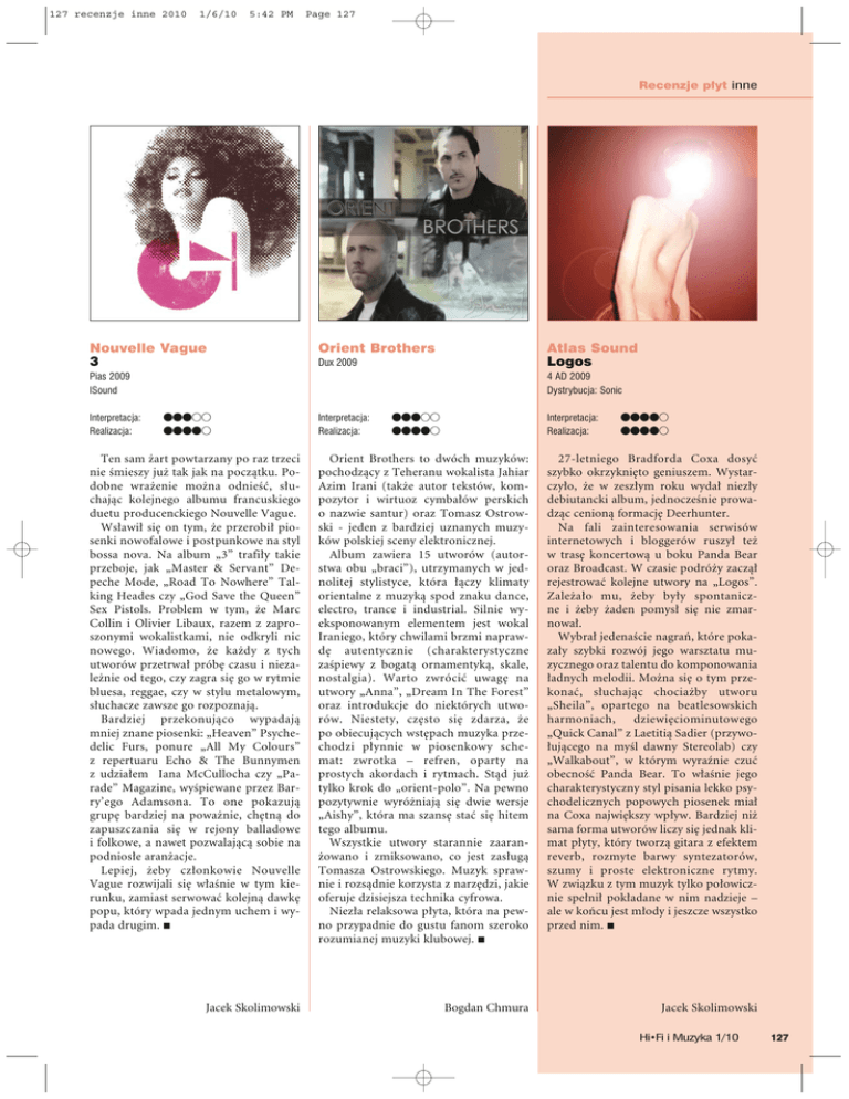 127 recenzje inne 2010 1/6/10 5:42 PM Page 127 Recenzje p∏yt inne Nouvelle Vague 3 Orient Brothers Atlas Sound Logos Dux 2009 Pias 2009 ISound Interpretacja: Realizacja: 4 AD 2009 Dystrybucja: Sonic ≤≤≤≥≥ ≤≤≤≤≥ Interpretacja: Realizacja: Interpretacja: Realizacja: ≤≤≤≥≥ ≤≤≤≤≥ ≤≤≤≤≥ ≤≤≤≤≥ Ten sam ˝art powtarzany po raz trzeci nie Êmieszy ju˝ tak jak na poczàtku. Podobne wra˝enie mo˝na odnieÊç, s∏uchajàc kolejnego albumu francuskiego duetu producenckiego Nouvelle Vague. Ws∏awi∏ si´ on tym, ˝e przerobi∏ piosenki nowofalowe i postpunkowe na styl bossa nova. Na album „3” trafi∏y takie przeboje, jak „Master & Servant” Depeche Mode, „Road To Nowhere” Talking Heades czy „God Save the Queen” Sex Pistols. Problem w tym, ˝e Marc Collin i Olivier Libaux, razem z zaproszonymi wokalistkami, nie odkryli nic nowego. Wiadomo, ˝e ka˝dy z tych utworów przetrwa∏ prób´ czasu i niezale˝nie od tego, czy zagra si´ go w rytmie bluesa, reggae, czy w stylu metalowym, s∏uchacze zawsze go rozpoznajà. Bardziej przekonujàco wypadajà mniej znane piosenki: „Heaven” Psychedelic Furs, ponure „All My Colours” z repertuaru Echo & The Bunnymen z udzia∏em Iana McCullocha czy „Parade” Magazine, wyÊpiewane przez Barry’ego Adamsona. To one pokazujà grup´ bardziej na powa˝nie, ch´tnà do zapuszczania si´ w rejony balladowe i folkowe, a nawet pozwalajàcà sobie na podnios∏e aran˝acje. Lepiej, ˝eby cz∏onkowie Nouvelle Vague rozwijali si´ w∏aÊnie w tym kierunku, zamiast serwowaç kolejnà dawk´ popu, który wpada jednym uchem i wypada drugim. ≤ Orient Brothers to dwóch muzyków: pochodzàcy z Teheranu wokalista Jahiar Azim Irani (tak˝e autor tekstów, kompozytor i wirtuoz cymba∏ów perskich o nazwie santur) oraz Tomasz Ostrowski - jeden z bardziej uznanych muzyków polskiej sceny elektronicznej. Album zawiera 15 utworów (autorstwa obu „braci”), utrzymanych w jednolitej stylistyce, która ∏àczy klimaty orientalne z muzykà spod znaku dance, electro, trance i industrial. Silnie wyeksponowanym elementem jest wokal Iraniego, który chwilami brzmi naprawd´ autentycznie (charakterystyczne zaÊpiewy z bogatà ornamentykà, skale, nostalgia). Warto zwróciç uwag´ na utwory „Anna”, „Dream In The Forest” oraz introdukcje do niektórych utworów. Niestety, cz´sto si´ zdarza, ˝e po obiecujàcych wst´pach muzyka przechodzi p∏ynnie w piosenkowy schemat: zwrotka – refren, oparty na prostych akordach i rytmach. Stàd ju˝ tylko krok do „orient-polo”. Na pewno pozytywnie wyró˝niajà si´ dwie wersje „Aishy”, która ma szans´ staç si´ hitem tego albumu. Wszystkie utwory starannie zaaran˝owano i zmiksowano, co jest zas∏ugà Tomasza Ostrowskiego. Muzyk sprawnie i rozsàdnie korzysta z narz´dzi, jakie oferuje dzisiejsza technika cyfrowa. Niez∏a relaksowa p∏yta, która na pewno przypadnie do gustu fanom szeroko rozumianej muzyki klubowej. ≤ 27-letniego Bradforda Coxa dosyç szybko okrzykni´to geniuszem. Wystarczy∏o, ˝e w zesz∏ym roku wyda∏ niez∏y debiutancki album, jednoczeÊnie prowadzàc cenionà formacj´ Deerhunter. Na fali zainteresowania serwisów internetowych i bloggerów ruszy∏ te˝ w tras´ koncertowà u boku Panda Bear oraz Broadcast. W czasie podró˝y zaczà∏ rejestrowaç kolejne utwory na „Logos”. Zale˝a∏o mu, ˝eby by∏y spontaniczne i ˝eby ˝aden pomys∏ si´ nie zmarnowa∏. Wybra∏ jedenaÊcie nagraƒ, które pokaza∏y szybki rozwój jego warsztatu muzycznego oraz talentu do komponowania ∏adnych melodii. Mo˝na si´ o tym przekonaç, s∏uchajàc chocia˝by utworu „Sheila”, opartego na beatlesowskich harmoniach, dziewi´ciominutowego „Quick Canal” z Laetitià Sadier (przywo∏ujàcego na myÊl dawny Stereolab) czy „Walkabout”, w którym wyraênie czuç obecnoÊç Panda Bear. To w∏aÊnie jego charakterystyczny styl pisania lekko psychodelicznych popowych piosenek mia∏ na Coxa najwi´kszy wp∏yw. Bardziej ni˝ sama forma utworów liczy si´ jednak klimat p∏yty, który tworzà gitara z efektem reverb, rozmyte barwy syntezatorów, szumy i proste elektroniczne rytmy. W zwiàzku z tym muzyk tylko po∏owicznie spe∏ni∏ pok∏adane w nim nadzieje – ale w koƒcu jest m∏ody i jeszcze wszystko przed nim. ≤ Jacek Skolimowski Bogdan Chmura Jacek Skolimowski Hi•Fi i Muzyka 1/10 127