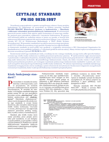 PRAKTYKA CZYTAJ¥C STANDARD PN-ISO 9836:1997 Nowelizacja rozporz¹dzenia w sprawie szczegó³owego zakresu i formy projektu budowlanego [1] oddawanego do pozwolenia na budowê powo³uje standard PN-ISO 9836:1997 W³aœciwoœci u¿ytkowe w budownictwie -- Okreœlanie i obliczanie wskaŸników powierzchniowych i kubaturowych. W informacjach prasowych mo¿na znaleŸæ wiele opisów, opinii i komentarzy na temat tego standardu, pisanych przez prawników, redaktorów i in¿ynierów budownictwa. W g¹szczu tych informacji jednak nie znalaz³em miejsca w prasie czy portalu, w którym by³a Jacek Danielewicz umieszczona informacja napisana lub autoryzowana przez jednego z nas, czyli przez Cz³onek Komitetu Technicznego ds. Projektowania Budowlanego w PKN cz³onka KT 232 ds. Projektowania Budowlanego w PKN (Polski Komitet Normalizacyjny). Wspomniany standard jest wg zakresu merytorycznego przypisany do KT 232 i od kilku lat uczestniczê w jego pracach. Komitet ten jest odpowiedzialny za t³umaczenie standardu na jêzyk polski oraz zgodnoœæ z orygina³em stworzonym w ISO (International Organization for Standardization), który publikuje standardy w 3-4 jêzykach (polski do nich nie nale¿y). Mamy równie¿ wp³yw na wersjê pierwotn¹ aktywnie uczestnicz¹c w pracach TC 59/SC 3 w ISO. Kontrowersji wokó³ tego standardu jest wiele, a wynikaj¹ one nie z samego standardu, czy jego treœci, tylko sposobu funkcjonowania tego Ÿród³a wiedzy technicznej w polskiej przestrzeni spo³ecznej i prawnej. W spo³eczeñstwie ci¹gle utrzymywanym w przekonaniu o nadrzêdnej roli pañstwa, standardy, bêd¹ce konsensusem spo³ecznym grup dostawców i odbiorców produktu, maj¹ nader niekorzystne œrodowisko dla prawid³owego funkcjonowania. Zatem, aby mimo wszystko wiedza w nich zawarta s³u¿y³a powszechnemu po¿ytkowi, jest wymagane wyjaœnienie praktycznego funkcjonowania standardów w prawie, jak i istotnych szczegó³ów dotycz¹cych tego konkretnego Ÿród³a wiedzy technicznej. W zakresie wspomnianego standardu najwiêkszego wyjaœnienia wymagaj¹ istotne zwroty wynikaj¹ce z prawa w³asnoœci do nieruchomoœci. Koniecznym wstêpem do szczegó³owych rozwa¿añ jest wyjaœnienie, kiedy i w jaki sposób funkcjonuje standard w przepisach prawa. Kiedy funkcjonuje standard ? P owszechnie w stosunku do normy mówimy o obowi¹zywaniu, a jest to przynale¿ne, ale normom prawnym usankcjonowanym przepisem obowi¹zuj¹cym. W stosunku do standardu, a szczególnie standardu bêd¹cego polsk¹ norm¹ PN nie jest prawid³owe u¿ywanie zwrotu „obowi¹zywaæ” tylko bardzie praktycznym jest „funkcjonowaæ”. Okreœlenie „funkcjonowaæ” odnosi siê do dostêpnoœci dla u¿ytkownika tego standardu w swojej formie docelowej, jako narzêdzia stanowi¹cego Ÿród³o wiedzy technicznej. U¿ywanie w zwrotu „obowi¹zywaæ” nie odpowiada statusowi prawnemu polskiej normy, który wynika z ustawy o normalizacji [2]. Standard, jako Ÿród³o wiedzy mo¿e zostaæ powo³any przez przepis prawa tylko pod warunkiem, ¿e jest dostêpny w jêzyku polskim, co jest zgodne z ustaw¹ o jêzyku polskim [3]. Podstawowy sposób funkcjonowania standardów bêd¹cych polsk¹ norm¹ w aktach prawnych reguluje ustawa o normalizacji [2]. Funkcjonowanie standardu rozpoczyna siê od daty jego opublikowania. Opublikowanie mo¿e nast¹piæ na dwa sposoby. Pierwszy sposób polega na informacji w BIP (Biuletyn Informacji Publicznej) PKN oraz drugi dla standardów zharmonizowanych, polega na tym, ¿e co 6 miesiêcy jest publikowana przez prezesa PKN lista standardów w Monitorze Polskim [4]. Aby sprawdziæ datê publikacji wystarczy na stronie PKN w okienku „Wyszukiwarka norm” wpisaæ nr standardu i przejœæ do danych szczegó³owych. W metryce pojawia siê informacja o dacie publikacji, czyli dostêpnoœci w PKN. Metryka standardu ISO PN-ISO 9836:1997 - Widok w serwisie PKN www.pkn.pl pokazany jest poni¿ej. BIULETYN Stowarzyszenia Rzeczoznawców Maj¹tkowych Województwa Wielkopolskiego Nr 2-3/32-33 - 63 - PRAKTYKA Polska norma, powo³ana w akcie prawa, funkcjonuje w czasie razem z aktem powo³uj¹cym. Zatem dat¹ obowi¹zywania rozporz¹dzenia [1], jaka wynika z ustawy o og³aszaniu aktów normatywnych [11], jest data, od której nale¿y u¿ywaæ tego standardu w projektowaniu, budowie i obrocie produktem budowlanym. Wystêpuj¹ oczywiœcie odstêpstwa dla obiektów istniej¹cych i projektów, dla których wydano pozwolenie na budowê przed 29 kwietnia 2012r., dla których stosujemy zasady wczeœniej stosowane. Sposób powo³ania standardu K olejnym elementem funkcjonowania standardu, jakim jest polska norma, jest jej sposób powo³ania w przepisie. Relacje miêdzy standardami, a innymi dokumentami, a w szczególnoœci aktami prawnymi krajów cz³onkowskich, opisuje przewodnik PKN-CENELEC/GUIDE 3 [5]. Dokument ten stanowi podstawê do interpretowania sposobu funkcjonowania standardów, jakimi s¹ polskie normy w paragrafach rozporz¹dzenia [1] ze wzglêdu na fakt, ¿e pañstwo polskie jest sygnatariuszem umów miêdzynarodowych oraz cz³onkowskich w ramach UE, w tym jest cz³onkiem takich miêdzynarodowych organizacji, jak CEN (European Committee for Standardization) oraz ISO. Nale¿y, zatem domniemywaæ, ¿e funkcjonowanie polskich norm w aktach prawnych wy¿szego rzêdu odbywa siê z pe³n¹ œwiadomoœci¹ powy¿szych zasad. Zgodnie z PKN-CENELEC /GUIDE 3 [5] istniej¹ dwa podstawowe, stosowane w praktyce powo³ania wykonawcze standardu (polskiej normy) w aktach wy¿szego rzêdu: powo³anie obowi¹zuj¹ce i wskazuj¹ce. Powo³anie obowi¹zuj¹ce oznacza, ¿e powo³any standard nale¿y stosowaæ tylko i wy³¹cznie w celu realizacji przepisu. Powo³anie wskazuj¹ce oznacza, ¿e standard jest jednym ze sposobów realizacji celu regulacji prawnej, a ustawodawca dopuszcza istnienie innych sposobów ju¿ na etapie powstawania aktu prawnego powo³uj¹cego standard, a tak¿e w przysz³oœci. To, czy standard jest powo³any w sposób o