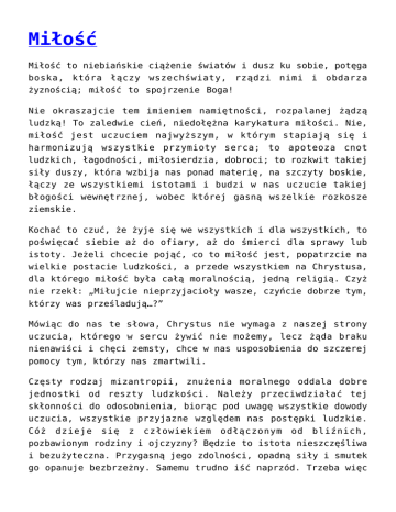 Miłość Miłość to niebiańskie ciążenie światów i dusz ku sobie, potęga boska, która łączy wszechświaty, rządzi nimi i obdarza żyznością; miłość to spojrzenie Boga! Nie okraszajcie tem imieniem namiętności, rozpalanej żądzą ludzką! To zaledwie cień, niedołężna karykatura miłości. Nie, miłość jest uczuciem najwyższym, w którym stapiają się i harmonizują wszystkie przymioty serca; to apoteoza cnot ludzkich, łagodności, miłosierdzia, dobroci; to rozkwit takiej siły duszy, która wzbija nas ponad materię, na szczyty boskie, łączy ze wszystkiemi istotami i budzi w nas uczucie takiej błogości wewnętrznej, wobec której gasną wszelkie rozkosze ziemskie. Kochać to czuć, że żyje się we wszystkich i dla wszystkich, to poświęcać siebie aż do ofiary, aż do śmierci dla sprawy lub istoty. Jeżeli chcecie pojąć, co to miłość jest, popatrzcie na wielkie postacie ludzkości, a przede wszystkiem na Chrystusa, dla którego miłość była całą moralnością, jedną religią. Czyż nie rzekł: „Miłujcie nieprzyjacioły wasze, czyńcie dobrze tym, którzy was prześladują…?” Mówiąc do nas te słowa, Chrystus nie wymaga z naszej strony uczucia, którego w sercu żywić nie możemy, lecz żąda braku nienawiści i chęci zemsty, chce w nas usposobienia do szczerej pomocy tym, którzy nas zmartwili. Częsty rodzaj mizantropii, znużenia moralnego oddala dobre jednostki od reszty ludzkości. Należy przeciwdziałać tej skłonności do odosobnienia, biorąc pod uwagę wszystkie dowody uczucia, wszystkie przyjazne względem nas postępki ludzkie. Cóż dzieje się z człowiekiem odłączonym od bliźnich, pozbawionym rodziny i ojczyzny? Będzie to istota nieszczęśliwa i bezużyteczna. Przygasną jego zdolności, opadną siły i smutek go opanuje bezbrzeżny. Samemu trudno iść naprzód. Trzeba więc żyć z ludźmi, widzieć w nich towarzyszy niezbędnych. Dobre usposobienie zdrowiem jest dla duszy. Otwórzmy serce zdrowym i silnym poruszeniom. Kochajmy, aby nas kochano! Jeśli sympatia nasza powinna ogarniać wszystko, co nas otacza, istoty, rzeczy, wszystko, co pomaga żyć, a nawet i nieznanych członków wielkiej rodziny ludzkiej, jakąż głęboką, niezmierną miłość winniśmy swoim rodzicom: ojcu, którego troskliwość podtrzymuje nasze dzieciństwo, który długo mozoli się, by wyrównać ścieżki naszego życia; matce, która nas dźwigała i karmiła, która czuwała nad pierwszymi krokami, bolała każdym naszym bólem! Jakim czułem poświęceniem otoczyć winniśmy ich starość, jak wywdzięczyć za uczucie, za wytrwałe starania! Ojczyźnie zarówno winniśmy i serce i krew swoją. Gromadzi ona i przekazuje spuściznę licznych pokoleń, które pracują i cierpią dla wytworzenia cywilizacji, z owoców której korzystamy od urodzenia. Strzeże skarbów duchowych zdobywanych przez wieki, czuwa nad ich rozwojem i jak szczodra matka rozdziela je równo między wszystkich ludzi. Cała ta święta ojcowizna, nauki, sztuki, prawa, instytucje, ład i swobody, cały ten aparat społeczny, stwarzany myślą i rękami ludzkimi, wszystko, co stanowi bogactwo,wielkość i ducha narodu jest naszą własnością. Bez ojczyzny, bez cywilizacji którą nam w spadku przekazuje, bylibyśmy dzikimi. Cokolwiek uczynimy dla niej, nigdy nie wyrównamy jej darów. Czcijmy pamięć tych, którzy czuwaniem, wysiłkami i poświęceniem przyczyniali się do zgromadzenia i powiększenia tego dziedzictwa; niech nam świętą będzie pamięć bohaterów, broniących ojczyzny w godzinie niebezpieczeństwa, tych wszystkich, którzy aż do progu śmierci głosili Prawdę, służyli sprawiedliwości i przekazali nam krwią swą okupione swobody i postęp, z jakich dziś korzystamy! Miłość głęboka jest jak morze, nieskończona jak niebiosa, ogarnia swym płomieniem wszystkie istoty. Bóg jest jej ogniskiem. Jak słońce wstaje nad wszystkim, zarówno i ogrzewa całą przyrodę, tak Miłość Boska ożywia wszystkie dusze; promienie jej, przebijając mroki naszego egoizmu, zapalają drżące światełka na dnie każdego serca ludzkiego. Wszystkie istoty stworzone są dla miłości. Drobiny życia moralnego, zarodki dobru w nich spoczywające pod ożywczem tchnieniem ogniska najwyższego rozwiną się kiedyś, rozkwitną i połączą w jednym związku miłości, w jednem braterstwie powszechnem. Kimkolwiek jesteście wy, którzy czytacie te karty, wiedzcie, że kiedyś spotkamy się wszyscy, czy w przeżyciach przyszłych na tym świecie, czy na innej planecie lub w niezmierzonościach przestrzeni, że przeznaczeniem naszem jest wspomagać się wzajemnie w tym wspólnym pochodzie ku dobru. Jak dzieci boże, członkowie wielkiej rodziny duchów z piętnem nieśmiertelności na czołach, musimy znać się nawzajem, łączyć w świętej harmonii praw i rzeczy, z dala od namiętności i kłamliwych potęg ziemskich. W oczekiwaniu tego dnia myśl moja popłynie ku tobie, o bracie mój i moja siostro, jako świadectwo słodkiej sympatii; niech wesprze cię w zwątpieniu, niech ukoi w bólu, podźwignie z upadku i niech zjednoczy się z myślą twoją, by razem błagać Ojca wspólnego o pomoc w zdobywaniu lepszej przyszłości. Źródło: Léon Denis Życie po śmierci Modlitwa według Léona Denis Modlitwa powinna być wewnętrznym wylaniem się duszy przed Bogiem, rozmową samotną, rozmyślaniem zawsze pożytecznym nieraz zbawiennym. Jest to ucieczka i schronienie najpewniejsze dla stroskanych i zrozpaczonych. W godzinach przygnębienia i rozdarcia wewnętrznego któż nie znalazł w modlitwie spokoju, otuchy i złagodzenia bólu? Między duszą cierpiącą, a potęgą wzywaną nawiązuje się tajemnica rozmowa. Dusza przedstawia swe zgryzoty i upadki, błaga o pomoc, o pobłażliwość. Wówczas z sanktuarium jej świadomości odpowiada głos tajemny, głos Tego, od którego pochodzi cała siła do walk tego świata, cały balsam, kojący nasz