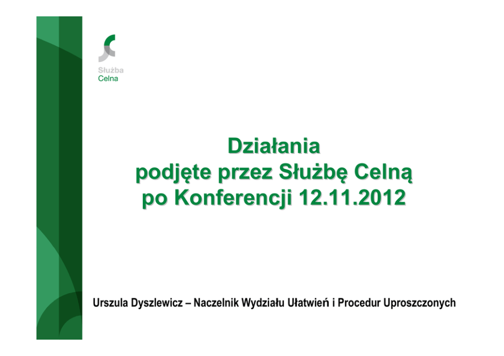 Działania podjęte przez Służbę Celną po Konferencji 12.11.2012 Urszula Dyszlewicz – Naczelnik Wydziału Ułatwień i Procedur Uproszczonych Pytania / Problemy zgłoszone przez uczestników ostatniej Konferencji Odpowiedzi na pytania / problemy zgłoszone przez przedsiębiorców podczas Konferencji 12.11.2012r. opracowane zostały w formie kolejnych fiszek i opublikowane na stronie Ministerstwa Finansów pod adresem: http://www.finanse.mf.gov.pl/pl/clo/informacje-dla-przedsiebiorcow/zglaszaneproblemy/pytania-i-odpowiedzi Zakres tematyczny opublikowanych fiszek obejmował: fiszka 32 – Procedury gospodarcze – stosowanie dokumentów celnych – arkusze informacyjne fiszka 33 – Kontrola celna – dyrektywy systemowe fiszka 34 – Kontrola celna – import paliw fiszka 35 – Kontrola celna – ułatwienia dla AEO fiszka 36 – Kontrola celna – przyczyna podejmowanych czynności kontrolnych fiszka 37 – Kontrola celna – wpływ wyników kontroli na wyznaczanie kolejnych przesyłek do kontroli fiszka 38 – Systemy informatyczne - PDR fiszka 39 – Postępowanie mandatowe w sprawach o wykroczenia skarbowe fiszka 40 – Procedury gospodarcze – pozwolenie pojedyncze – procedura uszlachetniania czynnego w systemie zawieszeń fiszka 41 – Intrastat fiszka 42 – Dług celny – rozliczenie gwarancji fiszka 43 – Procedura tranzytu-karnet TIR – numer ciągnika i numer naczepy w świetle Konwencji TIR Fiszki cały czas pozostają dostępne na stronie internetowej MF http://www.finanse.mf.gov.pl/pl/clo/informacje-dla-przedsiebiorcow/zglaszaneproblemy/pytania-i-odpowiedzi Pytania / Problemy zgłoszone przez uczestników ostatniej Konferencji Zakres tematyczny opublikowanych fiszek obejmował: fiszka 44 – Procedura tranzytu-karnet TIR-przywóz i wywóz poza godzinami pracy organu celnego fiszka 45 – Procedura tranzytu-karnet TIR-system NCTS a obsługa w procedurze uproszczonej fiszka 46 – Procedura tranzytu-karnet TIR-procedura uproszczona fiszka 47 – Procedura tranzytu-karnet TIR-ewidencje w procedurze uproszczonej fiszka 48 – Procedura tranzytu-karnet TIR-ułatwienia w procedurze uproszczonej fiszka 49 – Procedura wywozu a procedura TIR fiszka 50 – Procedura tranzytu-procedura uproszczona fiszka 51 – Procedura tranzytu-alternatywne zamykanie dokumentu T1 fiszka 52 – Procedura tranzytu-uproszczenia. Czy można zmienić zasady wydawania pozwoleń na zamykanie procedury tranzytu przez upoważnionego odbiorcę w taki sposób, aby pozwolenia te korelowały z pozwoleniami na procedurę dopuszczenia do obrotu, ze zwolnieniem z obowiązku przesyłania powiadomień fiszka 53 – Procedura tranzytu – integracja systemów NCTS i CELINA fiszka 54 – Procedura tranzytu - uproszczenia fiszka 55 – Procedura uproszczona-przedstawicielstwo w procedurach uproszczonych fiszka 56 – Dokumentowanie pochodzenia towarów-legalizacja ”In blanco” fiszka 57 – Dokumentowanie pochodzenia towarów – świadectwa pochodzenia bez preferencji fiszka 58 – Dokumentowanie pochodzenia towarów Fiszki cały czas pozostają dostępne na stronie internetowej MF http://www.finanse.mf.gov.pl/pl/clo/informacje-dla-przedsiebiorcow/zglaszaneproblemy/pytania-i-odpowiedzi Pytania / Problemy zgłoszone przez uczestników ostatniej Konferencji Zakres tematyczny opublikowanych fiszek obejmował: fiszka 59 – Dokumentowanie pochodzenia towarów-planowane uproszczenia fiszka 60 – Dokumentowanie pochodzenia towarów - certyfikacja fiszka 61 – Zgłoszenie celne-towary strategiczne fiszka 62 – Urzędowe sprawdzanie a AEO, procedury uproszczone fiszka 63 – Wartość celna – koszty transportu fiszka 64 – Wiążąca Informacja Taryfowa (WIT) – posiadanie statusu AEO fiszka 65 – Wiążąca Informacja Taryfowa (WIT) – czas załatwiania sprawy fiszka 66 – Kontrola celna – zamknięcia urzędowe nakładane przez AEO fiszka 67 – Kontrola celna – zamknięcia urzędowe-ułatwienia fiszka 68 – Kontrola celna – zamknięcia celne – możliwość wykorzystania w charakterze zamknięć urzędowych innych zamknięć fiszka 69 – Kontrola celna-zamknięcia urzędowe-ułatwienia dla AEO fiszka 70 – Zgłoszenia celne–zgłoszenia elektroniczne fiszka 71 – Zgłoszenia celne–składanie zgłoszeń przed zamknięciem procedury tranzytu fiszka 72 – Zgłoszenia celne-zgłoszenia elektroniczne-konieczność osobistego stawiennictwa zgłaszającego w urzędzie celnym w przypadku dokonywania elektronicznych zgłoszeń celnych. fiszka 73 – Karnet TIR – uproszczenia - odpowiedzialność w ramach przedstawicielstwa pośredniego fiszka 74 – Procedura tranzytu-Karnet TIR – sprawdzenie przez przedstawiciela wiarygodności posiadacza karnetu TIR fiszka 75 – Procedura tranzytu-Karnet TIR – obsługa w systemie NCTS Pytania / Problemy zgłoszone przez uczestników ostatniej Konferencji Zakres tematyczny opublikowanych fiszek obejmował: fiszka 76 – Procedura tranzytu – procedura awaryjna dotycząca NCTS fiszka 77 – Procedura tranzytu-karnet TIR-towar przemieszczający się za dokumentem ADT fiszka 78 – Magazyn czasowego składowania fiszka 79 – Dokumentowanie pochodzenia towarów – procedura wydawania A.TR. fiszka 80 – Dokumentowanie pochodzenia towarów – odstąpienie od wymogu składania dokumentów potwierdzających pochodzenie towarów fiszka 81 – Dokumentowanie pochodzenia towarów – przesłanki wystawiania niepreferencyjnych dowodów pochodzenia w procedurze „in blanco” fiszka 82 – Wartość celna – ustalanie wartości celnej w przypadku, gdy stwierdzono brak części przesyłki przed zgłoszeniem towaru do procedury celnej fiszka 83 – Procedura uproszczona – zgłoszenie uzupełniające odnoszące się do towarów obejmowanych procedurą składu celnego fiszka 84 – Zgłoszenie celne – zdublowane zgłoszenie celne w systemie elektronicznym w odniesieniu do tych samych zwolnionych do procedury towarów Fiszki cały czas pozostają dostępne n