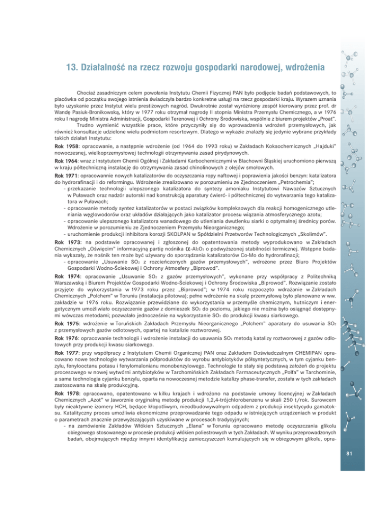 13. Działalność na rzecz rozwoju gospodarki narodowej, wdrożenia Chocia¿ zasadniczym celem powo³ania Instytutu Chemii Fizycznej PAN by³o podjêcie badañ podstawowych, to placówka od pocz¹tku swojego istnienia œwiadczy³a bardzo konkretne us³ugi na rzecz gospodarki kraju. Wyrazem uznania by³o uzyskanie przez Instytut wielu presti¿owych nagród. Dwukrotnie zosta³ wyró¿niony zespó³ kierowany przez prof. dr Wandê Pasiuk-Bronikowsk¹, który w 1977 roku otrzyma³ nagrodê II stopnia Ministra Przemys³u Chemicznego, a w 1976 roku I nagrodê Ministra Administracji, Gospodarki Terenowej i Ochrony Œrodowiska, wspólnie z biurem projektów „Proat”. Trudno wymieniæ wszystkie prace, które przyczyni³y siê do wprowadzenia wdro¿eñ przemys³owych, jak równie¿ konsultacje udzielone wielu podmiotom resortowym. Dlatego w wykazie znalaz³y siê jedynie wybrane przyk³ady takich dzia³añ Instytutu: Rok 1958: opracowanie, a nastêpnie wdro¿enie (od 1964 do 1993 roku) w Zak³adach Koksochemicznych „Hajduki” nowoczesnej, wielkoprzemys³owej technologii otrzymywania zasad pirydynowych. Rok 1964: wraz z Instytutem Chemii Ogólnej i Zak³adami Karbochemicznymi w Blachowni Œl¹skiej uruchomiono pierwsz¹ w kraju pó³techniczn¹ instalacjê do otrzymywania zasad chinolinowych z olejów smo³owych. Rok 1971: opracowannie nowych katalizatorów do oczyszczania ropy naftowej i poprawienia jakoœci benzyn: katalizatora do hydrorafinacji i do reformingu. Wdro¿enie zrealizowano w porozumieniu ze Zjednoczeniem „Petrochemia”; - przekazanie technologii ulepszonego katalizatora do syntezy amoniaku Instytutowi Nawozów Sztucznych w Pu³awach oraz nadzór autorski nad konstrukcj¹ aparatury æwieræ- i pó³technicznej do wytwarzania tego katalizatora w Pu³awach; - opracowanie metody syntez katalizatorów w postaci zwi¹zków kompleksowych dla reakcji homogenicznego utleniania wêglowodorów oraz uk³adów dzia³aj¹cych jako katalizator procesu wi¹zania atmosferycznego azotu; - opracowanie ulepszonego katalizatora wanadowego do utleniania dwutlenku siarki o optymalnej œrednicy porów. Wdro¿enie w porozumieniu ze Zjednoczeniem Przemys³u Nieorganicznego; - uruchomienie produkcji inhibitora korozji SKOLPAN w Spó³dzielni Przetworów Technologicznych „Skolimów”. Rok 1973: na podstawie opracowanej i zg³oszonej do opatentowania metody wyprodukowano w Zak³adach Chemicznych „Oœwiêcim” informacyjn¹ partiê noœnika -Al2O3 o podwy¿szonej stabilnoœci termicznej. Wstêpne badania wykaza³y, ¿e noœnik ten mo¿e byæ u¿ywany do sporz¹dzania katalizatorów Co-Mo do hydrorafinacji; - opracowanie „Usuwanie SO2 z rozcieñczonych gazów przemys³owych”, wdro¿one przez Biuro Projektów Gospodarki Wodno-Œciekowej i Ochrony Atmosfery „Biprowod”. Rok 1974: opracowanie „Usuwanie SO2 z gazów przemys³owych”, wykonane przy wspó³pracy z Politechnik¹ Warszawsk¹ i Biurem Projektów Gospodarki Wodno-Œciekowej i Ochrony Œrodowiska „Biprowod”. Rozwi¹zanie zosta³o przyjête do wykorzystania w 1973 roku przez „Biprowod”; w 1974 roku rozpoczêto wdra¿anie w Zak³adach Chemicznych „Polchem” w Toruniu (instalacja pilotowa); pe³ne wdro¿enie na skalê przemys³ow¹ by³o planowane w ww. zak³adzie w 1976 roku. Rozwi¹zanie przewidziane do wykorzystania w przemyœle chemicznym, hutniczym i energetycznym umo¿liwia³o oczyszczenie gazów z domieszek SO2 do poziomu, jakiego nie mo¿na by³o osi¹gn¹æ dostêpnymi wówczas metodami; pozwala³o jednoczeœnie na wykorzystanie SO2 do produkcji kwasu siarkowego. Rok 1975: wdro¿enie w Toruñskich Zak³adach Przemys³u Nieorganicznego „Polchem” aparatury do usuwania SO2 z przemys³owych gazów odlotowych, opartej na katalizie roztworowej. Rok 1976: opracowanie technologii i wdro¿enie instalacji do usuwania SO2 metod¹ katalizy roztworowej z gazów odlotowych przy produkcji kwasu siarkowego. Rok 1977: przy wspó³pracy z Instytutem Chemii Organicznej PAN oraz Zak³adem Doœwiadczalnym CHEMIPAN opracowano nowe technologie wytwarzania pó³produktów do wyrobu antybiotyków pó³syntetycznych, w tym cyjanku benzylu, fenylooctanu potasu i fenylomalonianu monobenzylowego. Technologie te sta³y siê podstaw¹ za³o¿eñ do projektu procesowego w nowej wytwórni antybiotyków w Tarchomiñskich Zak³adach Farmaceutycznych „Polfa” w Tarchominie, a sama technologia cyjanku benzylu, oparta na nowoczesnej metodzie katalizy phase-transfer, zosta³a w tych zak³adach zastosowana na skalê produkcyjn¹. Rok 1978: opracowano, opatentowano w kilku krajach i wdro¿ono na podstawie umowy licencyjnej w Zak³adach Chemicznych „Azot” w Jaworznie oryginaln¹ metodê produkcji 1,2,4-trójchlorobenzenu w skali 250 t/rok. Surowcem by³y nieaktywne izomery HCH, bêd¹ce k³opotliwym, nieodbudowywalnym odpadem z produkcji insektycydu gamatoksu. Katalityczny proces umo¿liwia ekonomiczne przeprowadzanie tego odpadu w istniej¹cych urz¹dzeniach w produkt o parametrach znacznie przewy¿szaj¹cych uzyskiwane w procesach tradycyjnych; - na zamówienie Zak³adów W³ókien Sztucznych „Elana” w Toruniu opracowano metodê oczyszczania glikolu obiegowego stosowanego w procesie produkcji w³ókien poliestrowych w tych Zak³adach. W wyniku przeprowadzonych badañ, obejmuj¹cych miêdzy innymi identyfikacjê zanieczyszczeñ kumuluj¹cych siê w obiegowym glikolu, opra81 cowano technologiê oczyszczania glikolu umo¿liwiaj¹c¹ istotn¹ poprawê jakoœci poliestru. Technologia ta zosta³a wdro¿ona w ZWS „Elana”, przynosz¹c tam wymierne efekty ekonomiczne. Rok 1979: opracowana we wspó³pracy z BP „Proat” metoda usuwania SO2 z gazów odlotowych w fabrykach kwasu siarkowego zosta³a wykorzystana w Zak³adach Chemicznych „Polchem” w Toruniu. Rok 1983: wykonano zmodernizowany chromatograf cieczowy typ 302. Wdro¿ono jego produkcjê w PPDRP TECHMAROBOT w Warszawie; - zaprojektowano kolumny chromatograficzne do chromatografów cie