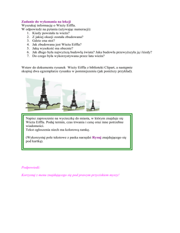 Zadanie do wykonania na lekcji Wyszukaj informację o Wieży Eiffla. W odpowiedz na pytania (używając numeracji): 1. Kiedy powstała ta wieża? 2. Z jakiej okazji została zbudowana? 3. Gdzie ona stoi? 4. Jak zbudowana jest Wieża Eiffla? 5. Jaką wysokość ma obecnie? 6. Jak długo była najwyższą budowlą świata? Jaka budowla przewyższyła ją i kiedy? 7. Do czego była wykorzystywana przez lata wieża? Wstaw do dokumentu rysunek Wieży Eiffla z biblioteki Clipart, a następnie skopiuj dwa egzemplarze rysunku w pomniejszeniu (jak poniższy przykład). Napisz zaproszenie na wycieczkę do miasta, w którym znajduje się Wieża Eiffla. Podaj termin, czas trwania i cenę oraz inne potrzebne wiadomości. Tekst ogłoszenia niech ma kolorową ramkę. (Wykorzystaj pole tekstowe z paska narzędzi Rysuj znajdującego się pod kartką). Podpowiedź: Korzystaj z menu znajdującego się pod prawym przyciskiem myszy!