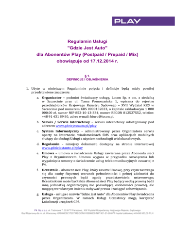 Regulamin Usługi "Gdzie Jest Auto" dla Abonentów Play (Postpaid / Prepaid / Mix) obowiązuje od 17.12.2014 r. § 1. DEFINICJE I OBJAŚNIENIA 1. Użyte w niniejszym Regulaminie pojęcia i definicje będą miały poniżej przedstawione znaczenie: a. Organizator – podmiot świadczący usługę, Locon Sp. z o.o. z siedzibą w Szczecinie przy ul. Tama Pomorzańska 1, wpisana do rejestru przedsiębiorców Krajowego Rejestru Sądowego – XVII Wydział KRS w Szczecinie pod numerem KRS 0000132823, o kapitale zakładowym 1 000 000,00 zł, numer NIP 852-10-13-334, numer REGON 812527552, telefon: +48 91 431 89 80, adres e-mail: [email protected]. b. Serwis / Serwis Internetowy – serwis internetowy udostępniony pod adresem www.gdziejestauto.pl/play c. System Informatyczny – administrowany przez Organizatora serwis oparty na Internecie, wiadomościach SMS oraz aplikacjach mobilnych służący do obsługi Usługi z użyciem technologii wielokanałowych. d. Regulamin – niniejszy dokument, dostępny na stronie internetowej www.gdziejestauto.pl/play e. Umowa – umowa o świadczenie Usługi zawierana przez Abonenta sieci Play z Organizatorem. Umowa wygasa w przypadku rozwiązania lub wygaśnięcia umowy o świadczenie usług telekomunikacyjnych zawartej z P4. f. Uczestnik – Abonent sieci Play, który zawrze Umowę, przy czym zastrzega się dla osoby fizycznej warunek pełnoletniości i pełnej zdolności do czynności prawnych bądź zgodę przedstawiciela ustawowego; Uczestnikiem może być także Abonent sieci Play będący osobą prawną bądź inną jednostką organizacyjną nie posiadającą osobowości prawnej, ale mogącą we własnym imieniu nabywać prawa i zaciągać zobowiązania. g. Usługa – usługa o nazwie "Gdzie Jest Auto" dla Abonentów Play świadczona przez Organizatora. W ramach Usługi Uczestnicy mogą korzystać Lokalizacji urządzeń GPS. P4 Sp. z o.o. ul. Taśmowa 7, 02-677 Warszawa, XIII Wydział Gospodarczy Krajowego Rejestru Sądowego Sąd Rejonowy dla m. st. Warszawy KRS 0000217207 REGON 015808609 NIP 951-21-20-077 Kapitał zakładowy 48 456 500,00 PLN h. Abonent Play / Abonent – osoba będąca stroną umowy o świadczenie usług telekomunikacyjnych zawartej z P4 w ramach oferty abonamentowej (postpaid), na kartę (prepaid) lub Mix w sieci Play. i. Przychodzący SMS specjalny - wiadomość SMS potwierdzającą uzyskanie lub przedłużenie dostępu do Usługi wysyłana z numerów 60404, 60804, 61204, 61604 w Sieci Telekomunikacyjnej P4. Naliczenie opłaty za przesłaną wiadomość SMS nastąpi po doręczeniu wiadomości na telefon Uczestnika. j. Aplikacja mobilna / Aplikacja monitorująca - oprogramowanie stworzone przez Organizatora i udostępniane Uczestnikowi umożliwiające korzystanie z opcji Lokalizacji urządzenia GPS, przeznaczone do instalacji w pamięci telefonu komórkowego. k. Urządzenie GPS – urządzenie z odbiornikiem GPS oraz preinstalowaną kartą SIM podłączone przez Uczestnika do Gniazda OBDII w pojeździe. l. Gniazdo OBDII – gniazdo stosowane w motoryzacji do diagnostyki pojazdów. OBD to skrót od angielskiego wyrażenia On-Board Diagnostic. Urządzenie GPS stosowane w Usłudze wykorzystuje gniazdo diagnostyczne jedynie do zasilania urządzenia. m. Lokalizacja urządzenia GPS – system lokalizacji Urządzenia GPS dodanego do Usługi, polegający na weryfikacji położenia geograficznego dokonywanej w odpowiedzi na zapytanie Uczestnika (Lokalizacja na żądanie) lub Automatycznego planu ustawionego przez Uczestnika (Lokalizacja automatyczna) w tym Alarmu strażnika oraz Alarmu prędkości oparty o Lokalizację GPS oraz Lokalizację LBS; zasady lokalizacji zostały opisane w Regulaminie w § 6 Zasady lokalizacji. n. Lokalizacja GPS – lokalizacja kart SIM umieszczonych w Urządzeniach GPS na podstawie danych z odbiornika GPS. o. Lokalizacja LBS – lokalizacja kart SIM mieszczonych w Urządzeniach GPS w oparciu o infrastrukturę GSM. p. Alarm strażnika – możliwość zapisania informacji o tym, że Urządzenie GPS umieszone w pojeździe zaczęło się przemieszczać lub zostało wprawione w drgania, które dodatkowo notyfikuje o tym fakcie Uczestnika usługi przez SMS oraz email. q. Alarm prędkości – możliwość uzyskiwania informacji o tym, że Urządzenie GPS umieszone w pojeździe przekracza ustaloną przez Uczestnika prędkość, które dodatkowo notyfikuje o tym fakcie Uczestnika usługi przez SMS oraz email. r. Udostępnianie lokalizacji – możliwość przesłania lokalizacji Urządzenia GPS poprzez wiadomość email lub SMS na określony przez Uczestnika usługi numer telefonu lub adres poczty elektronicznej. P4 Sp. z o.o. ul. Taśmowa 7, 02-677 Warszawa, XIII Wydział Gospodarczy Krajowego Rejestru Sądowego Sąd Rejonowy dla m. st. Warszawy KRS 0000217207 REGON 015808609 NIP 951-21-20-077 Kapitał zakładowy 48 456 500,00 PLN s. Konto Uczestnika - konto punktowe Uczestnika służące do korzystania z Usługi; Konto Uczestnika zasilane jest automatycznie z chwilą otrzymania przez Uczestnika Przychodzącego SMS-a specjalnego zgodnie z § 3 ust. 9; Uczestnik może sam zasilić Konto Uczestnika poprzez wysyłanie wiadomości SMS Premium, o których mowa w § 3 ust. 14. Lokalizacja na żądanie zmniejsza stan Konta Uczestnika i jest uzależnione od dysponowania przez Uczestnika na Koncie Uczestnika wystarczającą liczbą lokalizacji (Wartością Konta Uczestnika Usługi). Liczby punktów na Koncie Uczestnika nie pomniejsza Lokalizacja automatyczna z Alarmu strażnika oraz Alarmu prędkości. t. Transmisja Danych - standard oraz technologia przekazywania pakietów danych wykorzystywana w sieciach telefonii komórkowej do pakietowego przesyłania danych. u. Dane Cyfrowe - informacje zawarte w Systemie Informatycznym. v. GPS (Global Positioning System) - światowy system nawigacji satelitarnej. w. SMS (Short Message Service) - system krótkich wiadomości tekstowych. x. MSISDN - unikalny numer telefonu Abonenta (numer Ab