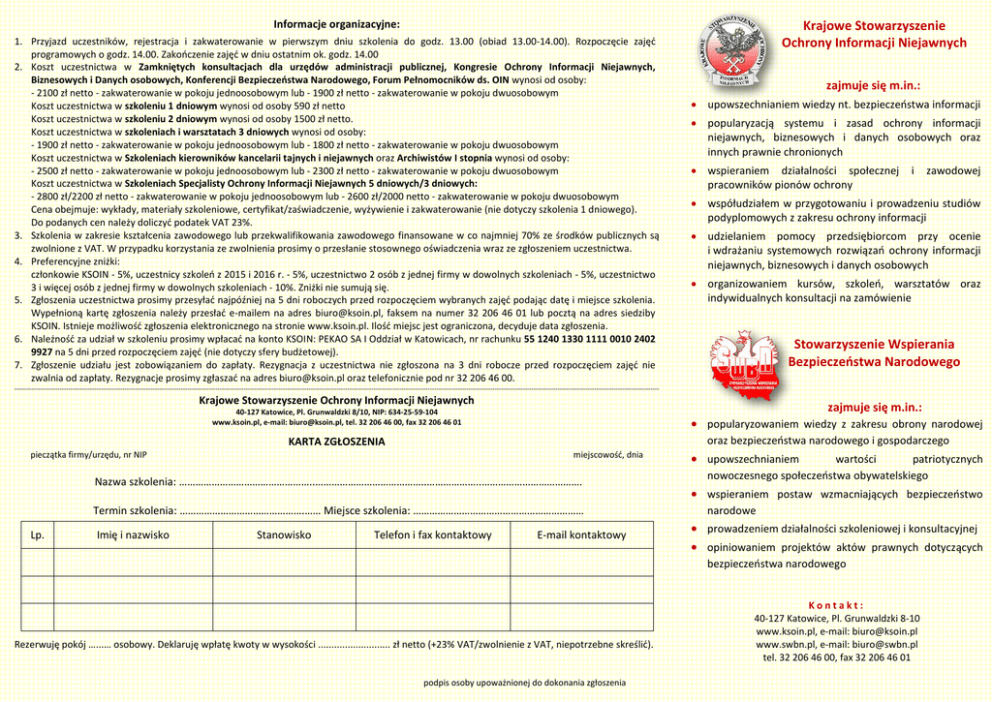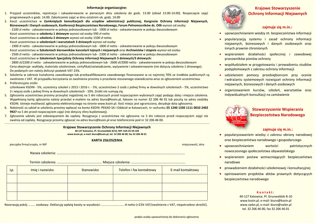 Informacje organizacyjne: 1. Przyjazd uczestników, rejestracja i zakwaterowanie w pierwszym dniu szkolenia do godz. 13.00 (obiad 13.00-14.00). Rozpoczęcie zajęć programowych o godz. 14.00. Zakończenie zajęć w dniu ostatnim ok. godz. 14.00 2. Koszt uczestnictwa w Zamkniętych konsultacjach dla urzędów administracji publicznej, Kongresie Ochrony Informacji Niejawnych, Biznesowych i Danych osobowych, Konferencji Bezpieczeństwa Narodowego, Forum Pełnomocników ds. OIN wynosi od osoby: - 2100 zł netto - zakwaterowanie w pokoju jednoosobowym lub - 1900 zł netto - zakwaterowanie w pokoju dwuosobowym Koszt uczestnictwa w szkoleniu 1 dniowym wynosi od osoby 590 zł netto Koszt uczestnictwa w szkoleniu 2 dniowym wynosi od osoby 1500 zł netto. Koszt uczestnictwa w szkoleniach i warsztatach 3 dniowych wynosi od osoby: - 1900 zł netto - zakwaterowanie w pokoju jednoosobowym lub - 1800 zł netto - zakwaterowanie w pokoju dwuosobowym Koszt uczestnictwa w Szkoleniach kierowników kancelarii tajnych i niejawnych oraz Archiwistów I stopnia wynosi od osoby: - 2500 zł netto - zakwaterowanie w pokoju jednoosobowym lub - 2300 zł netto - zakwaterowanie w pokoju dwuosobowym Koszt uczestnictwa w Szkoleniach Specjalisty Ochrony Informacji Niejawnych 5 dniowych/3 dniowych: - 2800 zł/2200 zł netto - zakwaterowanie w pokoju jednoosobowym lub - 2600 zł/2000 netto - zakwaterowanie w pokoju dwuosobowym Cena obejmuje: wykłady, materiały szkoleniowe, certyfikat/zaświadczenie, wyżywienie i zakwaterowanie (nie dotyczy szkolenia 1 dniowego). Do podanych cen należy doliczyć podatek VAT 23%. 3. Szkolenia w zakresie kształcenia zawodowego lub przekwalifikowania zawodowego finansowane w co najmniej 70% ze środków publicznych są zwolnione z VAT. W przypadku korzystania ze zwolnienia prosimy o przesłanie stosownego oświadczenia wraz ze zgłoszeniem uczestnictwa. 4. Preferencyjne zniżki: członkowie KSOIN - 5%, uczestnicy szkoleń z 2015 i 2016 r. - 5%, uczestnictwo 2 osób z jednej firmy w dowolnych szkoleniach - 5%, uczestnictwo 3 i więcej osób z jednej firmy w dowolnych szkoleniach - 10%. Zniżki nie sumują się. 5. Zgłoszenia uczestnictwa prosimy przesyłać najpóźniej na 5 dni roboczych przed rozpoczęciem wybranych zajęć podając datę i miejsce szkolenia. Wypełnioną kartę zgłoszenia należy przesłać e-mailem na adres [email protected], faksem na numer 32 206 46 01 lub pocztą na adres siedziby KSOIN. Istnieje możliwość zgłoszenia elektronicznego na stronie www.ksoin.pl. Ilość miejsc jest ograniczona, decyduje data zgłoszenia. 6. Należność za udział w szkoleniu prosimy wpłacać na konto KSOIN: PEKAO SA I Oddział w Katowicach, nr rachunku 55 1240 1330 1111 0010 2402 9927 na 5 dni przed rozpoczęciem zajęć (nie dotyczy sfery budżetowej). 7. Zgłoszenie udziału jest zobowiązaniem do zapłaty. Rezygnacja z uczestnictwa nie zgłoszona na 3 dni robocze przed rozpoczęciem zajęć nie zwalnia od zapłaty. Rezygnacje prosimy zgłaszać na adres [email protected] oraz telefonicznie pod nr 32 206 46 00. Krajowe Stowarzyszenie Ochrony Informacji Niejawnych zajmuje się m.in.: upowszechnianiem wiedzy nt. bezpieczeństwa informacji popularyzacją systemu i zasad ochrony informacji niejawnych, biznesowych i danych osobowych oraz innych prawnie chronionych wspieraniem działalności społecznej pracowników pionów ochrony i zawodowej współudziałem w przygotowaniu i prowadzeniu studiów podyplomowych z zakresu ochrony informacji udzielaniem pomocy przedsiębiorcom przy ocenie i wdrażaniu systemowych rozwiązań ochrony informacji niejawnych, biznesowych i danych osobowych organizowaniem kursów, szkoleń, warsztatów oraz indywidualnych konsultacji na zamówienie Stowarzyszenie Wspierania Bezpieczeństwa Narodowego ---------------------------------------------------------------------------------------------------------------------------------------------------------------------------------------------------------------------------------------------------------------------------------------------------------- Krajowe Stowarzyszenie Ochrony Informacji Niejawnych zajmuje się m.in.: popularyzowaniem wiedzy z zakresu obrony narodowej 40-127 Katowice, Pl. Grunwaldzki 8/10, NIP: 634-25-59-104 www.ksoin.pl, e-mail: [email protected], tel. 32 206 46 00, fax 32 206 46 01 oraz bezpieczeństwa narodowego i gospodarczego KARTA ZGŁOSZENIA pieczątka firmy/urzędu, nr NIP miejscowość, dnia Nazwa szkolenia: …………………………………………..…………………………………..………………..………………………………. Termin szkolenia: ……………………………………….…… Miejsce szkolenia: ……………………………………………………… Lp. Imię i nazwisko Stanowisko Telefon i fax kontaktowy E-mail kontaktowy upowszechnianiem wartości patriotycznych nowoczesnego społeczeństwa obywatelskiego wspieraniem postaw wzmacniających bezpieczeństwo narodowe prowadzeniem działalności szkoleniowej i konsultacyjnej opiniowaniem projektów aktów prawnych dotyczących bezpieczeństwa narodowego Rezerwuję pokój …...… osobowy. Deklaruję wpłatę kwoty w wysokości ........................... zł netto (+23% VAT/zwolnienie z VAT, niepotrzebne skreślić). podpis osoby upoważnionej do dokonania zgłoszenia Kontakt: 40-127 Katowice, Pl. Grunwaldzki 8-10 www.ksoin.pl, e-mail: [email protected] www.swbn.pl, e-mail: [email protected] tel. 32 206 46 00, fax 32 206 46 01 Oferta szkoleniowa: Specjalna oferta skierowana do kadry kierowniczej urzędów administracji publicznej Zamknięte dedykowane konsultacje nt. zagrożeń bezpieczeństwa, ochrony informacji i danych osobowych 20-22 kwietnia 2016 r. Zamek w Pułtusku XII Kongres Ochrony Informacji Niejawnych, Biznesowych i Danych Osobowych 30 maja-1 czerwca 2016 r. Szklarska Poręba Konferencja Bezpieczeństwa Narodowego 21-23 września 2016 r. Zakopane Forum Kierowników J