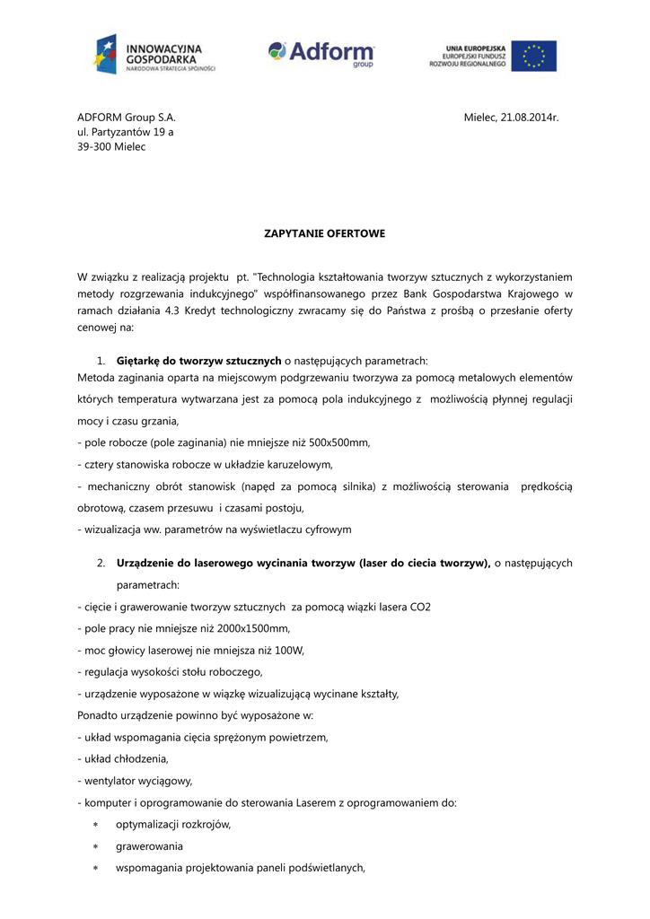 ADFORM Group S.A. ul. Partyzantów 19 a 39-300 Mielec Mielec, 21.08.2014r. ZAPYTANIE OFERTOWE W związku z realizacją projektu pt. "Technologia kształtowania tworzyw sztucznych z wykorzystaniem metody rozgrzewania indukcyjnego" współfinansowanego przez Bank Gospodarstwa Krajowego w ramach działania 4.3 Kredyt technologiczny zwracamy się do Państwa z prośbą o przesłanie oferty cenowej na: 1. Giętarkę do tworzyw sztucznych o następujących parametrach: Metoda zaginania oparta na miejscowym podgrzewaniu tworzywa za pomocą metalowych elementów których temperatura wytwarzana jest za pomocą pola indukcyjnego z możliwością płynnej regulacji mocy i czasu grzania, - pole robocze (pole zaginania) nie mniejsze niż 500x500mm, - cztery stanowiska robocze w układzie karuzelowym, - mechaniczny obrót stanowisk (napęd za pomocą silnika) z możliwością sterowania prędkością obrotową, czasem przesuwu i czasami postoju, - wizualizacja ww. parametrów na wyświetlaczu cyfrowym 2. Urządzenie do laserowego wycinania tworzyw (laser do ciecia tworzyw), o następujących parametrach: - cięcie i grawerowanie tworzyw sztucznych za pomocą wiązki lasera CO2 - pole pracy nie mniejsze niż 2000x1500mm, - moc głowicy laserowej nie mniejsza niż 100W, - regulacja wysokości stołu roboczego, - urządzenie wyposażone w wiązkę wizualizującą wycinane kształty, Ponadto urządzenie powinno być wyposażone w: - układ wspomagania cięcia sprężonym powietrzem, - układ chłodzenia, - wentylator wyciągowy, - komputer i oprogramowanie do sterowania Laserem z oprogramowaniem do: ∗ optymalizacji rozkrojów, ∗ grawerowania ∗ wspomagania projektowania paneli podświetlanych, Urządzenie powinno obsługiwać następujące rodzaje plików: - pliki wektorowe: .dxf .plt .ai , - pliki rastrowe: .bmp 3. Maszynę do sitodruku o następujących parametrach:: -maszyna do sitodruku ¾ automat, -wymiar stołu drukującego nie mniejszy niż 100cm x 130 cm, Urządzenie wyposażone powinno być w: - pneumatyczne mocowanie sita, - pneumatyczne mocowanie rakli, - system zapobiegający skraplaniu farby na zestawie drukującym W skład zestawu powinno wchodzić urządzenie do: - automatycznego odbierania materiałów wydrukowanych, - suszenia za pomocą lampy UV o mocy nie mniejszej niż 300W, 4. Piłę do formatowania tworzyw o następujących parametrach: : -pole robocze (pole cięcia) nie mniejsze niż 2000x4000 [mm] -możliwość cięcia materiałów nie mniej niż 50 mm -średnica tarczy tnącej - 250 mm, -moc silnika - 4,0 kW, -pionowe umieszczenie materiału ciętego, -system pomiaru poziomego i pionowego, -system odpylający, -stanowisko komputerowe wraz z oprogramowaniem do optymalizacji rozkrojów. 5. Termoformiarkę (maszyna do termoformowania) o następujących parametrach: : - możliwość formowania materiałów o powierzchni nie mniejszej niż 1000x1000 mm, - grubość tłoczonych materiałów nie mniejsza niż 15 mm, - głębokość tłoczenia nie mniejsza niż 500 mm, - wydzielanie stref grzania na co najmniej dwie strefy, - dzielenie powierzchni formowania na mniejsze obszary, - możliwość wstępnego rozdmuchu formowanego materiału, - chłodzenie materiału tłoczonego powietrzem, Pełne sterowanie parametrami urządzania: czas grzania, moc grzania poszczególnymi grzałkami, czas formowania, czas rozdmuchu, Urządzenie powinno mieć możliwość pracy w trybie automatycznym oraz ręcznym. Oferta powinny zawierać: a. Nazwę adresata oferty: ADFORM Group S.A. ul. Partyzantów 19 a, 39-300 Mielec. b. Pełną nazwę firmy wraz z koniecznymi informacjami (adres, numer telefonu). c. Datę złożenia oferty. d. Cena oferty przedstawiona jako kwota netto oraz kwota brutto wyliczoną lub zawierającą informację o podatku VAT. e. Czas realizacji zamówienia. f. Sposób i termin płatności. g. Warunki dostawy. h. Ważność oferty. Oferty prosimy składać do dnia: 26.08.2014r. Oferta wraz z powyższymi informacjami powinna być przesłana faksem pod numer 17 773 82 01, mailem na adres [email protected], listownie lub osobiście na adres ul. Partyzantów 19a, 39-300 Mielec. Oferta może zawierać dodatkowe załączniki w postaci folderów i informacji technicznych. Kryterium wyboru oferty - 100% cena Zleceniodawca zastrzega sobie prawo do odrzucenia oferty bez podania przyczyny, w przypadku ofert odrzuconych Zleceniodawca nie ma obowiązku informowania o przyczynach odrzucenia. W przypadku wybrania najkorzystniejszej oferty Oferent zostanie niezwłocznie o tym fakcie poinformowany, a w przypadku niewywiązania się z niej, rozpatrzona zostanie kolejna najbardziej korzystna. Z poważaniem Zarząd Adform Group SA