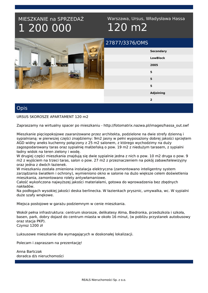 MIESZKANIE na SPRZEDAŻ 1 200 000 Warszawa, Ursus, Władysława Hassa 120 m2 27877/3376/OMS Secondary LowBlock 2005 5 5 5 Adjoining 2 Opis URSUS SKOROSZE APARTAMENT 120 m2 Zapraszamy na wirtualny spacer po mieszkaniu - http://fotomatrix.nazwa.pl/images/hassa_out.swf Mieszkanie pięciopokojowe zaaranżowane przez architekta, podzielone na dwie strefy dzienną i sypialnianą: w pierwszej części znajdziemy: 9m2 jasny w pełni wyposażony dobrej jakości sprzętem AGD widny aneks kuchenny połączony z 25 m2 salonem, z którego wychodzimy na duży zagospodarowany taras oraz sypialnię małżeńską o pow. 19 m2 z niedużym tarasem, z sypialni ładny widok na teren zielony i wodę. W drugiej części mieszkania znajdują się dwie sypialnie jedna z nich o pow. 10 m2 druga o pow. 9 m2 z wyjściem na trzeci taras, salon o pow. 27 m2 z przeznaczeniem na pokój zabaw/telewizyjny oraz jedna z dwóch łazienek. W mieszkaniu została zmieniona instalacja elektryczna (zamontowano inteligentny system zarządzania światłem i ochrony), wymieniono okno w salonie na dużo większe celem doświetlenia mieszkania, zamontowano rolety antywłamaniowe. Całość wykończona najwyższej jakości materiałami, gotowa do wprowadzenia bez zbędnych nakładów. Na podłogach wysokiej jakości deska berlinecka. W łazienkach prysznic, umywalka, wc. W sypialni duże szafy wnękowe. Miejsca postojowe w garażu podziemnym w cenie mieszkania. Wokół pełna infrastruktura: centrum skorosze, delikatesy Alma, Biedronka, przedszkola i szkoła, basen, park, dobry dojazd do centrum miasta w około 16 minut, (w pobliżu przystanek autobusowy oraz stacja PKP). Czynsz 1200 zł Luksusowe mieszkanie dla wymagających w doskonałej lokalizacji. Polecam i zapraszam na prezentację! Anna Bartczak doradca d/s nieruchomości REALS Nieruchomości Sp. z o.o. Oddział Anna Bartczak tel. 534 888 821 tel. 22 829 92 10 email: [email protected] REALS Nieruchomości Sp. z o.o. Powered by TCPDF (www.tcpdf.org)