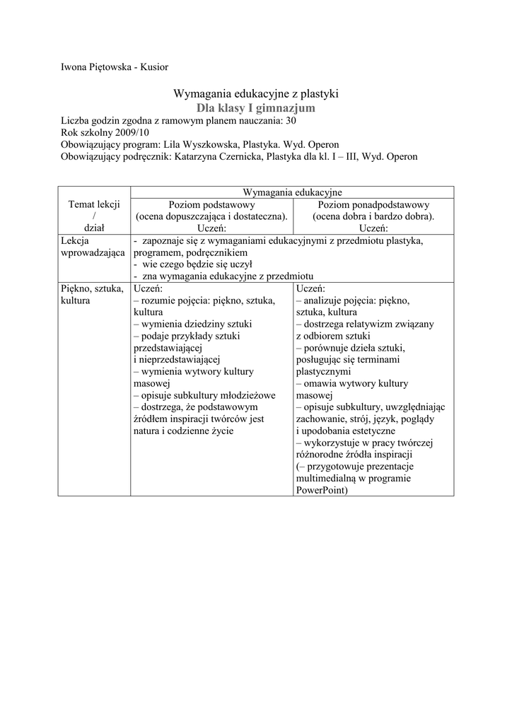 Iwona Piętowska - Kusior Wymagania edukacyjne z plastyki Dla klasy I gimnazjum Liczba godzin zgodna z ramowym planem nauczania: 30 Rok szkolny 2009/10 Obowiązujący program: Lila Wyszkowska, Plastyka. Wyd. Operon Obowiązujący podręcznik: Katarzyna Czernicka, Plastyka dla kl. I – III, Wyd. Operon Wymagania edukacyjne Temat lekcji Poziom podstawowy Poziom ponadpodstawowy / (ocena dopuszczająca i dostateczna). (ocena dobra i bardzo dobra). dział Uczeń: Uczeń: Lekcja - zapoznaje się z wymaganiami edukacyjnymi z przedmiotu plastyka, wprowadzająca programem, podręcznikiem - wie czego będzie się uczył - zna wymagania edukacyjne z przedmiotu Piękno, sztuka, Uczeń: Uczeń: kultura – rozumie pojęcia: piękno, sztuka, – analizuje pojęcia: piękno, kultura sztuka, kultura – wymienia dziedziny sztuki – dostrzega relatywizm związany z odbiorem sztuki – podaje przykłady sztuki przedstawiającej – porównuje dzieła sztuki, posługując się terminami i nieprzedstawiającej – wymienia wytwory kultury plastycznymi masowej – omawia wytwory kultury – opisuje subkultury młodzieżowe masowej – dostrzega, że podstawowym – opisuje subkultury, uwzględniając źródłem inspiracji twórców jest zachowanie, strój, język, poglądy natura i codzienne życie i upodobania estetyczne – wykorzystuje w pracy twórczej różnorodne źródła inspiracji (– przygotowuje prezentacje multimedialną w programie PowerPoint) Architektura– sztuka kształtowania przestrzeni – rozumie pojęcia: architektura, urbanistyka – wymienia funkcje, jakie pełni architektura – wymienia style w architekturze – zauważa czynniki, które wpływają na rozwój architektury – opisuje wybraną budowlę w swoim otoczeniu (nazywa elementy architektoniczne – wyszukuje informacje zawarte w podręczniku, książkach, Internecie – sporządza projekt folderu lub reklamy promującej architekturę regionu – wykonuje zadanie plastyczne na wybrany temat Malarstwo – wymienia źródła inspiracji twórców – podaje elementy kompozycji obrazu – potrafi odróżnić malarstwo przedstawiające i abstrakcje – nazywa barwy podstawowe i pochodne – wymienia techniki malarskie – wykonuje pracę malarską na zadany temat Grafika i rysunek. Grafika komputerowa – wymienia różne techniki rysunkowe i graficzne – zna przybory, jakimi posługuje się rysownik i grafik – zna pojęcie waloru – wykonuje linoryt, monotypie oraz frotaż – używa programu do grafiki wektorowej, aby zaprojektować własna kompozycję – potrafi odszukać i zinterpretować związki przyczynowo-skutkowe, które wpłynęły na rozwój architektury – omawia funkcje, jakie pełni architektura – dostrzega zależność funkcji od formy budowli – omawia bryły budynków, wnętrza i elementy architektoniczne – potrafi przyporządkować budowle do stylu epoki, w jakiej powstały – porównuje dwie budowle, używając pojęć plastycznych – projektuje własne budowle, wykorzystując edytor grafiki – samodzielnie wykonuje zadanie plastyczne – omawia źródła inspiracji malarzy – wymienia i analizuje elementy budujące kompozycję obrazu – podaje przykłady malarstwa i przedstawiającego i abstrakcji – analizuje użyte środki plastyczne w obrazie – zna techniki malarskie i rozpoznaje je na przykładach – świadomie używa środków malarskich do wykonania własnej pracy malarskiej potrafi rozpoznać technikę rysunkową lub graficzną na przykładach i omówić je – zna i stosuje rozwiązania walorowe we własnych pracach – wykonuje frotaż, linoryt i monotypię, uwzględniając wymagania techniczne i świadomie używając efektów charakterystycznych dla poszczególnych technik – projektuje własna kompozycje, świadomie używając narzędzi interaktywnych i efektów specjalnych przy użyciu programu komputerowego Rzeźba Analiza dzieła sztuki Sztuka prehistoryczna – wyjaśnia pojęcia: rzeźba, płaskorzeźba, relief – zna materiały, techniki i narzędzia, którymi wykonuje się rzeźby – podaje tematy i funkcje rzeźby – rozpoznaje formy przestrzenne „ready mades” – wskazuje twórców i nazwy najsłynniejszych rzeźb omawianych w podręczniku – odnajduje informacje – wykonuje prezentację na zadany temat – wyróżnia elementy analizy obrazu – omawia dzieło sztuki na poziomie dosłownym, podając treści i zastosowane środki wyrazu plastycznego – czyta informacje z ilustracji (reprodukcji dzieł sztuki) – używa terminologii plastycznej – wypowiada swoje zdanie na temat analizowanego dzieła charakteryzuje i interpretuje rzeźby z różnych epok, określa swoje stanowisko – uzasadnia swe wybory, wartościuje dzieła – określa i porównuje dzieła różnych twórców – analizuje dzieło rzeźbiarskie posługując się trafnie terminologią plastyczną – wykonuje samodzielnie lub w grupie formę przestrzenną – przygotowuje dokumentacje – posługuje się swobodnie schematami analizy dzieła sztuki – zachowuje logikę wypowiedzi określa: czas, autora, cechy stylu, treści i formę dzieła – interpretuje odbiór na poziomie symbolicznym i metaforycznym – wartościuje omawiane dzieło i uzasadnia swoje stanowisko – poprawnie używa terminologii plastycznej – wyszukuje w literaturze fachowej interesujące szczegóły dotyczące twórców wymienia epoki prehistoryczne przyporządkowuje epokom (paleolit, neolit, epoka brązu i żelaza) prehistorycznym przykłady – opisuje tematykę malowideł zabytków naskalnych – opisuje malarstwo prehistoryczne – wymienia przykłady zabytków na przykładach Altamiry i Lascaux sztuki prehistorycznej analizując ich formę i funkcję z podręcznika – pojęciom menhir, dolmen – zna pojęcia: menhir, dolmen, i kromlech potrafi przyporządkować kromlech przykłady zabytków i umiejscowić – wskazuje Biskupin jako zabytek je na terenach Europy kultury łużyckiej na ziemiach – opisuje/om