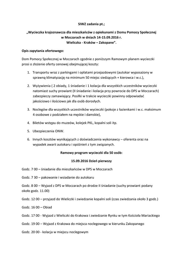 SIWZ zadania pt.; „Wycieczka krajoznawcza dla mieszkaoców z opiekunami z Domu Pomocy Społecznej w Moczarach w dniach 14-15.09.2016 r. Wieliczka - Kraków – Zakopane”. Opis zapytania ofertowego: Dom Pomocy Społecznej w Moczarach zgodnie z poniższym Ramowym planem wycieczki prosi o złożenie oferty cenowej obejmującej koszty: 1. Transportu wraz z parkingami i opłatami przejazdowymi (autokar wyposażony w sprawną klimatyzację na minimum 50 miejsc siedzących + kierowca i w.c.), 2. Wyżywienia ( 2 obiady, 1 śniadanie i 1 kolacja dla wszystkich uczestników wycieczki natomiast suchy prowiant (II śniadanie i kolacja przy powrocie do DPS w Moczarach) zabezpieczy zamawiający. Posiłki w trakcie wycieczki powinny odpowiadad jakościowo i ilościowo jak dla osób dorosłych. 3. Noclegów dla wszystkich uczestników wycieczki (pokoje z łazienkami i w.c. maksimum 4 osobowe z podziałem na męskie i damskie), 4. Biletów wstępu do muzeów, kolejek PKL, kopalni soli itp. 5. Ubezpieczenia ONW. 6. Innych kosztów wynikających z doświadczenia wykonawcy – oferenta oraz na wypadek awarii autokaru i opóźnieo z tym związanych. Ramowy program wycieczki dla 50 osób: 15.09.2016 Dzieo pierwszy Godz. 7 00 – śniadanie dla mieszkaoców w DPS w Moczarach Godz. 7 30 – pakowanie i wsiadanie do autokaru Godz. 8 00 – Wyjazd z DPS w Moczarach po drodze II śniadanie (suchy prowiant podany około godz. 11.00) Godz. 12 00 – przyjazd do Wieliczki i zwiedzanie kopalni soli (czas zwiedzania około 3 godz.) Godz. 16 00 – Obiad Godz. 17 00 - Wyjazd z Wieliczki do Krakowa i zwiedzanie Rynku w tym Kościoła Mariackiego Godz. 19 00 – Wyjazd z Krakowa do miejsca noclegowego w kierunku Zakopanego Godz. 20 00 - kolacja w miejscu noclegowym Godz. 22 00 - nocleg 16.09.2016 Dzieo drugi Godz. 8 00 – pobudka i toaleta poranna. Godz. 9 00 - Śniadanie w miejscu noclegowym Godz. 10 00 – wyjazd do Zakopanego Godz. 11 00 – wyjazd kolejką na Gubałówkę (pobyt na Gubałówce w tym propozycja minimum 1 atrakcji podczas pobytu na górze wg. propozycji i sugestii oferenta) Godz. 13 00 – obiad Godz. 13 00 – zwiedzanie Zakopanego w tym minimum 1 atrakcyjne muzeum wg. propozycji i sugestii oferenta Godz. 15 00 – Wyjazd z Zakopanego w drogę powrotną Godz. 18 00 – kolacja w drodze powrotnej do DPS w Moczarach (suchy prowiant) Godz. 20 00 – przyjazd do DPS w Moczarach Uwaga! Oferent powinien przewidzied krótkie postoje w czasie długich przejazdów trwających powyżej 120 min.