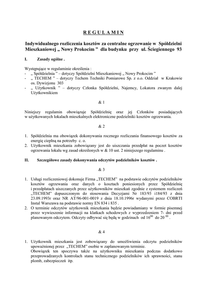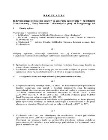 REGULAMIN Indywidualnego rozliczenia kosztów za centralne ogrzewanie w Spółdzielni Mieszkaniowej „ Nowy Prokocim ” dla budynku przy ul. Ściegiennego 93 I. Zasady ogólne . Występujące w regulaminie określenia : - „ Spółdzielnia ” – dotyczy Spółdzielni Mieszkaniowej „ Nowy Prokocim ” - „ TECHEM ” – dotyczy Techem Techniki Pomiarowe Sp. z o.o. Oddział w Krakowie os. Dywizjonu 303 - „ UŜytkownik ” – dotyczy Członka Spółdzielni, Najemcy, Lokatora zwanym dalej UŜytkownikiem &1 Niniejszy regulamin obowiązuje Spółdzielnię oraz jej Członków posiadających w uŜytkowanych lokalach mieszkalnych elektroniczne podzielniki kosztów ogrzewania. &2 1. Spółdzielnia ma obowiązek dokonywania rocznego rozliczania finansowego kosztów za energię cieplną na potrzeby c. o. 2. UŜytkownik mieszkania zobowiązany jest do uiszczania przedpłat na poczet kosztów ogrzewania lokalu wg zasad określonych w & 10 ust. 2 niniejszego regulaminu . II. Szczegółowe zasady dokonywania odczytów podzielników kosztów . &3 1. Usługi rozliczeniowej dokonuje Firma „TECHEM” na podstawie odczytów podzielników kosztów ogrzewania oraz danych o kosztach poniesionych przez Spółdzielnię i przedpłatach uiszczanych przez uŜytkowników mieszkań zgodnie z systemem rozliczeń „TECHEM” dopuszczonym do stosowania Decyzjami Nr 183/93 i184/93 z dnia 23.09.1993r oraz NR AT/96-001-0019 z dnia 18.10.1996r wydanymi przez COBRTI Instal Warszawa na podstawie normy EN 834 i 835 . 2. O terminie odczytów uŜytkownik mieszkania będzie powiadamiany w formie pisemnej przez wywieszenie informacji na klatkach schodowych z wyprzedzeniem 7- dni przed planowanym odczytem. Odczyty odbywać się będą w godzinach od 1600 do 20 00 . &4 1. UŜytkownik mieszkania jest zobowiązany do umoŜliwienia odczytu podzielników upowaŜnionej przez „TECHEM” osobie w zaplanowanym terminie. Obowiązek ten spoczywa takŜe na uŜytkowniku mieszkania podczas dodatkowo przeprowadzanych kontrolach stanu technicznego podzielników ich sprawności, stanu plomb, zabezpieczeń itp. 2. W przypadku nieobecności uŜytkownika mieszkania w czasie wykonywania czynności określonych w ust. 1 osoba upowaŜniona przez „TECHEM” pozostawia informacje o nowym terminie wykonania czynności nie wcześniej jak 7 dni od daty pierwszego odczytu . 3. W razie dwukrotnej nieobecności uŜytkownika mieszkania wyznacza się trzeci termin za dodatkową opłatą, wg cennika stosowanego przez „TECHEM”, jednak nie wcześniej niŜ 14 dni po terminie pierwszego odczytu . 4. W przypadku , gdy pomimo trzech terminów nie jest moŜliwe odczytanie podzielników kosztów c.o. z winy lokatora Spółdzielnia rozliczy koszty ogrzewania tego lokalu wg zasad określonych w & 12 ust. 2 za miniony okres rozliczeniowy . &5 Z przeprowadzonego odczytu „TECHEM” dokonuje wpisu w kwicie odczytowym, zaś z czynności kontrolnych sporządza się protokół podpisany przez UŜytkownika lub osobę przez niego upowaŜnioną i „TECHEM”. Kopie tych dokumentów pozostawiane są osobie podpisującej . &6 Podczas dokonywania odczytów uŜytkownik mieszkania lub osoba przez niego upowaŜniona ma prawo i obowiązek sprawdzenia poprawności odczytu i zgłaszania ewentualnych zastrzeŜeń wyłącznie w trakcie ich wykonywania. W przypadkach wątpliwych miarodajnym są wartości odczytów zapisane w kwicie odczytu. &7 W przypadkach stwierdzenia przez „TECHEM”, Ŝe podzielnik został uszkodzony lub naruszona została plomba, albo nastąpiło przemieszczenie podzielnika z miejsca gdzie był zamontowany, „TECHEM” odnotuje stwierdzone fakty w protokole, co będzie podstawą do rozliczenia kosztów ogrzewania zgodnie z & 12 ust. 2 oraz obciąŜeniem kosztami za przywrócenie stanu pierwotnego. &8 UŜytkownik obowiązany jest do przygotowania dostępu do grzejników na wyznaczony termin odczytu. UniemoŜliwienie dostępu do grzejników moŜe spowodować odstąpienie od czynności odczytowych lub naliczenie kosztów dodatkowych zgodnych z cennikiem załączonym przy umowie na rozliczenie za czynności dodatkowe związane z usuwaniem przeszkód przez serwis „TECHEM”. III. Szczegółowe zasady dokonywania rozliczeń kosztów ogrzewania . &9 Rozliczanie kosztów za centralne ogrzewanie dokonywane będzie przez „TECHEM” na podstawie poniesionych kosztów przez Spółdzielnię na ten cel tj. : - koszty energii cieplnej dostarczonej przez MPEC na ogrzewanie budynku - koszty za moc cieplną zamówioną dla tego budynku - koszty obsługi i dokonywanych rozliczeń w wysokości 7,60 zł + VAT za odczyt i rozliczenie jednego podzielnika w roku 2007. W następnych latach kwota ta będzie korygowana o współczynnik GUS- u . - obliczenie nowych wysokości przedpłat na kolejny okres rozliczeniowy 1,00 zł + VAT dla jednego mieszkania Wymienione wyŜej koszty związane ze zuŜyciem energii cieplnej rozdziela się na podstawie tego samego klucza na wszystkie lokale. W opłacie za ciepło zastosowane zostaną współczynniki redukcyjne dla pomieszczeń gorzej sytuowanych w budynku i stosowane zgodnie z zaleceniem Centralnego Ośrodka Badawczo Rozwojowego Techniki Instalacyjnej INSTAL Warszawa ul. Kasawerów 21. & 10 Opłata za ciepło dostarczone do lokali mieszkalnych w okresie rozliczeniowym składa się z : 1.1.części stałej , stanowiącej 30 % kosztów za energię cieplną dostarczoną i moc zamówioną do danego budynku i powinna odpowiadać kosztom, na które zachowania odbiorców nie wywierają bezpośredniego wpływu tj. a) kosztom z powodu nieuniknionych strat w przesyłaniu ciepła systemem przewodów w budynku, b) kosztom ciepła oddanego przez grzejniki w pomieszczeniach wspólnych (klatki schodowe, pralnie, suszarnie itp.) c) określenie proporcji kosztów stałych wg zuŜycia naleŜy do kompetencji Zarządu Spółdzielni 1.2.części zmiennej, stanowiącej 70 % kosztów za energię cieplną dostarczoną i moc zamówioną do budynku lub 