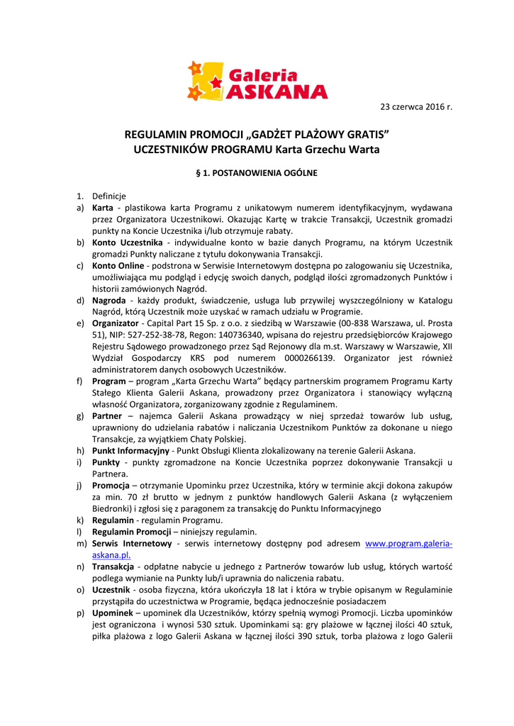 23 czerwca 2016 r. REGULAMIN PROMOCJI „GADŻET PLAŻOWY GRATIS” UCZESTNIKÓW PROGRAMU Karta Grzechu Warta § 1. POSTANOWIENIA OGÓLNE 1. Definicje a) Karta - plastikowa karta Programu z unikatowym numerem identyfikacyjnym, wydawana przez Organizatora Uczestnikowi. Okazując Kartę w trakcie Transakcji, Uczestnik gromadzi punkty na Koncie Uczestnika i/lub otrzymuje rabaty. b) Konto Uczestnika - indywidualne konto w bazie danych Programu, na którym Uczestnik gromadzi Punkty naliczane z tytułu dokonywania Transakcji. c) Konto Online - podstrona w Serwisie Internetowym dostępna po zalogowaniu się Uczestnika, umożliwiająca mu podgląd i edycję swoich danych, podgląd ilości zgromadzonych Punktów i historii zamówionych Nagród. d) Nagroda - każdy produkt, świadczenie, usługa lub przywilej wyszczególniony w Katalogu Nagród, którą Uczestnik może uzyskać w ramach udziału w Programie. e) Organizator - Capital Part 15 Sp. z o.o. z siedzibą w Warszawie (00-838 Warszawa, ul. Prosta 51), NIP: 527-252-38-78, Regon: 140736340, wpisana do rejestru przedsiębiorców Krajowego Rejestru Sądowego prowadzonego przez Sąd Rejonowy dla m.st. Warszawy w Warszawie, XII Wydział Gospodarczy KRS pod numerem 0000266139. Organizator jest również administratorem danych osobowych Uczestników. f) Program – program „Karta Grzechu Warta” będący partnerskim programem Programu Karty Stałego Klienta Galerii Askana, prowadzony przez Organizatora i stanowiący wyłączną własność Organizatora, zorganizowany zgodnie z Regulaminem. g) Partner – najemca Galerii Askana prowadzący w niej sprzedaż towarów lub usług, uprawniony do udzielania rabatów i naliczania Uczestnikom Punktów za dokonane u niego Transakcje, za wyjątkiem Chaty Polskiej. h) Punkt Informacyjny - Punkt Obsługi Klienta zlokalizowany na terenie Galerii Askana. i) Punkty - punkty zgromadzone na Koncie Uczestnika poprzez dokonywanie Transakcji u Partnera. j) Promocja – otrzymanie Upominku przez Uczestnika, który w terminie akcji dokona zakupów za min. 70 zł brutto w jednym z punktów handlowych Galerii Askana (z wyłączeniem Biedronki) i zgłosi się z paragonem za transakcję do Punktu Informacyjnego k) Regulamin - regulamin Programu. l) Regulamin Promocji – niniejszy regulamin. m) Serwis Internetowy - serwis internetowy dostępny pod adresem www.program.galeriaaskana.pl. n) Transakcja - odpłatne nabycie u jednego z Partnerów towarów lub usług, których wartość podlega wymianie na Punkty lub/i uprawnia do naliczenia rabatu. o) Uczestnik - osoba fizyczna, która ukończyła 18 lat i która w trybie opisanym w Regulaminie przystąpiła do uczestnictwa w Programie, będąca jednocześnie posiadaczem p) Upominek – upominek dla Uczestników, którzy spełnią wymogi Promocji. Liczba upominków jest ograniczona i wynosi 530 sztuk. Upominkami są: gry plażowe w łącznej ilości 40 sztuk, piłka plażowa z logo Galerii Askana w łącznej ilości 390 sztuk, torba plażowa z logo Galerii Askana w łącznej ilości 35 sztuk, składana mata do siedzenia z logo Galerii Askana w łącznej ilości 65 sztuk. § 2. UCZESTNICY PROMOCJI 1. Prawo do uczestnictwa w Promocji Prawo do uczestniczenia w Promocji mają Uczestnicy. Jeden Uczestnik może wziąć udział w Promocji tylko jeden raz. 2. Termin promocji Od 1 lipca 2016 r. do wyczerpania puli Upominków 3. Pozbawienie statusu Uczestnika Promocji Organizator w każdym czasie ma prawo do wykluczenia z Promocji Uczestnika nie przestrzegającego postanowień Regulaminu i Regulaminu Promocji, lub Uczestnika działającego w złej wierze. 4. Utrata korzyści Uczestnik wykluczony z Programu traci prawo do Nagród i innych korzyści uzyskanych w związku z działaniem w sposób niezgodny z Regulaminem i Regulaminem Promocji, lub działaniem w złej wierze. 5. Wydawanie Karty Warunki wydawania Karty określa Regulamin. 6. Uprawnienia wynikające z Karty Zakres innych przywilejów przypisanych do Karty określa wyłącznie Regulamin lub związane z nim zarządzania Organizatora, które każdorazowo będą publikowane na stronie www.program.galeria-askana.pl. § 3. PRZEBIEG PROMOCJI 1. Mechanizm Promocji W trakcie trwania Promocji, jej Uczestnicy, którzy dokonają zakupów za min. 70 zł brutto w jednym z punktów handlowych Galerii Askana (z wyłączeniem Biedronki, paragony nie łączą się) i zgłoszą się z paragonem za transakcję do Punktu Informacyjnego, otrzymają Upominek. W Promocji przewidziano 530 Upominków. Uczestnik ma prawo wyboru Upominku z listy Upominków dostępnych w Promocji. W momencie kiedy dany rodzaj Upominku się kończy, można otrzymać jedynie Upominek, który pozostał na stanie. Nie ma możliwości wymiany Upominków na inny. Promocja kończy się w momencie wyczerpania puli Upominków. 2. Wydawanie Upominków Upominek jest wydawany w Punkcie Informacyjnym. Odbiór Upominku Uczestnik poświadcza złożeniem podpisu. Liczba upominków jest ograniczona do 530 sztuk. Liczba upominków jest ograniczona i wynosi 530 sztuk. Upominkami są: gry plażowe w łącznej ilości 40 sztuk, piłka plażowa z logo Galerii Askana w łącznej ilości 390 sztuk, torba plażowa z logo Galerii Askana w łącznej ilości 35 sztuk, składana mata do siedzenia z logo Galerii Askana w łącznej ilości 65 sztuk. Uczestnik otrzymuje jeden Upominek. 3. Organizator promocji oświadcza, że Upominki w promocji zostaną wydane zgodnie z przepisami Ustawy z dnia 26 lipca 1991 r. o podatku dochodowym od osób fizycznych (DZ.U. z 2010 r Nr 51, poz.307 z późn.zm.)” § 4. POSTANOWIENIA KOŃCOWE 1. Prawo do interpretacji i wyjaśniania Regulaminu Promocji Organizator Promocji zastrzega sobie prawo do ostatecznej interpretacji Regulaminu Promocji oraz rozstrzygania ewentualnych niejasności, pojawiających się w toku jego stosowania. 2. Wniosek o dokonanie wykładni Regulaminu Promocji Uczestnicy Programu w przypadku jakichkolwiek wątpliwości związanych ze zrozumieniem 