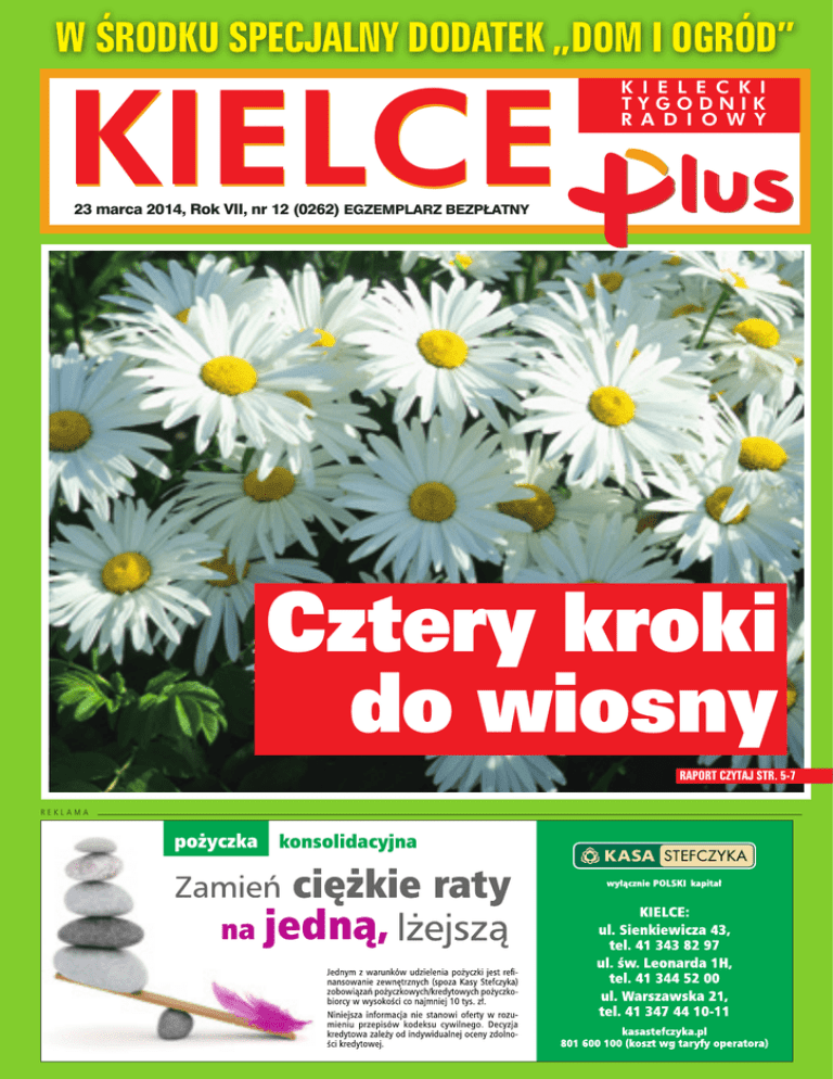 W ŚRODKU SPECJALNY DODATEK „DOM I OGRÓD” KIELCE K I E L E C K I TYGODNIK R A D I O W Y 23 marca 2014, Rok VII, nr 12 (0262) EGZEMPLARZ BEZPŁATNY Cztery kroki do wiosny RAPORT CZYTAJ STR. 5-7 REKLAMA Kielce plus AKTUALNOŚCI Dołożyli do wieży Starostwo gotowe Zakończyła się budowa nowej siedziby Starostwa Powiatowego w Kielcach przy ul. Wrzosowej 44. Trwają odbiory poWIĘCE J szczególnych elementów budynku, wkrótce rozpoczną się przeprowadzki kolejnych wydziałów. Jako pierwszy WTO REK przeniesie się wydział geodezji i gospoDni dla życia 18.00 darki nieruchomościami. Budowa staroDwa dni przypominają w tym tygodniu o świętości życia. W poniedziałek, stwa trwała kilka lat, nie obyło się bez 24 marca, obchodzimy Narodowy Dzień Życia. Jest to święto ustanowione przez problemów. – To było ogromne przedsejm RP w 2004 roku. W jego ramach organizowane są kampanie społeczne, sięwzięcie, ale nasz urząd będzie lepiej kładące nacisk na znaczenie życia rodzinnego. W tym roku hasłem jest „Rodzina pracował i obsługiwał interesantów. obywatelska. Rodzina, wspólnota, samorząd”. Natomiast we wtorek, 25 marca, Nowy gmach jest nowoczesny, przeprzypada Święto Zwiastowania Pańskiego, kiedy to obchodzimy Dzień Świętości stronny, przystosowany do potrzeb Życia. W świątyniach odbywają się wówczas modlitwy w intencji życia poczęte- osób niepełnosprawnych – informuje go, dzieci i rodziców. /KB/ Agata Niebudek-Śmiech, rzecznik starostwa. Inwestycja kosztowała niemal przez ulice Gosiewskiego i 1 Maja – do40 mln zł. /MC/ daje Skrzydło. /MU/ Kielce wesprą odbudowę wieży kościoła na Świętym Krzyżu – taką decyzję w czwartek podjęli kieleccy rajcy. Miasto dołoży do inwestycji 200 tys. zł. Uchwała została podjęta 18 głosami “za”. Czterech radnych wstrzymało się. – Wieża powinna być odbudowana. Zachęcamy inne samorządy, by wsparły ten projekt – mówi Mieczysław Tomala, dyrektor Wydziału Edukacji, Kultury i Sportu. Spichlerz Artystów? Będą światła Drogowcy podjęli decyzję o instalacji sygnalizacji świetlnej na skrzyżowaniu ulic Czarnowskiej i Żelaznej w Kielcach. Głównym powodem jest duże natężenie ruchu w tym miejscu. – Sznury pojazdów na ulicach Żelaznej i Gosiewskiego uniemożliwiają autobusom wyjazd z Czarnowskiej – wyjaśnia Jarosław Skrzydło, rzecznik MZD. Wpływ na decyzję o instalacji świateł miała również duża liczba wypadków na feralnym skrzyżowaniu. Koszt instalacji sygnalizacji wyniesie kilkaset tysięcy złotych, zostanie ona zamontowana w ciągu dwóch miesięcy. W innym rejonie miasta konieczne jest zamknięcie wlotu ul. Krakowskiej do ul. Ściegiennego, z powodu inwestycji przy WDK. – Tranzyt pojazdów ciężkich musimy poprowadzić Jest szansa, że zabytkowy spichlerz na ulicy Zamkowej w Kielcach będzie przystanią dla artystów i regionalnej sztuki. Miasto chce budynek kupić i wyremontować. Wkrótce mają się rozpocząć rozmowy z obecnym właścicielem – spółką Polski Tytoń. Janusz Knap, dyrektor Wzgórza Zamkowego, ma już pomysł na zagospodarowanie spichlerza. – Chciałbym tu stworzyć miejsce handlu sztuką i rękodziełem nie tylko kieleckich twórców. Byłaby to szansa na prezentację wyrobów, które nie są produkcją masową – wyjaśnia Knap. Cena za nieruchomość wynosi 3,5 mln zł. /MC/ Ekologia w Targach Targi „Enex” oraz „Enex” Nowa Energia gościły przez trzy dni minionego tygodnia w halach przy ul. Zakładowej. Równocześnie odbywały się XV Targi Ekologiczne, Komunalne, Surowców Wtórnych, Utylizacji i Recyklingu „Ekotech”. Swoją ofertę zaprezentowało blisko 180 firm z całego świata. Pokazały najnowocześniejszy sprzęt z zakresu odnawialnych źródeł energii, ekologii i pneumatyki. Tegorocznej edycji towarzyszył bogaty program bezpłatnych konferencji. Organizatorzy przygotowali między innymi forum, poświęcone możliwościom wykorzystania odnawialnych źródeł energii w gospodarstwach rolnych. /red/ Obiekt na Św. Krzyżu ma być wierną kopią 52-metrowej budowli, zniszczonej w 1914 roku przez wojska austriackie. Koszt odbudowy to ponad 7 mln zł (85 proc. sumy pochodzi ze środków unijnych). Beneficjentem formalnym są gmina Bieliny oraz ojcowie oblaci. /MU/ Lepsza ortopedia? Ortopedia Wojewódzkiego Szpitala Zespolonego ma nowych pracowników. Pracę na oddziale rozpoczęli czterej lekarze – specjaliści od nowoczesnych technik operacyjnych – oraz dziesięć pielęgniarek. Ich nowym ordynatorem jest dr Paweł Skowronek z Warszawskiego Uniwersytetu Medycznego, specjalizujący się w miniinwazyjnych technikach leczenia stawu biodrowego, w których jest pionierem. – Widzę szansę na rozwój miejscowej ortopedii. Przyjechaliśmy, by wzmocnić ją w zakresie protezoplastyki, zabiegów rewizyjnych i korekcyjnych – mówi dr Skowronek. Oddział od kilku dni operuje nie tylko do południa, ale również po południu, dzięki czemu wyraźnie REKLAMA 2 23 marca 2014 Kielce plus AKTUALNOŚCI/REKLAMA powinny zmniejszyć się kolejki. Nowy ordynator zapowiada także stworzenie w Kielcach ośrodka szkoleniowego, zajmującego się miniinwazyjnymi technikami leczenia. /MU/ Bezprawie? w projektor, ekran, system nagłaśniający oraz internet. Dzięki temu przedsięwzięciu 14 tys. szkół otrzyma bezpłatny dostęp on-line do ponad 100 polskich filmów. – Takie pracownie będą cudownymi miejscami edukacji młodych ludzi, którzy w przyszłości stać się mogą reżyserami albo aktorami – podkreśla aktor Zbigniew Waleryś. /MC/ Kim jest Małgorzata? Świętokrzyska „Solidarność” nazywa bezprawiem ubiegłotygodniowe zwolnienie z pracy szefa związku w „Premie”, Roberta Kułagi. – Zgodnie z Kodeksem Pracy i ustawą o związkach zawodowych osoby pełniące funkcję związkową są chronione prawem. Prezes przesłał nam sześć stron bezpodstawnych zarzutów, opierających się na