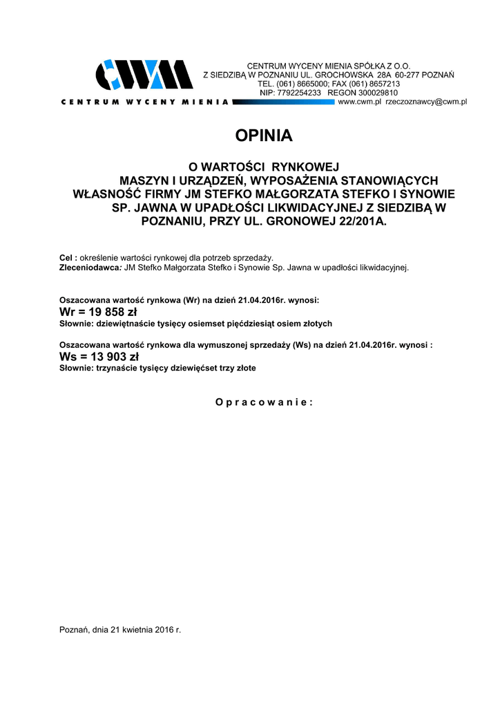 OPINIA O WARTOŚCI RYNKOWEJ MASZYN I URZĄDZEŃ, WYPOSAŻENIA STANOWIĄCYCH WŁASNOŚĆ FIRMY JM STEFKO MAŁGORZATA STEFKO I SYNOWIE SP. JAWNA W UPADŁOŚCI LIKWIDACYJNEJ Z SIEDZIBĄ W POZNANIU, PRZY UL. GRONOWEJ 22/201A. Cel : określenie wartości rynkowej dla potrzeb sprzedaży. Zleceniodawca: JM Stefko Małgorzata Stefko i Synowie Sp. Jawna w upadłości likwidacyjnej. Oszacowana wartość rynkowa (Wr) na dzień 21.04.2016r. wynosi: Wr = 19 858 zł Słownie: dziewiętnaście tysięcy osiemset pięćdziesiąt osiem złotych Oszacowana wartość rynkowa dla wymuszonej sprzedaży (Ws) na dzień 21.04.2016r. wynosi : Ws = 13 903 zł Słownie: trzynaście tysięcy dziewięćset trzy złote Opracowanie: Poznań, dnia 21 kwietnia 2016 r. SPIS TREŚCI I. Podstawy formalno - prawne. 1. 2. 3. 4. 5. 6. 7. 8. Podstawa opracowania wyceny. Przedmiot wyceny Zakres wyceny Cel wyceny. Podstawy prawne Źródła informacji. Określenie stanu prawnego Zastrzeżenia II. Podstawowe pojęcia z zakresu wyceny maszyn i urządzeń i metodyka wyceny III. Opis i Wycena IV. Załączniki 1. Dokumentacja fotograficzna 2 I. PODSTAWY FORMALNO - PRAWNE. 1. PODSTAWA OPRACOWANIA WYCENY Zlecenie od JM Stefko Małgorzata Stefko i Synowie sp. jawna w upadłości likwidacyjnej z siedzibą w Poznaniu, ul. Gronowa 22/201A dla Centrum Wyceny Mienia Sp. z o.o. z siedzibą w Poznaniu ul. Grochowska 28A. 2. PRZEDMIOT OPRACOWANIA Przedmiotem opinii są maszyny i urządzenia oraz środki transportu stanowiące własność firmy JM Stefko Małgorzata Stefko i Synowie sp. jawna w upadłości likwidacyjnej z siedzibą w Poznaniu, ul. Gronowa 22/201A. 3. ZAKRES WYCENY Zakresem wyceny objęto maszyny i urządzenia poligraficzne, oraz środki transportu stanowiące własność firmy JM Stefko Małgorzata Stefko i Synowie sp. jawna w upadłości likwidacyjnej z siedzibą w Poznaniu, ul. Gronowa 22/201A wyszczególnione w dalszej części opinii. 4. CEL WYCENY Wycena ma na celu określenie wartości rynkowej w/w urządzeń dla potrzeb sprzedaży. 5. PODSTAWA PRAWNA 5.1. Kodeks cywilny – Ustawa z dnia 23.04.1964. z późniejszymi zmianami. 5.2. Ustawa z dnia 29 września 1994 r. o rachunkowości (Dz. U. nr 1994 Nr 121 poz. 591) z późniejszymi zmianami. 6. ŹRÓDŁA INFORMACJI 6.1. Wizja lokalna wycenianego majątku w dniu 20 kwietnia 2016r. 6.2. Wycena wartości środków technicznych - T. Klimek. Wyd. 2003r; 6.3. Informacje uzyskane z serwisów i sprzedawców w/w urządzeń. 6.4. Ceny transakcyjne z regionalnego rynku. 6.5. Informacje uzyskane od użytkownika. 6.6. Napiórkowski J., Wycena maszyn i urządzeń, Materiały szkoleniowe, Olsztyn 2008 r. 6.7. Osypiuk W., Wycena maszyn i urządzeń, Materiały szkoleniowe, Warszawa 2007 r. 7. OKREŚLENIE STANU PRAWNEGO Przedmiotowy majątek stanowi własność firmy JM Stefko Małgorzata Stefko i Synowie sp. jawna w upadłości likwidacyjnej z siedzibą w Poznaniu, ul. Gronowa 22/201A. 8. ZASTRZEŻENIA 8.1. Niniejsza opinia nie może być wykorzystywana do celów innych niż określone w pkt. II.4 Wszelkie prawa zastrzeżone. Żaden fragment niniejszej opinii nie może być powielany, publikowany, przekazywany za pomocą środków elektronicznych, mechanicznych i innych, nie może być fotografowany, nagrywany w całości lub w części bez uprzedniej zgody autora. 8.2. Opinia został sporządzony zgodnie z aktualnie obowiązującymi przepisami. 8.3. Określona wartość jest wartością na dzień 21 kwietnia 2016 roku. 8.4. Opinię wykonano w dwóch jednobrzmiących opracowaniach. 3 II. PODSTAWOWE POJĘCIA Z ZAKRESU WYCENY I METODYKA WYCENY Proces wyceny - uporządkowany ciąg działań analityczno – rachunkowych w wyniku których uzyskiwane jest realne oszacowanie wartości maszyny ( urządzenia) w określonej rzeczywistości gospodarczej. Wartość – cecha obiektu mechanicznego traktowana jako potencjalna cena możliwa do uzyskania podczas sprzedaży na rynku, przy uwzględnieniu założeń i uwarunkowań procesu wyceny. Wartość rynkowa – najbardziej prawdopodobna cena możliwa do uzyskania na rynku przy uwzględnieniu następujących uwarunkowań: - transakcja zachodzi na wolnym i konkurencyjnym rynku bez zakłóceń irracjonalnych kierowanymi szczególnie motywami, - znajduje się chętny sprzedawca i nabywca, którzy nie działają w sytuacji przymusowej, - znane są zalety i wady maszyn, - czas niezbędnego wyeksponowania maszyny na rynku uwzględnia jej rodzaj i stan rynku. Środek techniczny – w metodologii wyceny to uogólnienie maszyny, urządzenia, narzędzia i niejednokrotnie utożsamiany jest z obiektem mechanicznym. Środkiem technicznym w rozumieniu powyższej definicji jest np. maszyna, urządzenie, pojazd, agregat, linia technologiczna itd., pracujące w systemie operacyjnym. Maszyna (urządzenie mechaniczne) – obiekt mechaniczny zawierający mechanizm lub zespół mechanizmów we wspólnej obudowie, służący do przetwarzania energii lub wykonywania określonej pracy mechanicznej. Z energetycznego punktu widzenia urządzenie mechaniczne (maszyna) pobiera energię mechaniczną lub jest przetwornikiem energii przetwarzającym inny rodzaj energii w energię mechaniczną. Maszyna - Rozporządzenie Ministra Gospodarki z dnia 20 12.2005 r. w sprawie zasadniczych wymagań dla maszyn i elementów bezpieczeństwa ( Dz. U. Nr 259, poz. 2170 ) - zespół sprzężonych części lub elementów składowych, z których przynajmniej jeden jest ruchomy, wraz z odpowiednimi elementami uruchamiającymi, obwodami sterowania, zasilania, połączonych wspólnie w celu określonego zastosowania, w szczególności do przetwarzania, obróbki, przemieszczania lub pakowania materiałów. Niezawodność w technice – właściwość obiektu charakteryzująca jego zdolność do wykonywania określonych funkcji, w określonych warunkach i określonym czasie. W sensie ilościowym niezawodność to prawdopodobieństwo poprawnego funkcjonowania zgodnie z przeznaczeniem w określonym czasie. 