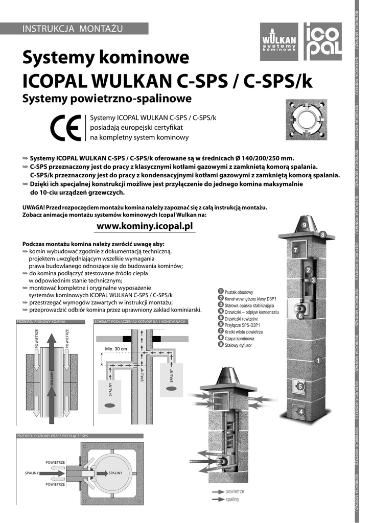 INSTRUKCJA MONTAŻU INSTRUKCJA MONTAŻU Systemy ICOPAL WULKAN C-SPS / C-SPS/k posiadają europejski certyfikat na kompletny system kominowy www.kominy.icopal.pl SPALINY SPALINY SPALINY POWIETRZE POWIETRZE SPALINY INSTRUKCJA MONTAŻU INSTRUKCJA MONTAŻU POWIETRZE INSTRUKCJA MONTAŻU SPALINY POWIETRZE INSTRUKCJA MONTAŻU PRZEKRÓJ POZIOMY PRZEZ PRZYŁĄCZE SPS SPALINY INSTRUKCJA MONTAŻU SCHEMAT PODŁĄCZENIA2 KOTŁÓW NA 1 KONDYGNACJI PRZEKRÓJ PIONOWY KOMINA INSTRUKCJA MONTAŻU Podczas montażu komina należy zwrócić uwagę aby:  komin wybudować zgodnie z dokumentacją techniczną, projektem uwzględniającym wszelkie wymagania prawa budowlanego odnoszące się do budowania kominów;  do komina podłączyć atestowane źródło ciepła w odpowiednim stanie technicznym;  montować kompletne i oryginalne wyposażenie systemów kominowych ICOPAL WULKAN C-SPS / C-SPS/k  przestrzegać wymogów zawartych w instrukcji montażu;  przeprowadzić odbiór komina przez uprawniony zakład kominiarski. INSTRUKCJA MONTAŻU UWAGA! Przed rozpoczęciem montażu komina należy zapoznać się z całą instrukcją montażu. Zobacz animacje montażu systemów kominowych Icopal Wulkan na: INSTRUKCJA MONTAŻU  Systemy ICOPAL WULKAN C-SPS / C-SPS/k oferowane są w średnicach Ø 140/200/250 mm.  C-SPS przeznaczony jest do pracy z klasycznymi kotłami gazowymi z zamknietą komorą spalania. C-SPS/k przeznaczony jest do pracy z kondensacyjnymi kotłami gazowymi z zamkniętą komorą spalania.  Dzięki ich specjalnej konstrukcji możliwe jest przyłączenie do jednego komina maksymalnie do 10-ciu urządzeń grzewczych. INSTRUKCJA MONTAŻU Systemy powietrzno-spalinowe INSTRUKCJA MONTAŻU Systemy kominowe ICOPAL WULKAN C-SPS / C-SPS/k INSTRUKCJA MONTAŻU 1 INSTRUKCJA MONTAŻU INSTRUKCJA MONTAŻU Na fundamencie wykonanym zgodnie z projektem budowlanym, z zastosowaną izolacją przeciwwilgociową (PAPA FUNDAMENT SZYBKI PROFIL SBS) układamy na zaprawie murarskiej pierwszy pustak obudowy z centralnie wyciętym otworem o wymiarach 140 mm x 140 mm w którym osadzone będą drzwiczki odpływu kondensatu. Pamiętamy o dokładnym ustawieniu pustaka obudowy w pionie i poziomie. Centralnie wewnątrz pierwszego pustaka osadzamy na zaprawie murarskiej ceramiczną podstawę pod element odprowadzenia kondensatu. Montaż systemu możemy rozpocząć na dowolnej wysokości pod warunkiem wykonania podstawy komina z innych materiałów (np. beton, cegła) o wytrzymałości zapewniającej przeniesienie obciażenia z projektowanego pionu kominowego. 2 INSTRUKCJA MONTAŻU INSTRUKCJA MONTAŻU Do elementu odprowadzenia kondesatu (Ø 140/200 mm KJZ-UNI/ Ø 250 mm KJZ 25) przykręcamy syfon wykonany z kwasoodpornego tworzywa pamiętając, aby otwór odpływowy skierowany był w stronę umożliwiajacą podłączenie sztywnego lub elastycznego odprowadzenia kondesatu i poprowadzenie go przez otwór w drzwiczkach. 3 INSTRUKCJA MONTAŻU INSTRUKCJA MONTAŻU INSTRUKCJA MONTAŻU INSTRUKCJA MONTAŻU INSTRUKCJA MONTAŻU INSTRUKCJA MONTAŻU Przygotowujemy kit kwasoodporny do łączenia elementów szamotowych według instrukcji zamieszczonej na opakowaniu. Na 3 kg wiaderko suchego kitu potrzebujemy ok. 0,4 l wody. Ilość przygotowywanego kitu należy dopasować do postępu prac przy wznoszeniu komina (przy temp. 20oC czas stosowania wynosi 90 min.). Po dokładnym wymieszaniu potrzebnej porcji kitu czekamy 5 minut i ponownie mieszamy aż uzyskamy jednolitą masę. Czas utwardzenia przy temp. 20oC – 24 godziny. Temperatura stosowania: od +5oC do +25oC. UWAGA! Przy łączeniu elementów szamotowych kitem kwasoodpornym, przed jego nałożeniem, należy zwilżyć klejone powierzchnie za pomocą wilgotnej gąbki. 4 Na przygotowanej podstawie osadzamy centralnie i łączymy wcześniej przygotowanym kitem kwasoodpornym element odprowadzenia kondensatu (Ø 140/200 mm KJZ-UNI/ Ø 250 mm KJZ 25) pamiętając, aby otwór odpływowy skierowany był w stronę gdzie będą zamontowane drzwiczki. 5 W kolejnym pustaku obudowy wycinamy centralnie otwór o wymiarach 140 x 140 mm pozwalający zamontować drzwiczki rewizyjne. Pustak osadzamy na zaprawie murarskiej. Grubość spoiny między pustakami obudowy powinna wynosić 1-2cm. Po ułożeniu każdego elementu kontrolujemy pion i poziom. Następnie stosując kit kwasoodporny łaczymy ceramiczną rewizję (KC-SPS) z elementem odprowadzenia kondensatu pamiętając aby otwór rewizji skierowany był w stronę gdzie będą zamontowane drzwiczki. Za pomocą wilgotnej gąbki wygładzamy dokładnie od wewnątrz spoinę usuwając nadmiar kitu. 5.1 Dotyczy systemów C-SPS. Przed zamontowaniem rewizji KC-SPS należy w jego dolnej części wyciąć otwór wyrównujący ciśnienie o wymiarach: Ø 140 mm i Ø 200 mm: (szer. x wys.) – 60x110 mm, Ø 250 mm: (szer. x wys.) – 100x110 mm. INSTRUKCJA MONTAŻU Po osiągnięciu zakładanej wysokości komina ponad dachem, poniżej czapy betonowej wykonujemy dwa otwory w elementach obudowy na przeciwległych ściankach. Otwory o wymiarach: 200 x 200 mm służą do osadzenia kratek przez które będzie zasysane powietrze do pieców z zamkniętą komorą spalania. Otwory na kratki trzeba wykonać tak aby różnica poziomów od górnej krawędzi otworu do wylotu spalin z komina wynosiła minimum 40 cm. INSTRUKCJA MONTAŻU 10 INSTRUKCJA MONTAŻU W zależności od ilości przyłączy do komina, powtarzamy czynności z pkt. 7-8 odpowiednią ilość razy regulując wysokość poszczególnych przyłączy odpowiednią ilością prostych rur szamotowych. Należy pamiętać, że w przypadku dwóch podłączeń na tej samej kondygnacji różnica wysokości pomiędzy osiami przyłączy powinna wynosić min. 30 cm (patrz rys. na str. 1). W systemach o średnicy Ø140 mm, Ø200 mm istnieje możliwość zastosowania ponad dachem gotowych elementów wykończenia komina imitujących cegłę. Łączenie tych elementów wykonujemy za pomocą cienkowarstwowej zaprawy do elementów betonowych (np. 