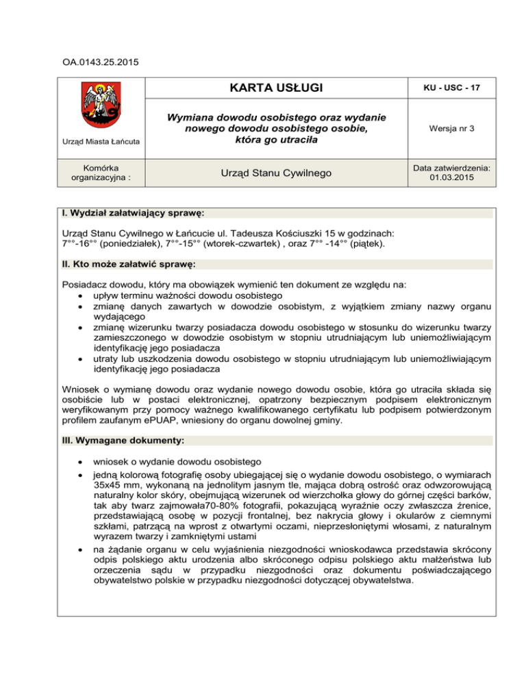 OA.0143.25.2015 KARTA USŁUGI KU - USC - 17 Wersja nr 3 Urząd Miasta Łańcuta Wymiana dowodu osobistego oraz wydanie nowego dowodu osobistego osobie, która go utraciła Komórka organizacyjna : Urząd Stanu Cywilnego Data zatwierdzenia: 01.03.2015 I. Wydział załatwiający sprawę: Urząd Stanu Cywilnego w Łańcucie ul. Tadeusza Kościuszki 15 w godzinach: 7°°-16°° (poniedziałek), 7°°-15°° (wtorek-czwartek) , oraz 7°° -14°° (piątek). II. Kto może załatwić sprawę: Posiadacz dowodu, który ma obowiązek wymienić ten dokument ze względu na: • upływ terminu ważności dowodu osobistego • zmianę danych zawartych w dowodzie osobistym, z wyjątkiem zmiany nazwy organu wydającego • zmianę wizerunku twarzy posiadacza dowodu osobistego w stosunku do wizerunku twarzy zamieszczonego w dowodzie osobistym w stopniu utrudniającym lub uniemożliwiającym identyfikację jego posiadacza • utraty lub uszkodzenia dowodu osobistego w stopniu utrudniającym lub uniemożliwiającym identyfikację jego posiadacza Wniosek o wymianę dowodu oraz wydanie nowego dowodu osobie, która go utraciła składa się osobiście lub w postaci elektronicznej, opatrzony bezpiecznym podpisem elektronicznym weryfikowanym przy pomocy ważnego kwalifikowanego certyfikatu lub podpisem potwierdzonym profilem zaufanym ePUAP, wniesiony do organu dowolnej gminy. III. Wymagane dokumenty: • • • wniosek o wydanie dowodu osobistego jedną kolorową fotografię osoby ubiegającej się o wydanie dowodu osobistego, o wymiarach 35x45 mm, wykonaną na jednolitym jasnym tle, mająca dobrą ostrość oraz odwzorowującą naturalny kolor skóry, obejmującą wizerunek od wierzchołka głowy do górnej części barków, tak aby twarz zajmowała70-80% fotografii, pokazującą wyraźnie oczy zwłaszcza źrenice, przedstawiającą osobę w pozycji frontalnej, bez nakrycia głowy i okularów z ciemnymi szkłami, patrzącą na wprost z otwartymi oczami, nieprzesłoniętymi włosami, z naturalnym wyrazem twarzy i zamkniętymi ustami na żądanie organu w celu wyjaśnienia niezgodności wnioskodawca przedstawia skrócony odpis polskiego aktu urodzenia albo skróconego odpisu polskiego aktu małżeństwa lub orzeczenia sądu w przypadku niezgodności oraz dokumentu poświadczającego obywatelstwo polskie w przypadku niezgodności dotyczącej obywatelstwa. IV. Opłaty: Brak. V. Termin załatwienia sprawy: Niezwłocznie. VI. Dodatkowe uzgodnienia z innymi wydziałami, instytucjami: Brak wymagań. VII. Miejsce, w którym można uzyskać informacje: Urząd Stanu Cywilnego w Łańcucie, ul. Tadeusza Kościuszki 15 w godzinach: 7˚˚- 16˚˚ (poniedziałek) 7˚˚- 15˚˚ (wtorek-czwartek) 7˚˚- 14˚˚ (piątek) VIII. Podstawa prawna: • • ustawa z dnia 6 sierpnia 2010 r. o dowodach osobistych (Dz.U. z 2010 r. Nr 167 poz. 1131 z późn. zm.) Rozporządzenie Rady Ministrów z dnia 29 stycznia 2015 r. w sprawie wzoru dowodu osobistego oraz sposobu i trybu postępowania w sprawach wydawania dowodów osobistych, ich utraty, uszkodzenia, unieważnienia i zwrotu (Dz.U. z 2015 r. poz.212) IX. Tryb odwoławczy: Brak. X. Inne informacje: • • dowód osobisty odbiera się osobiście. dowód osobisty jest ważny 10 lat od daty jego wydania. Dowód osobisty wydany osobie, która nie ukończyła 5 roku życia, jest ważny 5 lat od daty jego wydania. Osoba, która utraciła dowód osobisty, jest obowiązana niezwłocznie zawiadomić o tym najbliższy organ gminy. Posiadacz dowodu osobistego ma obowiązek wymienić ten dokument w razie: • • • zmiany danych, które zamieszcza się w dowodzie osobistym – po upływie 4 –ch miesięcy od zaistnienia okoliczności uszkodzenia dowodu osobistego lub zaistnienia innej okoliczności utrudniającej ustalenie tożsamości osoby – niezwłocznie upływu terminu ważności dowodu osobistego – nie później niż na 30 dni przed upływem terminu ważności dokumentu. XI. Formularze wniosków: Wniosek o wydanie dowodu osobistego” można otrzymać w Urzędzie Stanu Cywilnego w Łańcucie lub pobrać ze strony internetowej. Urząd Stanu Cywilnego ul. Kościuszki 15 ● [email protected] ● tel. (017) 225 30 60 Stanowisko Imię i nazwisko Data Opracował : Kierownik Iwona Olszańska 01.03.2015 Zatwierdził : Sekretarz Henryk Pazdan 01.03.2015 Podinspektor Bogusław Dubiel 01.03.2015 Kierownik Iwona Olszańska 01.03.2015 Wprowadził na stronę BIP: Osoba odpowiedzialna za aktualizację :