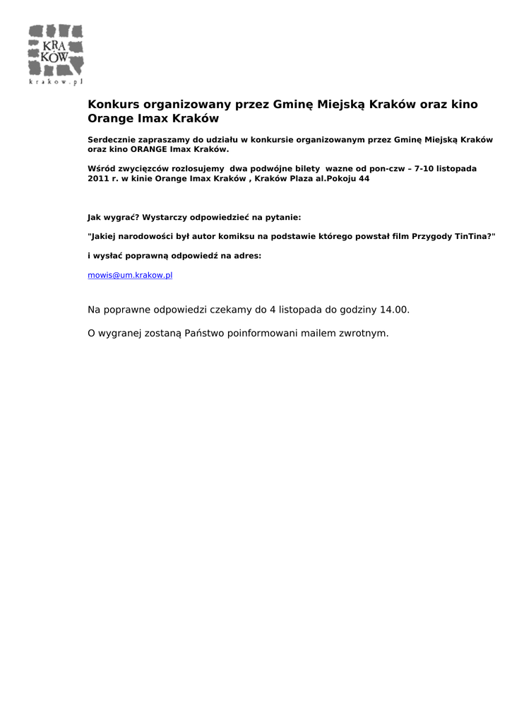 Konkurs organizowany przez Gminę Miejską Kraków oraz kino Orange Imax Kraków Serdecznie zapraszamy do udziału w konkursie organizowanym przez Gminę Miejską Kraków oraz kino ORANGE Imax Kraków. Wśród zwycięzców rozlosujemy dwa podwójne bilety wazne od pon-czw – 7-10 listopada 2011 r. w kinie Orange Imax Kraków , Kraków Plaza al.Pokoju 44 Jak wygrać? Wystarczy odpowiedzieć na pytanie: "Jakiej narodowości był autor komiksu na podstawie którego powstał film Przygody TinTina?" i wysłać poprawną odpowiedź na adres: [email protected] Na poprawne odpowiedzi czekamy do 4 listopada do godziny 14.00. O wygranej zostaną Państwo poinformowani mailem zwrotnym. Powered by TCPDF (www.tcpdf.org)
