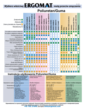 Rev. 10/15 Wybierz właściwą matę przeciw-zmęczeniu Hygiene Nitril Smooth ESD-CON. Nitril Smooth/ Plano Industry Nitril ESD-Conductive Nitril Nitro Softline BASIC PLANO BASIC SMOOTH BASIC BUBBLE BUBBLE DOWN INFINITY ULTRA-SMOOTH INFINITY SMOOTH INFINITY BUBBLE INFINITY SMOOTH ESD INFINITY BUBBLE ESD DELUXE EFS COMPLETE SMOOTH Niezalecany EFB COMPLETE BUBBLE Zmienny (skontaktuj się z Ergomat) CLASSIC Zalecany COMPLETE SMOOTH Znakomity COMPLETE BUBBLE Poliuretan/Guma Do użytku w suchych miejscach Do użytku w wilgotnych miejscach Kontrola statyczności Ognioodporny Zapobiega poślizgnięciu Miejsce spawalnicze/Niedopałki Maty specjalne/Rysunki Zewnętrzne Oleje mineralne Oleje roślinne Płyny chłodzące/tnące Tnące oleje/ciecze włącznie z estrami i aminami Ciecze zasadowe pH: 7-9,5 Ciecze zasadowe pH: 9,5-14 Kwasy pH: 2-7 Kwasy pH: 0-2 Środki dezynfekujące Chlorki rozpuszczalne w wodzie Rozpuszczalniki (aromatyczne/alifatyczne) Ftalany (i związane zmiękczacze)/Ketony/ Aldehydy/Estry/Zasady) Alkohol Instrukcja użytkowania Poliuretan/Guma Classic/Complete Bubble/ Complete Smooth/Basic Bubble/Basic Smooth /EFB/EFS/ Bubble Down/ Basic Plano Odpowiedni do użytku Suche miejsca Temperatura 40° to 95° F 5° to 35° C Czyszczenie • Zamiatanie • Odkurzanie Mycie delikatnym środkiem (pH: 2-9,5). Jeśli spód maty zostanie zamoczony podczas mycia,mata musi leżeć spodem do góry do całkowitego osuszenia z wilgoci Deluxe/Infinity Bubble/ Infinity Smooth Softline/Nitro/Nitril/Nitril ESD/ Nitril CON/Nitril F/Industry/ Plano/Plano ESD/Plano CON Hygiene/Safe Mat/ Super Safe-Mat Suche miejsca Suche i mokre miejsca Suche i mokre miejsca 40° to 95° F 5° to 35° C -40° to 195° F -40° to 90° C -40° to 250° F -40° to 120° C • Zamiatanie • Odkurzanie • Mycie na mokro delikatnym środkiem (pH 5-9) • Jeśli spód maty zostanie zamoczony podczas mycia, mata musi leżeć spodem do góry do całkowitego osuszenia z wilgoci. • Zamiatanie • Odkurzanie • Mycie na mokro za pomocą wody i środka czyszczącego (pH 5-9) • Mycie pod ciśnieniem 1,000 1,500 PSI (70-100 BAR) na minimalnej przestrzeni 20 cm • Autoklawizowany jedynie w wielkości 60 x 90 cm • Suszyć matę w pozycji płaskiej. Unikać zaginania. • Zamiatanie • Odkurzanie • Mycie na mokro za pomocą wody i środka czyszczącego (pH 1-13) • Mycie pod ciśnieniem 1,000 - 1,500 PSI (70-100 BAR) na minimalnej przestrzeni 20 cm • Autoklawizowany jedynie w wielkości 60 x 90 cm • Suszyć matę w pozycji płaskiej.Unikać zaginania. Odpowiedzialność za czyszczenie maty ponosi użytkownik. Gwarancja będzie unieważniona w przypadku mat czyszczonych w nieodpowiedni sposób. Jeśli masz dodatkowe pytania, skontaktuj się z dystrybutorem, zadzwoń +45 702 21840, lub napisz [email protected]