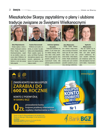 2 Święta www.smnaskarpie.pl Widok ze Skarpy Mieszkańców Skarpy zapytaliśmy o plany i ulubione tradycje związane ze Świętami Wielkanocnymi Alina Wojciechowska Święta spędzę w domu z rodziną. Tradycyjnie czytamy Pismo Święte, fragment o Zmartwychwstaniu, wspólnie się modlimy i jemy uroczysty obiad. Wielkanoc nie może odbyć się bez spaceru, któremu w tym roku sprzyja ładna pogoda. reklama Czesław Barszczewski Wielkanoc jak zwykle z rodzinką, na wesoło. Są jajka, babka, żurek z białą kiełbaską. Potem wspólny spacer do parku, nad Wisłę. Przychodzi obowiązkowo zajączek, mam prezenty zaplanowane, ale jeszcze nie kupione, jeszcze zdążę je znaleźć. Andrianna ZgolińskaKuczyńska Tradycyjnie podzielimy się jajkiem, co jest chyba typowo lokalną tradycją. Wcześniej dzieci zrobią pisanki. Musi przyjść zajączek, który prezenty podrzuca do wyczyszczonych butów, albo podczas spaceru za drzewem w lesie. Anna Majerowska Święta spędzę tradycyjnie z rodziną u mojej mamy. Jako, że pracuję w kwiaciarni ważna jest dla mnie ozdoba stołu. Będą to żywe, wiosenne kwiaty - lubię tulipany, żonkile. Pisanki pomalowane zostaną przez syna woskiem pszczelim i pisakami, przy pomocy starszego rodzeństwa. Agnieszka Matuszewska Mój syn wybiera się na żużel obejrzeć turniej Złoty Kask, sam sobie sprawił prezent wielkanocny. Naszym rytuałem rodzinnym jest świąteczny spacer. Na stole obowiązkowo musi być sernik babka i faszerowane jajka.