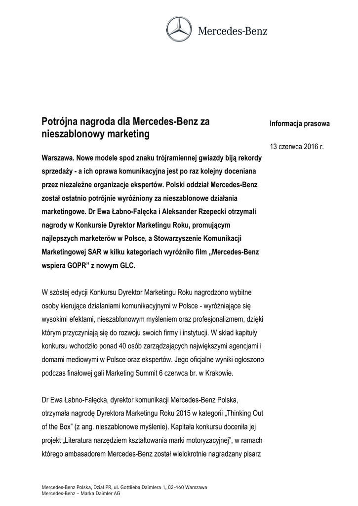 Potrójna nagroda dla Mercedes-Benz za nieszablonowy marketing Informacja prasowa 13 czerwca 2016 r. Warszawa. Nowe modele spod znaku trójramiennej gwiazdy biją rekordy sprzedaży - a ich oprawa komunikacyjna jest po raz kolejny doceniana przez niezależne organizacje ekspertów. Polski oddział Mercedes-Benz został ostatnio potrójnie wyróżniony za nieszablonowe działania marketingowe. Dr Ewa Łabno-Falęcka i Aleksander Rzepecki otrzymali nagrody w Konkursie Dyrektor Marketingu Roku, promującym najlepszych marketerów w Polsce, a Stowarzyszenie Komunikacji Marketingowej SAR w kilku kategoriach wyróżniło film „Mercedes-Benz wspiera GOPR” z nowym GLC. W szóstej edycji Konkursu Dyrektor Marketingu Roku nagrodzono wybitne osoby kierujące działaniami komunikacyjnymi w Polsce - wyróżniające się wysokimi efektami, nieszablonowym myśleniem oraz profesjonalizmem, dzięki którym przyczyniają się do rozwoju swoich firmy i instytucji. W skład kapituły konkursu wchodziło ponad 40 osób zarządzających największymi agencjami i domami mediowymi w Polsce oraz ekspertów. Jego oficjalne wyniki ogłoszono podczas finałowej gali Marketing Summit 6 czerwca br. w Krakowie. Dr Ewa Łabno-Falęcka, dyrektor komunikacji Mercedes-Benz Polska, otrzymała nagrodę Dyrektora Marketingu Roku 2015 w kategorii „Thinking Out of the Box” (z ang. nieszablonowe myślenie). Kapitała konkursu doceniła jej projekt „Literatura narzędziem kształtowania marki motoryzacyjnej”, w ramach którego ambasadorem Mercedes-Benz został wielokrotnie nagradzany pisarz Mercedes-Benz Polska, Dział PR, ul. Gottlieba Daimlera 1, 02-460 Warszawa Mercedes-Benz – Marka Daimler AG Strona 2 Szczepan Twardoch. Kampania z jego udziałem wywołała żywą, narodową debatę na temat roli literatury i kultury w polskim społeczeństwie. Aleksander Rzepecki, specjalista komunikacji produktu Mercedes-Benz Polska, otrzymał nagrodę w kategorii „Wysoka efektywność marketingowa B2B Marketing”. Jury doceniło jego projekt siłowni zewnętrznych dla kierowców zawodowych, oparty na prozdrowotnych założeniach. W ramach projektu w całej Polsce, przy największych stacjach benzynowych, powstało ponad 50 siłowni plenerowych dla kierowców ciężarówek wszystkich marek. Pod koniec maja w Teatrze Polskim w Warszawie odbyło się z kolei rozstrzygnięcie najważniejszego konkursu reklamowego w Polsce, organizowanego przez Stowarzyszenie Komunikacji Marketingowej SAR. Film Mercedes-Benz Polska pt. „Mercedes-Benz wspiera GOPR” z udziałem nowego GLC oraz ratowników górskich otrzymał szereg prestiżowych nagród Klubu Twórców Reklamy 2016: brąz w kategorii Reżyseria oraz srebra w kategoriach Production Excellence, Korekcja barwna zdjęć i Zdjęcia. Można go obejrzeć pod adresem: https://www.youtube.com/watch?v=rey1TxJE2_E Kontakt: Aleksander Rzepecki e-mail: [email protected] tel. +48 22 312 72 22 Mercedes-Benz Polska, Dział PR, ul. Gottlieba Daimlera 1, 02-460 Warszawa Mercedes-Benz – Marka Daimler AG