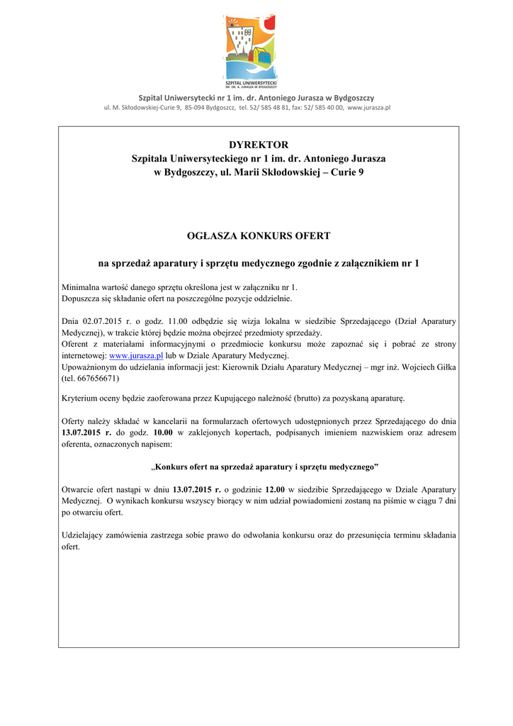 Szpital Uniwersytecki nr 1 im. dr. Antoniego Jurasza w Bydgoszczy ul. M. Skłodowskiej-Curie 9, 85-094 Bydgoszcz, tel. 52/ 585 48 81, fax: 52/ 585 40 00, www.jurasza.pl DYREKTOR Szpitala Uniwersyteckiego nr 1 im. dr. Antoniego Jurasza w Bydgoszczy, ul. Marii Skłodowskiej – Curie 9 OGŁASZA KONKURS OFERT na sprzedaż aparatury i sprzętu medycznego zgodnie z załącznikiem nr 1 Minimalna wartość danego sprzętu określona jest w załączniku nr 1. Dopuszcza się składanie ofert na poszczególne pozycje oddzielnie. Dnia 02.07.2015 r. o godz. 11.00 odbędzie się wizja lokalna w siedzibie Sprzedającego (Dział Aparatury Medycznej), w trakcie której będzie można obejrzeć przedmioty sprzedaży. Oferent z materiałami informacyjnymi o przedmiocie konkursu może zapoznać się i pobrać ze strony internetowej: www.jurasza.pl lub w Dziale Aparatury Medycznej. Upoważnionym do udzielania informacji jest: Kierownik Działu Aparatury Medycznej – mgr inż. Wojciech Giłka (tel. 667656671) Kryterium oceny będzie zaoferowana przez Kupującego należność (brutto) za pozyskaną aparaturę. Oferty należy składać w kancelarii na formularzach ofertowych udostępnionych przez Sprzedającego do dnia 13.07.2015 r. do godz. 10.00 w zaklejonych kopertach, podpisanych imieniem nazwiskiem oraz adresem oferenta, oznaczonych napisem: „Konkurs ofert na sprzedaż aparatury i sprzętu medycznego” Otwarcie ofert nastąpi w dniu 13.07.2015 r. o godzinie 12.00 w siedzibie Sprzedającego w Dziale Aparatury Medycznej. O wynikach konkursu wszyscy biorący w nim udział powiadomieni zostaną na piśmie w ciągu 7 dni po otwarciu ofert. Udzielający zamówienia zastrzega sobie prawo do odwołania konkursu oraz do przesunięcia terminu składania ofert.