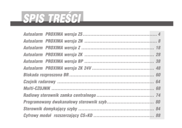 SPIS TRECI Autoalarm PROXIMA wersja ZS ................................................. 4 Autoalarm PROXIMA wersja ZN ................................................ 8 Autoalarm PROXIMA wersja Z ................................................ 18 Autoalarm PROXIMA wersja ZK .............................................. 28 Autoalarm PROXIMA wersja BP .............................................. 38 Autoalarm PROXIMA wersja ZK 24V ......................................... 48 Blokada rozproszona BR ........................................................ 60 Czujnik radarowy ................................................................ 64 Multi-CZUJNIK .................................................................... 68 Radiowy sterownik zamka centralnego ...................................... 74 Programowany dwukana³owy sterownik szyb............................... 80 Sterownik domykaj¹cy szyby .................................................. 84 Cyfrowy modu³ rozszerzaj¹cy CS+KD ........................................ 88 Immobiliser PROXIMA DALLAS Micro DM2 .................................. 92 Immobiliser PROXIMA-DALLAS DP2 ........................................... 96 lmmobiliser PROXIMA PT2 PROXIMA-DALLAS DP2K i DPK2 24V ....... 100 Imobiliser PROXIMA - KIDNAPER ............................................ 110 IMMOBILISER PROXIMA PEN .................................................. 118 INSTRUKCJA TECHNICZNA Wydanie ósme Wydawca: PROXIMA S.C. 87-100 Toruń; ul. Filtrowa 23 tel./fax (056) 660 2000 fax (056) 660 2241 www.proxima.pl Nakład: 2 000 szt. Druk: Drukarnia GRAFIKA 85-796 Bydgoszcz; ul. Pod Skarpą 51 Skład: KONCEPT Design 85 - 791 Bydgoszcz; ul. Daszyńskiego 11 tel./fax (052) 3485644 www.design.com.pl PRODUKUJEMY Od 14 lat zajmujemy się techniką alarmową. Od 9 lat produkujemy systemy alarmowe. Pierwsi w Polsce wyprodukowliśmy: w w w w w w w w w w w w w w autoalarm ze zmiennym kodem, autoalarm konfigurowany programatorem radiowym, immobiliser na klucz Dallas, immobiliser przeciwporwaniowy KIDNAPER uaktywniany otwarciem drzwi i czasem jazdy, autoalarm z blokadą przeciwporwaniową, immobiliser transponderowy, blokadę rozproszoną wykorzystującą oryginalną instalację samochodu, dwustrefowy czujnik mikrofalowy, magnetyczny czujnik położenia, mikroprocesorowy sterownik szyb przywracajacy pozycję szyb, autoalarm i immobiliser 24V, immobiliser wykorzystujący ogólnopolską sieć pagerową METRO BIP, cyfrowe sterowanie syreną alarmową, najmniejszy polski immobiliser PROXIMA MIKRO. Ostatnią naszą nowością jest zastosowanie w immobiliserze nie tylko w po raz pierwszy w Polsce ale nawet na świecie - klucza rotacyjnego. Nowością jest także bezobsługowy immobiliser PROXIMA PEN. IMMOBILISER PROXIMA PEN 118. Urządzenie rozpoznaje swojego właściciela, samochód nie daje się uruchomić obcemu, a nawet gdy właściciel zostanie zmuszony do opuszczenia uruchomoinego pojazdu to po niedługim czasie urządzenie zatrzyma samochód i włączy sygnalizację alarmową. OPIS TECHNICZNY Immobiliser PROXIMA PEN Kto nie chciałby żeby samochód rozpoznawał swojego właściciela? Nie tylko nie dawał uruchomić się obcemu, nie pozwalał na otwarcie drzwi, ale nawet gdy właściciel zostanie zmuszony do opuszczenia pojazdu podczas jazdy po niedługim czasie sam się zatrzymał i włączył sygnalizację alarmową. Wszystko co należy do obowiązków właściciela to posiadać przy sobie elektroniczny klucz. Klucz może mieć różną formę, długopisu, breloka, itp. Automatyczne wykrywanie klucza elektronicznego następuje co około 12s z odległości około 2m. Urządzenie jest programowane i może zapewniać różne stopnie ochrony. Wyższe stopnie ochrony zapewniają wyższy poziom bezpieczeństwa ale również wymagają bardziej wnikliwego użytkowania. Podstawową konfiguracją jest praca tylko jako: 1. Immobiliser. Po upływie 20 s po wyłączeniu stacyjki następuje automatyczne uzbrojenie immobilisera. Po powrocie do samochodu następuje automatyczne rozpoznanie właściciela (posiadającego klucz elektroniczny) i odblokowanie samochodu. Przekręcenie stacyjki gdy blokada jest uzbrojona sygnalizowane jest syreną (jeżeli jest zainstalowana). Chroni przed kradzieżą samochodu pozostawionego bez opieki. Nie chroni przed otwarciem drzwi i nie chroni przed porwaniem. Większą ochronę zapewnia: 2. Immobiliser + alarm. Po upływie 20 s po wyłączeniu stacyjki następuje automatyczne uzbrojenie immobilisera. Po powrocie do samochodu następuje automatyczne rozpoznanie właściciela (posiadającego klucz elektroniczny) i odblokowanie samochodu. Jeżeli przed otwarciem drzwi lub 30s po otwarciu (opcja programowana) nie zostanie wykryty klucz elektroniczny to załącza się syrena alarmowa i kierunkowskazy (na ok. 30s). Chroni przed kradzieżą samochodu pozostawionego bez opieki oraz w ograniczony sposób przed jego okradzeniem. Największą ochronę zapewnia: 3. Immobiliser (może być z alarmem lub bez) + blokada przeciwporwaniowa. Immobiliser i alarm działa w sposób opisany wyżej. Dodatkowo jeżeli w trakcie jazdy po zaprogramowanym czasie nie zostanie automatycznie wykryty klucz elektroniczny samochód zastaje zatrzymany i włącza się sygnalizacja alarmowa. Auto chronione jest więc również w czasie jazdy, gdy samochód jest uruchomiony, a immobiliser (i alarm) wyłączony. str. 119 • OPIS TECHNICZNY Immobiliser PROXIMA PEN Skuteczne w sytuacjach gdy kierowca zmuszony jest do opuszczenia samochodu bez jego wyłączania i dotykania czegokolwiek. Złodziej ma nieco czasu (30s, 1,2,4 lub 8min) na odjechanie, a kierowca na opuszczenie miejsca kradzieży. Po tym czasie silnik zostaje wyłączony i dodatkowo włącza się sygnalizacja akustyczna i optyczna. Co można programować? 1. Szybkie lub wolne uzbrajanie immobilisera - 2 możliwości programowania. Po wyłączeniu stacyjki blokada może automatycznie uzbroić się po 20s (uzbrajanie szyb