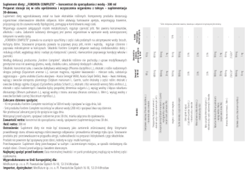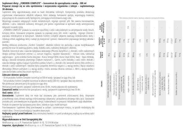 1 mg 10 mg 100 mg 25 GDU* 1000 mg Borówka czarna (Vaccinium myrtillus) 250 GDU* 5 mg 100 mg 50 mg 1000 mg Ananas (Ananas comosus L. Merr.) - 100 mg Rabarbar dłoniasty (Rheum palmatum) – wyciąg wodny z kłącza; (w tym stand. reina 5%) 1000 mg - 33 % 33 % - Bylica pospolita (Artemisia vulgaris L.) - ekstrakt suchy z części nadziemnych i kwiatów 33 % 33 % Winorośl winna (Vitis vinifera L.) - ekstrakt suchy z liści - 33 % Dziki ogórek (Caigua) (Cyclanthera pedata Schard L.) – ekstrakt suchy z owoców 33 % 1000 mg Suche ekstrakty z części roślin w tym: 100 mg 56 mg 560 mg magnez – siarczan magnezu - 2 mg 20 mg 15% 100 mg 1000 mg 10,3 g 600 mg 103 g 6000 mg Skrzyp polny (Equisetum arvense L.) - ekstrakt suchy z roślin nadziemnych (4:1) Ostropest plamisty (Silybum marianum L. Gaertn) - wyciąg wodny z owoców; (w tym stand. sylimaryna 2%) Zawartość w 100 ml Składniki: Zawartość w dziennej porcji do spożycia tj. 10 ml % RWS Referencyjna Wartość Spożycia *GDU- żelatynowa jednostka trawienia, świadcząca o aktywności enzymatycznej Bromelainy. Daktylowiec właściwy (Phoenix dactylifera L.) – koncentrat soku z owoców Suplement diety: „FORDREN COMPLETE” – koncentrat do sporządzania z wodą - 300 ml Preparat stosuje się w celu opróżnienia i oczyszczenia organizmu z toksyn – suplementacja 30-dniowa. Suplement diety wyprodukowany został na bazie ekstraktów roślinnych. Komponenty produktu dostarczają organizmowi zrównoważone składniki odżywcze, które ułatwiają hamowanie apetytu, wspomagają trawienie, przyczyniają się do usuwania wody fizjologicznej, pomagają w kontrolowaniu wagi ciała. Wspomaga usuwanie zalegających resztek metabolicznych, reguluje czynność jelit. Nie zawiera konserwantów, alkoholu i cukru. Zadaniem substancji drenującej jest pomoc organizmowi w wymianie wody zanieczyszczonej toksynami na wodę czystą. „FORDREN COMPLETE” pozwala na usunięcie opuchlizny z części ciała podatnych na zatrzymywanie wody: brzuch, kończyny dolne. Stosowanie preparatu pozwala na poprawę pracy jelit, nerek i wątroby, reguluje ciśnienie i poprawia mikrokrążenie w kończynach. Składniki Fordren Complete aktywnie zwalczają niedoskonałości skóry i redukują cellulit, wygładzają skórę i nadaje jej elastyczność i jasność, równocześnie poprawiając kondycję włosów i paznokci. Według deklaracji producenta „Fordren Complete”, składniki roślinne nie pochodzą z upraw modyfikowanych genetycznie oraz nie zawierają glutenu, wody, dodatku cukru, substancji słodzących i alkoholu. Składniki: koncentrat soku z owoców daktylowca właściwego (Phoenix dactylifera L.), ekstrakt z roślin nadziemnych skrzypu polnego (Equisetum arvense L.), siarczan magnezu, regulator kwasowości – mleczan sodu, substancja zagęszczająca – guma arabska (Guma akacjowa - Acacia Senegal Willd, Acacia Seyal Delile), kwas – kwas mlekowy, wyciąg z owoców ostropestu plamistego (Silybum marianum L. Gaertn, suche ekstrakty z części roślin: ekstrakt z owoców dzikiego ogórka (Caigua) (Cyclanthera pedata Schard L.), ekstrakt z liści winorośli winnej (Vitis vinifera L.), ekstrakt z części nadziemnych i kwiatów bylicy pospolitej (Artemisia vulgaris L.), wyciąg wodny z kłącza rabarbaru dłoniastego (Rheum palmatum L.), wyciąg wodny z trzonu ananasa (Ananas comosus L. Merr.), wyciąg wodny z owoców borówki czarnej (Vaccinium myrtillus L.). Zalecane dzienne spożycie: - 10 ml produktu Fordren Complete rozcieńczyć w 500 ml wody i spożywać w ciągu dnia, lub - 5ml produktu Fordren Complete rozcieńczyć w szklance wody (200 ml) i spożywać dwa razy dziennie. Nie przekraczać zalecanej porcji do spożycia w ciągu dnia. Wstrząsnąć przed użyciem, spożywać codziennie przez 30 dni, miarka załączona do opakowania. Zawartość netto: koncentrat do sporządzania z wodą, spożywanie (suplementacja) trwa 30 dni. Ilość netto: 300 ml Ostrzeżenie: Suplement diety nie może być stosowany jako zamiennik zróżnicowanej diety. Utrzymanie prawidłowego stanu zdrowia wymaga zróżnicowanego odżywiania i prowadzenia zdrowego trybu życia. Stosowanie produktu jest przeciwwskazane w przypadku alergii, nadwrażliwości na preparat i którykolwiek z jego składników. Produkt nie powinien być spożywany przez dzieci, kobiety w ciąży i matki karmiące. Przechowywanie: Suplement diety przechowywać w suchym i zaciemnionym miejscu, w sposób niedostępny dla małych dzieci. Chronić przed wilgocią i światłem słonecznym. Najlepiej spożyć przed końcem: Data minimalnej trwałości i nr partii produkcyjnej znajdują się w dolnej części opakowania. Wyprodukowano w Unii Europejskiej dla: MedFuture sp. z o. o. Pl. Powstańców Śląskich 16-18, 53-314 Wrocław Importer, dystrybutor: MedFuture sp. z o. o. Pl. Powstańców Śląskich 16-18, 53-314 Wrocław