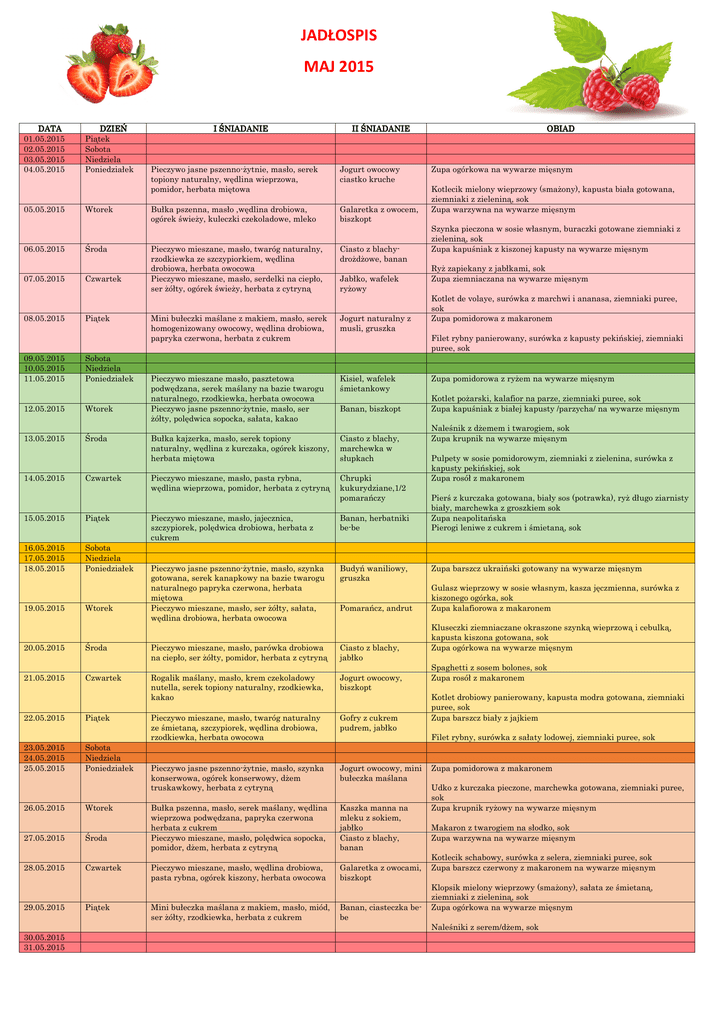JADŁOSPIS MAJ 2015 DATA 01.05.2015 02.05.2015 03.05.2015 04.05.2015 05.05.2015 DZIEŃ Piątek Sobota Niedziela Poniedziałek Wtorek 06.05.2015 Środa 07.05.2015 Czwartek 08.05.2015 Piątek 09.05.2015 10.05.2015 11.05.2015 Sobota Niedziela Poniedziałek 12.05.2015 Wtorek 13.05.2015 Środa 14.05.2015 Czwartek 15.05.2015 Piątek 16.05.2015 17.05.2015 18.05.2015 Sobota Niedziela Poniedziałek 19.05.2015 Wtorek I ŚNIADANIE II ŚNIADANIE Pieczywo jasne pszenno-Ŝytnie, masło, serek topiony naturalny, wędlina wieprzowa, pomidor, herbata miętowa Jogurt owocowy ciastko kruche Bułka pszenna, masło ,wędlina drobiowa, ogórek świeŜy, kuleczki czekoladowe, mleko Galaretka z owocem, biszkopt Pieczywo mieszane, masło, twaróg naturalny, rzodkiewka ze szczypiorkiem, wędlina drobiowa, herbata owocowa Pieczywo mieszane, masło, serdelki na ciepło, ser Ŝółty, ogórek świeŜy, herbata z cytryną Ciasto z blachydroŜdŜowe, banan Jabłko, wafelek ryŜowy Mini bułeczki maślane z makiem, masło, serek homogenizowany owocowy, wędlina drobiowa, papryka czerwona, herbata z cukrem Jogurt naturalny z musli, gruszka Pieczywo mieszane masło, pasztetowa podwędzana, serek maślany na bazie twarogu naturalnego, rzodkiewka, herbata owocowa Pieczywo jasne pszenno-Ŝytnie, masło, ser Ŝółty, polędwica sopocka, sałata, kakao Kisiel, wafelek śmietankowy Bułka kajzerka, masło, serek topiony naturalny, wędlina z kurczaka, ogórek kiszony, herbata miętowa Ciasto z blachy, marchewka w słupkach Pieczywo mieszane, masło, pasta rybna, wędlina wieprzowa, pomidor, herbata z cytryną Chrupki kukurydziane,1/2 pomarańczy Banan, biszkopt Pieczywo mieszane, masło, jajecznica, szczypiorek, polędwica drobiowa, herbata z cukrem Banan, herbatniki be-be Pieczywo jasne pszenno-Ŝytnie, masło, szynka gotowana, serek kanapkowy na bazie twarogu naturalnego papryka czerwona, herbata miętowa Pieczywo mieszane, masło, ser Ŝółty, sałata, wędlina drobiowa, herbata owocowa Budyń waniliowy, gruszka Pomarańcz, andrut Środa Pieczywo mieszane, masło, parówka drobiowa na ciepło, ser Ŝółty, pomidor, herbata z cytryną Ciasto z blachy, jabłko 21.05.2015 Czwartek Rogalik maślany, masło, krem czekoladowy nutella, serek topiony naturalny, rzodkiewka, kakao Jogurt owocowy, biszkopt Pieczywo mieszane, masło, twaróg naturalny ze śmietaną, szczypiorek, wędlina drobiowa, rzodkiewka, herbata owocowa Gofry z cukrem pudrem, jabłko Pieczywo jasne pszenno-Ŝytnie, masło, szynka konserwowa, ogórek konserwowy, dŜem truskawkowy, herbata z cytryną Jogurt owocowy, mini bułeczka maślana Bułka pszenna, masło, serek maślany, wędlina wieprzowa podwędzana, papryka czerwona herbata z cukrem Pieczywo mieszane, masło, polędwica sopocka, pomidor, dŜem, herbata z cytryną Kaszka manna na mleku z sokiem, jabłko Ciasto z blachy, banan Pieczywo mieszane, masło, wędlina drobiowa, pasta rybna, ogórek kiszony, herbata owocowa Galaretka z owocami, biszkopt Piątek 23.05.2015 24.05.2015 25.05.2015 Sobota Niedziela Poniedziałek 26.05.2015 Wtorek 27.05.2015 Środa 28.05.2015 Czwartek 29.05.2015 Piątek Mini bułeczka maślana z makiem, masło, miód, ser Ŝółty, rzodkiewka, herbata z cukrem Zupa ogórkowa na wywarze mięsnym Kotlecik mielony wieprzowy (smaŜony), kapusta biała gotowana, ziemniaki z zieleniną, sok Zupa warzywna na wywarze mięsnym Szynka pieczona w sosie własnym, buraczki gotowane ziemniaki z zieleniną, sok Zupa kapuśniak z kiszonej kapusty na wywarze mięsnym RyŜ zapiekany z jabłkami, sok Zupa ziemniaczana na wywarze mięsnym Kotlet de volaye, surówka z marchwi i ananasa, ziemniaki puree, sok Zupa pomidorowa z makaronem Filet rybny panierowany, surówka z kapusty pekińskiej, ziemniaki puree, sok 20.05.2015 22.05.2015 OBIAD Zupa pomidorowa z ryŜem na wywarze mięsnym Kotlet poŜarski, kalafior na parze, ziemniaki puree, sok Zupa kapuśniak z białej kapusty /parzycha/ na wywarze mięsnym Naleśnik z dŜemem i twarogiem, sok Zupa krupnik na wywarze mięsnym Pulpety w sosie pomidorowym, ziemniaki z zielenina, surówka z kapusty pekińskiej, sok Zupa rosół z makaronem Pierś z kurczaka gotowana, biały sos (potrawka), ryŜ długo ziarnisty biały, marchewka z groszkiem sok Zupa neapolitańska Pierogi leniwe z cukrem i śmietaną, sok Zupa barszcz ukraiński gotowany na wywarze mięsnym Gulasz wieprzowy w sosie własnym, kasza jęczmienna, surówka z kiszonego ogórka, sok Zupa kalafiorowa z makaronem Kluseczki ziemniaczane okraszone szynką wieprzową i cebulką, kapusta kiszona gotowana, sok Zupa ogórkowa na wywarze mięsnym Spaghetti z sosem bolones, sok Zupa rosół z makaronem Kotlet drobiowy panierowany, kapusta modra gotowana, ziemniaki puree, sok Zupa barszcz biały z jajkiem Filet rybny, surówka z sałaty lodowej, ziemniaki puree, sok Banan, ciasteczka bebe Zupa pomidorowa z makaronem Udko z kurczaka pieczone, marchewka gotowana, ziemniaki puree, sok Zupa krupnik ryŜowy na wywarze mięsnym Makaron z twarogiem na słodko, sok Zupa warzywna na wywarze mięsnym Kotlecik schabowy, surówka z selera, ziemniaki puree, sok Zupa barszcz czerwony z makaronem na wywarze mięsnym Klopsik mielony wieprzowy (smaŜony), sałata ze śmietaną, ziemniaki z zieleniną, sok Zupa ogórkowa na wywarze mięsnym Naleśniki z serem/dŜem, sok 30.05.2015 31.05.2015