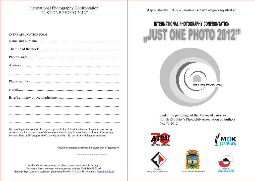 International Photography Confrontation “JUST ONE PHOTO 2012” Miejski Ośrodek Kultury w Jarosławiu Klub Fotograficzny Atest 70 INTERNATIONAL PHOTOGRAPHY CONFRONTATION ENTRY APPLICATION FORM Name and Surname......................................................................................... ,,JUST ONE PHOTO 2012” The title of the work........................................................................................ Photo's sizes.................................................................................................... Address............................................................................................................ ......................................................................................................................... Phone number.................................................................................................. e-mail............................................................................................................... Brief summary of accomplishments................................................................ ......................................................................................................................... ......................................................................................................................... .......................................................................................................................... By enrolling to the contest I hereby accept the Rules of Participation and I agree to process my personal data for the purpose of the contest and marketing in accordance with Act of Protecting Personal Data of 29th August 1997 (Law Gazette Nr. 133, pos. 883 with later amendments) Under the patronage of the Mayor of Jarosław, Polish Republic’s Photoclub Association of Authors No. 77/2012 7 MOK JAROSŁAW KLUB FOTOGRAFICZNY Readable signature confirms the acceptance of regulation ............................................ Further details concerning the photo contest are available through: Krzysztof Mruk contest's curator; phone number 0048 16 621 32 94 Marzena Stęc contest's secretary; phone number 0048 16 621 58 44; email: [email protected] Fundacja „Fotografia dla Przyszłości” Urząd Miasta Jarosławia FOTOKLUB RZECZYPOSPOLIT EJ POLSKIE J STOWARZYSZENIE TWÓRCÓW INTERNATIONAL PHOTOGRAPHY CONFRONTATION “JUST ONE PHOTO 2012” REGULATION RULES OF PARTICIPATION 1.The confrontation is organized in the form of open contest and is open available for every photographer in the world. 2.Each participant will present only one photo,taken during three passed years considered by the author as the best - monochrome or color, with no predefined technique. Each submitted photo must be signed overleaf. Each author should include a nick, the photo’s title and year when photo was taken. In a sealed, signed envelope each participant schould include on CD/DVD digital version of the photo and legibly completed entry application with declaration concerning the autorship of work. 3.Photo formats should be in ranges of 30 x 45 to 70 x 100 cm The entry photo cannot be glued or framed. 4.It is possible to send the entry work via email (JPG format) on the following email address: [email protected] with annotation Just One Photo. The reprint will be developed by the organizing party (maximum format 30 x 45 cm). 5.The Jury appointed by the organizing party will be responsible for appraisal and judgment, distribution of prizes and selecting the works for the catalogue and for the exhibition. The decisions of the jury are final and without appeal. 6.The legal rights for awarded and prized works will be forwarded to the organizing party. 7.Every contestant of the post-contest exhibition will receive a commemorative catalogue with selected works. 8.The organizers reserve the right for repeated, free of charge distribution, recording, storing and copying of the works for the needs of the contest, namely the presentation of the exhibition, reproduction in the catalogue, media, Internet and also for the occasional marketing oriented publications promoting the contest. 9.All the works not fulfilling the described rules of participation will not be considered by the Jury. 10.All the works entered for the previous editions of the Photography Confrontation “Just One Photo” will not be considered by the Jury. 11.The organizing party shall not be held responsible for any losses or damages resulting from the transport of the works. 12. The participation in the competition must be accompanied by the entry fee of PLN 30.00 (thirty Polish Złoty) or EUR 10.00 (ten Euro), in addition all the works send by email should include additional fee for photo's development of PLN 15.00 (fifteen Polish Złoty) or EUR 5.00 (five Euro) paid on the following bank account: Miejski Ośrodek Kultury w Jarosławiu PODKARPACKI BANK SPÓ£DZIELCZY O/ JAROS£AW 56 8642 1155 2015 1506 5519 0001 with annotation “JUST ONE PHOTO 2012”, name, last name and the address of the contestant taking part in the contest 13.The works shall be sent to the following address: Miejski Ośrodek Kultury Pl. A. Mickiewicza 6 37-500 Jarosław - Polska with annotation “JUST ONE PHOTO 2012” 14.By sending the photo the contestant hereby declares to be the holder of copyrights to the entered work, all the portrayed people's rights were settled and the contestant holds permissions of all people to use their image for the purpose of the contest. (in accordance with Act of 4th February 1994 with later amendments of copyrights and neighboring rights). 15.By enrolling to the contest the contestant hereby accepts the Rules of Participation and agrees to process his/her personal data for the purpose of the contest and marketing in accordance with Act of Protecting Personal Data of 29th August 1997 (Law Gazette Nr. 133, pos. 883 with later amendments). 16.The Organizing party shall not be held responsible 