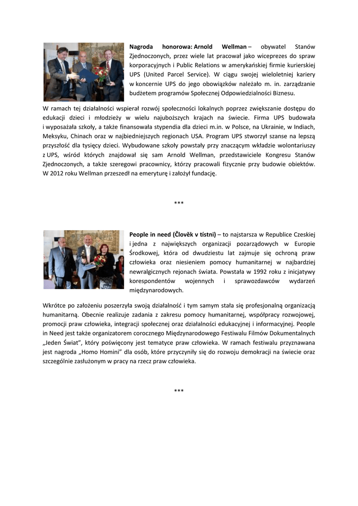Nagroda honorowa: Arnold Wellman – obywatel Stanów Zjednoczonych, przez wiele lat pracował jako wiceprezes do spraw korporacyjnych i Public Relations w amerykańskiej firmie kurierskiej UPS (United Parcel Service). W ciągu swojej wieloletniej kariery w koncernie UPS do jego obowiązków należało m. in. zarządzanie budżetem programów Społecznej Odpowiedzialności Biznesu. W ramach tej działalności wspierał rozwój społeczności lokalnych poprzez zwiększanie dostępu do edukacji dzieci i młodzieży w wielu najuboższych krajach na świecie. Firma UPS budowała i wyposażała szkoły, a także finansowała stypendia dla dzieci m.in. w Polsce, na Ukrainie, w Indiach, Meksyku, Chinach oraz w najbiedniejszych regionach USA. Program UPS stworzył szanse na lepszą przyszłość dla tysięcy dzieci. Wybudowane szkoły powstały przy znaczącym wkładzie wolontariuszy z UPS, wśród których znajdował się sam Arnold Wellman, przedstawiciele Kongresu Stanów Zjednoczonych, a także szeregowi pracownicy, którzy pracowali fizycznie przy budowie obiektów. W 2012 roku Wellman przeszedł na emeryturę i założył fundację. *** People in need (Človĕk v tístni) – to najstarsza w Republice Czeskiej i jedna z największych organizacji pozarządowych w Europie Środkowej, która od dwudziestu lat zajmuje się ochroną praw człowieka oraz niesieniem pomocy humanitarnej w najbardziej newralgicznych rejonach świata. Powstała w 1992 roku z inicjatywy korespondentów wojennych i sprawozdawców wydarzeń międzynarodowych. Wkrótce po założeniu poszerzyła swoją działalność i tym samym stała się profesjonalną organizacją humanitarną. Obecnie realizuje zadania z zakresu pomocy humanitarnej, współpracy rozwojowej, promocji praw człowieka, integracji społecznej oraz działalności edukacyjnej i informacyjnej. People in Need jest także organizatorem corocznego Międzynarodowego Festiwalu Filmów Dokumentalnych „Jeden Świat”, który poświęcony jest tematyce praw człowieka. W ramach festiwalu przyznawana jest nagroda „Homo Homini” dla osób, które przyczyniły się do rozwoju demokracji na świecie oraz szczególnie zasłużonym w pracy na rzecz praw człowieka. *** Siostra Rafela – Urszula Nałęcz – polska misjonarka i pedagog, twórczyni placówek misyjnych w Indiach, Republice Południowej Afryki oraz Rwandzie. W swoich działaniach szczególnie skupia się na pomocy osieroconym oraz niewidomym dzieciom. W 1954 roku wstąpiła do Zgromadzenia Sióstr Franciszkanek Służebnic Krzyża, śluby wieczyste złożyła w 1963 roku. Była wieloletnim pracownikiem Ośrodka Szkolno-Wychowawczego w Laskach oraz współpracownikiem Prymasowskiego Komitetu Pomocy Osobom Pozbawionym Wolności i ich Rodzinom. Jako misjonarka i pedagog pracowała w Indiach, gdzie założyła ośrodek dla niewidomych dzieci – najpierw sierociniec, a następnie szkołę podstawową z internatem. Pomagała też sierotom i niewidomym w Republice Południowej Afryki. W Rwandzie dzięki jej staraniom powstał pierwszy tego typu Ośrodek Edukacyjny dla Niewidomych w Kibeho. Odznaczona Krzyżem Oficerskim Orderu Odrodzenia Polski przez Prezydenta RP, Bronisława Komorowskiego oraz Bene Merito, Odznaką Honorową Ministra Spraw Zagranicznych. Laureatka nagrody „PONTIFICI – Budowniczemu Mostów”, przyznawanej przez Klub Inteligencji Katolickiej w Warszawie za „zasługi w szerzeniu wartości dobra wspólnego, dialogu i poświęcenia na rzecz bliźnich”.