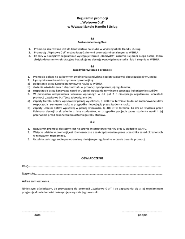 Regulamin promocji ,,Wpisowe 0 zł” w Wyższej Szkole Handlu i Usług &1 Postanowienia ogólne: 1. 2. 3. Promocja skierowana jest do Kandydatów na studia w Wyższej Szkole Handlu i Usług. Promocję ,,Wpisowe 0 zł” można łączyć z innymi promocjami ustalanymi w WSHiU. Ile razy w niniejszym regulaminie występuje termin ,,Kandydat”, rozumie się przez niego osobę, która złożyła dokumenty rekrutacyjne i oczekuje na decyzję o przyjęciu na studia I lub II stopnia w WSHiU. &2 Zasady korzystania z promocji: 1. 2. a) b) c) 3. Promocja polega na całkowitym zwolnieniu Kandydata z opłaty wpisowej obowiązującej w Uczelni. Łącznymi warunkami skorzystania z promocji są: podpisanie przez Kandydata umowy o naukę w WSHiU, złożenie oświadczenia o chęci udziału w promocji i podpisanie jej regulaminu, rozpoczęcie przez kandydata nauki w Uczelni, opłacanie terminowe czesnego i ukończenie studiów. W przypadku niespełnienia warunku opisanego w &2 pkt 2 c niniejszego regulaminu, uczestnik promocji ,,Wpisowe 0 zł” jest zobowiązany do: a) Zapłaty Uczelni opłaty wpisowej w pełnej wysokości , tj. 400 zł w terminie 14 dni od zaplanowanej daty rozpoczęcia I semestru nauki, w przypadku niepodjęcia przez Studenta nauki, b) Zapłaty Uczelni opłaty wpisowej w pełnej wysokości, tj. 400 zł w terminie 14 dni od wydania przez Dziekana decyzji o skreśleniu z listy studentów, w przypadku podjęcia przez studenta nauki i jej przerwania przed zakończeniem ostatniego roku studiów. &3 1. 2. Regulamin promocji dostępny jest na stronie internetowej WSHiU oraz w siedzibie WSHiU. Wzięcie udziału w promocji jest równoznaczne z zaakceptowaniem przez uczestnika zasad określonych w niniejszym regulaminie. 3. Uczelnia zastrzega sobie prawo zmiany niniejszego regulaminu w czasie trwania promocji. OŚWIADCZENIE Imię.......................................................................................................................................................... Nazwisko……………………………………………………………………………………………………………………………………………… Adres zamieszkania……………………………………………………………………………………………………………………………… Niniejszym oświadczam, że przystępuję do promocji ,,Wpisowe 0 zł” i po zapoznaniu się z jej regulaminem przyjmuję do wiadomości i akceptuję wszystkie jego warunki. …………………………………… data ….....….………..……………………… podpis