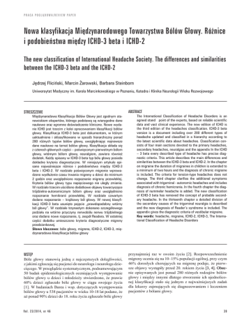 PRACA POGL ĄDOWA/REVIEW PAPER Nowa klasyfikacja Międzynarodowego Towarzystwa Bólów Głowy. Różnice i podobieństwa między ICHD-3 beta i ICHD-2 The new classification of International Headache Society. The differences and similarities between the ICHD-3 beta and the ICHD-2 Jędrzej Fliciński, Marcin Żarowski, Barbara Steinborn Uniwersytet Medyczny im. Karola Marcinkowskiego w Poznaniu, Katedra i Klinika Neurologii Wieku Rozwojowego STRESZCZENIE ABSTRACT WSTĘP przynajmniej raz w swoim życiu [2]. Rozpowszechnienie migreny ocenia się na 10–15% populacji ogólnej, przy czym 46% dorosłych chorujących na migrenę podaje, że pierwsze objawy wystąpiły przed 20. rokiem życia ������������� [3, 4]������� . Obecnie opisywanych jest ponad 280 różnych rodzajów bólów głowy i między innymi dlatego stworzenie ich ujednoliconej klasyfikacji stało się jednym z najważniejszych zadań dla lekarzy zajmujących się diagnozowaniem i leczeniem pacjentów z bólami głowy. Międzynarodowa Klasyfikacja Bólów Głowy jest zgodnym stanowiskiem ekspertów, którego podstawą są wiarygodne dane naukowe oraz ogromne doświadczenie kliniczne. Nowe wydanie ICHD jest trzecim z kolei opracowaniem klasyfikacji bólów głowy. Klasyfikacja ICHD-3 beta jest dokumentem, w którym uaktualniono i sklasyfikowano w sposób hierarchiczny ponad 280 różnych typów bólów głowy, uwzględniając najnowsze dane naukowe na temat bólów głowy. Klasyfikacja składa się z czterech głównych części – poświęconym pierwotnym bólom głowy, wtórnym bólom głowy, neuralgiom, zawiera również dodatek. Każdy opisany w ICHD-3 beta typ bólu głowy posiada dokładne kryteria diagnostyczne. W niniejszym artykule opisano najważniejsze różnice i podobieństwa między ICHD-3 beta i ICHD-2. W rozdziale poświęconym migrenie wprowadzono wydłużenie czasu trwania migreny u dzieci do minimum 2 godzin oraz uwzględniono rozpoznanie migreny przewlekłej. Kryteria bólów głowy typu napięciowego nie uległy zmianie. W rozdziale trzecim uściślono dodatkowe objawy towarzyszące trójdzielno-autonomicznym bólom głowy oraz uwzględniono rozpoznanie hemikranii przewlekłej. W rozdziale czwartym dodano rozpoznanie – krążkowy ból głowy. W nowej klasyfikacji ICHD-3 beta usunięto pojęcie „prawdopodobny wtórny ból głowy”. W rozdziale trzynastym dokonano szczegółowego podziału na wtórne przyczyny nerwobólu nerwu trójdzielnego oraz dodano nowe rozpoznanie, tj. zespół Readera. W ostatniej części dodatku umieszczono kryteria diagnostyczne migreny przedsionkowej. Słowa kluczowe: bóle głowy, migrena, ICHD-2, ICHD-3, międzynarodowa klasyfikacja bólów głowy Bóle głowy stanowią jedną z najczęstszych dolegliwości, z jakimi zgłaszają się pacjenci do neurologa i neurologa dziecięcego. W przeglądzie systematycznym, podsumowującym 50 badań epidemiologicznych oceniających występowanie bólów głowy u dzieci i młodzieży stwierdzono, że prawie 60% dzieci zgłaszało bóle głowy w ciągu swojego życia [1]. W badaniach Barea i wsp. dotyczących występowania bólów głowy u 538 pacjentów w wieku 10-18 lat podano, że aż ponad 90% dzieci do 18. roku życia zgłaszało bóle głowy Vol . 23/2014, nr 46 The International Classification of Headache Disorders is an agreed stand point of the experts, based on reliable scientific data and vast clinical experience. The new edition of ICHD is the third edition of the headaches classification. ICHD-3 beta version is a document including over 280 different types of headache updated and classified in a hierarchy according to the latest scientific data about headaches. Classification consists of four main sections devoted to the primary headaches, secondary headaches, neuralgias and the appendix In the ICHD – 3 beta every described type of headache has precise diagnostic criteria. This article describes the main differences and similarities between the ICHD-3 beta and ICHD-2. In the chapter on migraine the duration of migraines in children is extended to a minimum of two hours and the diagnosis of chronic migraine is included. The criteria for tension-type headaches does not change. The third chapter clarifies the additional symptoms associated with trigeminal - autonomic headaches and includes diagnosis of chronic hemicrania. In the fourth chapter the diagnosis of nummelar headache is added. The new classification of ICHD-3 beta has removed the concept of probable secondary headache. In the thirteenth chapter a detailed division of the secondary causes of the trigeminal neuralgia is described and the new diagnosis of Reader’s syndrome is included. The appendix gives the diagnostic criteria of vestibular migraine. Key words: headache, migraine, ICHD-2, ICHD-3, The International Classification of Headache Disorders 39 J. Fliciński, M. Żarowski, B. Steinborn PRACA POGL ĄDOWA/REVIEW PAPER HISTORIA KLASYFIKACJI BÓLÓW GŁOWY W 1985 r. Międzynarodowe Towarzystwo Bólów Głowy (International Headache Society’s – IHS) pod przewodnictwem Jesa Olesena powołało specjalny komitet, którego zadaniem było stworzenie międzynarodowej klasyfikacji bólów głowy. Po około 3 latach intensywnej pracy w 1988 r. powstała pierwsza klasyfikacja (Classification and diagnostic criteria for headache disorders, cranial neuralgias and facial pain), w której na 96 stronach opisano 65 różnych rodzajów bólów głowy [5]. Klasyfikacja ta była pierwszym tego typu opracowaniem, w którym ujednolicono kryteria rozpoznań wszystkich pierwotnych i wtórnych bólów głowy. Klasyfikacja została przyjęta z dużym uznaniem i była stosowana na całym świecie. Przetłumaczono ją na 22 języki, w tym również w 1993 r. na język polski ������������������������ [6]��������������������� . Drugie wydanie Międzynarodowej 