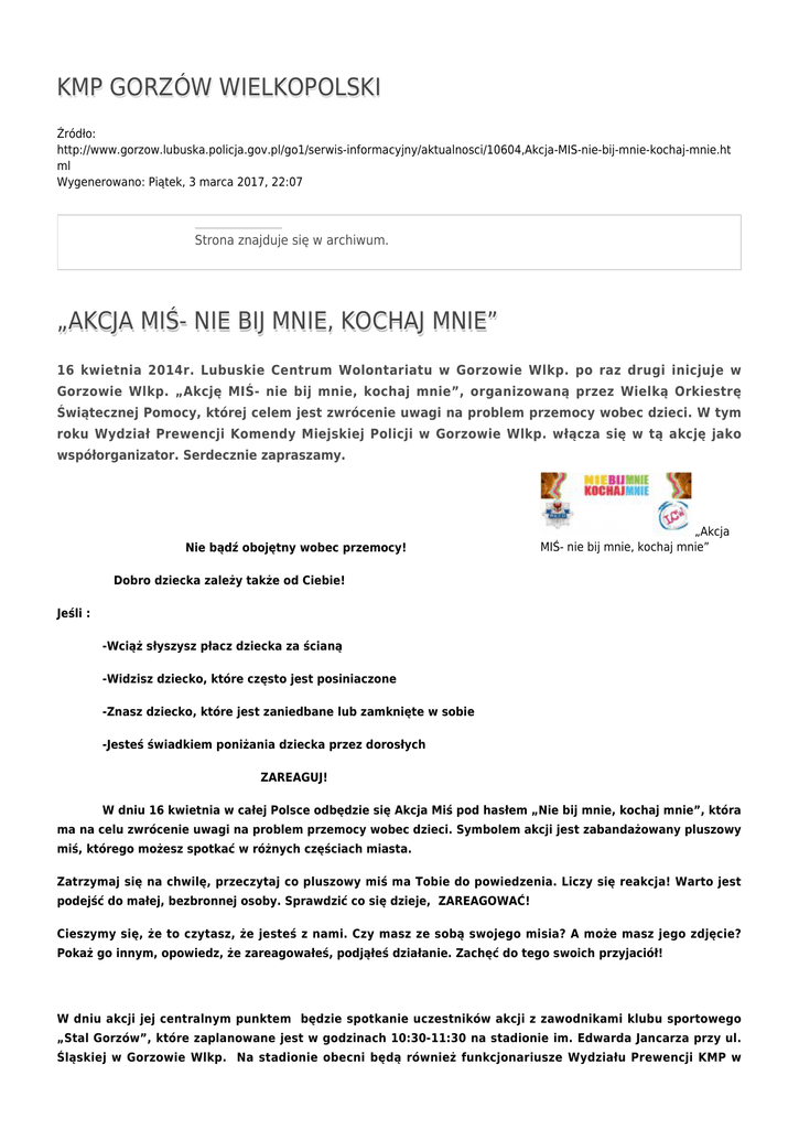 KMP GORZÓW WIELKOPOLSKI Źródło: http://www.gorzow.lubuska.policja.gov.pl/go1/serwis-informacyjny/aktualnosci/10604,Akcja-MIS-nie-bij-mnie-kochaj-mnie.ht ml Wygenerowano: Piątek, 3 marca 2017, 22:07 Strona znajduje się w archiwum. „AKCJA MIŚ- NIE BIJ MNIE, KOCHAJ MNIE” 16 kwietnia 2014r. Lubuskie Centrum Wolontariatu w Gorzowie Wlkp. po raz drugi inicjuje w Gorzowie Wlkp. „Akcję MIŚ- nie bij mnie, kochaj mnie”, organizowaną przez Wielką Orkiestrę Świątecznej Pomocy, której celem jest zwrócenie uwagi na problem przemocy wobec dzieci. W tym roku Wydział Prewencji Komendy Miejskiej Policji w Gorzowie Wlkp. włącza się w tą akcję jako współorganizator. Serdecznie zapraszamy. Nie bądź obojętny wobec przemocy! „Akcja MIŚ- nie bij mnie, kochaj mnie” Dobro dziecka zależy także od Ciebie! Jeśli : -Wciąż słyszysz płacz dziecka za ścianą -Widzisz dziecko, które często jest posiniaczone -Znasz dziecko, które jest zaniedbane lub zamknięte w sobie -Jesteś świadkiem poniżania dziecka przez dorosłych ZAREAGUJ! W dniu 16 kwietnia w całej Polsce odbędzie się Akcja Miś pod hasłem „Nie bij mnie, kochaj mnie”, która ma na celu zwrócenie uwagi na problem przemocy wobec dzieci. Symbolem akcji jest zabandażowany pluszowy miś, którego możesz spotkać w różnych częściach miasta. Zatrzymaj się na chwilę, przeczytaj co pluszowy miś ma Tobie do powiedzenia. Liczy się reakcja! Warto jest podejść do małej, bezbronnej osoby. Sprawdzić co się dzieje, ZAREAGOWAĆ! Cieszymy się, że to czytasz, że jesteś z nami. Czy masz ze sobą swojego misia? A może masz jego zdjęcie? Pokaż go innym, opowiedz, że zareagowałeś, podjąłeś działanie. Zachęć do tego swoich przyjaciół! W dniu akcji jej centralnym punktem będzie spotkanie uczestników akcji z zawodnikami klubu sportowego „Stal Gorzów”, które zaplanowane jest w godzinach 10:30-11:30 na stadionie im. Edwarda Jancarza przy ul. Śląskiej w Gorzowie Wlkp. Na stadionie obecni będą również funkcjonariusze Wydziału Prewencji KMP w Gorzowie Wlkp. Ocena: 0/5 (0) Tweetnij