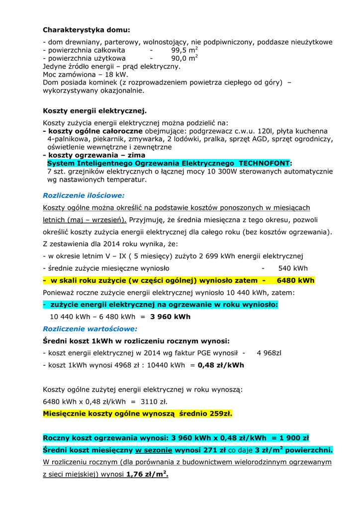 Charakterystyka domu: - dom drewniany, parterowy, wolnostojący, nie podpiwniczony, poddasze nieużytkowe - powierzchnia całkowita 99,5 m2 - powierzchnia użytkowa 90,0 m2 Jedyne źródło energii – prąd elektryczny. Moc zamówiona – 18 kW. Dom posiada kominek (z rozprowadzeniem powietrza ciepłego od góry) – wykorzystywany okazjonalnie. Koszty energii elektrycznej. Koszty zużycia energii elektrycznej można podzielić na: - koszty ogólne całoroczne obejmujące: podgrzewacz c.w.u. 120l, płyta kuchenna 4-palnikowa, piekarnik, zmywarka, 2 lodówki, pralka, sprzęt AGD, sprzęt ogrodniczy, oświetlenie wewnętrzne i zewnętrzne - koszty ogrzewania – zima System Inteligentnego Ogrzewania Elektrycznego TECHNOFONT: 7 szt. grzejników elektrycznych o łącznej mocy 10 300W sterowanych automatycznie wg nastawionych temperatur. Rozliczenie ilościowe: Koszty ogólne można określić na podstawie kosztów ponoszonych w miesiącach letnich (maj – wrzesień). Przyjmuję, że średnia miesięczna z tego okresu, pozwoli określić koszty zużycia energii elektrycznej dla całego roku (bez kosztów ogrzewania). Z zestawienia dla 2014 roku wynika, że: - w okresie letnim V – IX ( 5 miesięcy) zużyto 2 699 kWh energii elektrycznej - średnie zużycie miesięczne wyniosło - - w skali roku zużycie (w części ogólnej) wyniosło zatem - 540 kWh 6480 kWh Ponieważ roczne zużycie energii elektrycznej wyniosło 10 440 kWh, zatem: - zużycie energii elektrycznej na ogrzewanie w roku wyniosło: 10 440 kWh – 6 480 kWh = 3 960 kWh Rozliczenie wartościowe: Średni koszt 1kWh w rozliczeniu rocznym wynosi: - koszt energii elektrycznej w 2014 wg faktur PGE wynosił - 4 968zl - koszt 1kWh wynosi 4968 zł : 10440 kWh = 0,48 zł/kWh Koszty ogólne zużytej energii elektrycznej w roku wynoszą: 6480 kWh x 0,48 zł/kWh = 3110 zł. Miesięcznie koszty ogólne wynoszą średnio 259zł. Roczny koszt ogrzewania wynosi: 3 960 kWh x 0,48 zł/kWh = 1 900 zł Średni koszt miesięczny w sezonie wynosi 271 zł co daje 3 zł/m2 powierzchni. W rozliczeniu rocznym (dla porównania z budownictwem wielorodzinnym ogrzewanym z sieci miejskiej) wynosi 1,76 zł/m2.