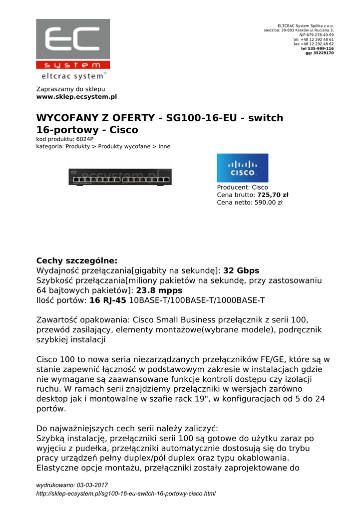 ELTCRAC System Spółka z o.o. siedziba: 30-803 Kraków ul.Ruciana 3, NIP 679-278-49-99 tel: +48 12 292 48 61 fax:+48 12 292 48 62 tel 535-999-116 gg: 35229170 Zapraszamy do sklepu www.sklep.ecsystem.pl WYCOFANY Z OFERTY - SG100-16-EU - switch 16-portowy - Cisco kod produktu: 6024P kategoria: Produkty > Produkty wycofane > Inne Producent: Cisco Cena brutto: 725,70 zł Cena netto: 590,00 zł Cechy szczególne: Wydajność przełączania[gigabity na sekundę]: 32 Gbps Szybkość przełączania[miliony pakietów na sekundę, przy zastosowaniu 64 bajtowych pakietów]: 23.8 mpps Ilość portów: 16 RJ-45 10BASE-T/100BASE-T/1000BASE-T Zawartość opakowania: Cisco Small Business przełącznik z serii 100, przewód zasilający, elementy montażowe(wybrane modele), podręcznik szybkiej instalacji Cisco 100 to nowa seria niezarządzanych przełączników FE/GE, które są w stanie zapewnić łączność w podstawowym zakresie w instalacjach gdzie nie wymagane są zaawansowane funkcje kontroli dostępu czy izolacji ruchu. W ramach serii znajdziemy przełączniki w wersjach zarówno desktop jak i montowalne w szafie rack 19", w konfiguracjach od 5 do 24 portów. Do najważniejszych cech serii należy zaliczyć: Szybką instalację, przełączniki serii 100 są gotowe do użytku zaraz po wyjęciu z pudełka, przełączniki automatycznie dostosują się do trybu pracy urządzeń pełny duplex/pół duplex oraz typu okablowania. Elastyczne opcje montażu, przełączniki zostały zaprojektowane do wydrukowano: 03-03-2017 http://sklep-ecsystem.pl/sg100-16-eu-switch-16-portowy-cisco.html wykorzystania zarówno w przestrzeniach biurowych jak i szafach rack, dzięki czemu możesz wybrać model dopasowany do Twoich potrzeb. Modele desktopowe można zainstalować również na ścianie, tak aby były nie widoczne podczas codziennego użytkowania. Duża wydajność, w zależności od modelu możesz stworzyć sieć pracującą z prędkością 1 Gb/s lub 100 Mbps. Obniżone koszty energii, przełączniki serii 100 wspierają standard IEEE 802.3az, który pozwala na monitorowanie aktywności na poszczególnych interfejsach i usypianie interfejsów nie wykorzystywanych aby obniżać zużycie energii, większość modeli nie posiada wentylatorów dzięki czemu są ciche i nie generują dodatkowych kosztów. Wsparcie QoS, przełączniki domyślnie rozpoznają ruch wymagający wyższego priorytetu w przesyłaniu danych np. taki jak VoIP i przesyłają go w pierwszej kolejności, tak aby zapewnić użytkownikom maksymalne zadowolenie z korzystania z sieci przewodowej. wydrukowano: 03-03-2017 http://sklep-ecsystem.pl/sg100-16-eu-switch-16-portowy-cisco.html