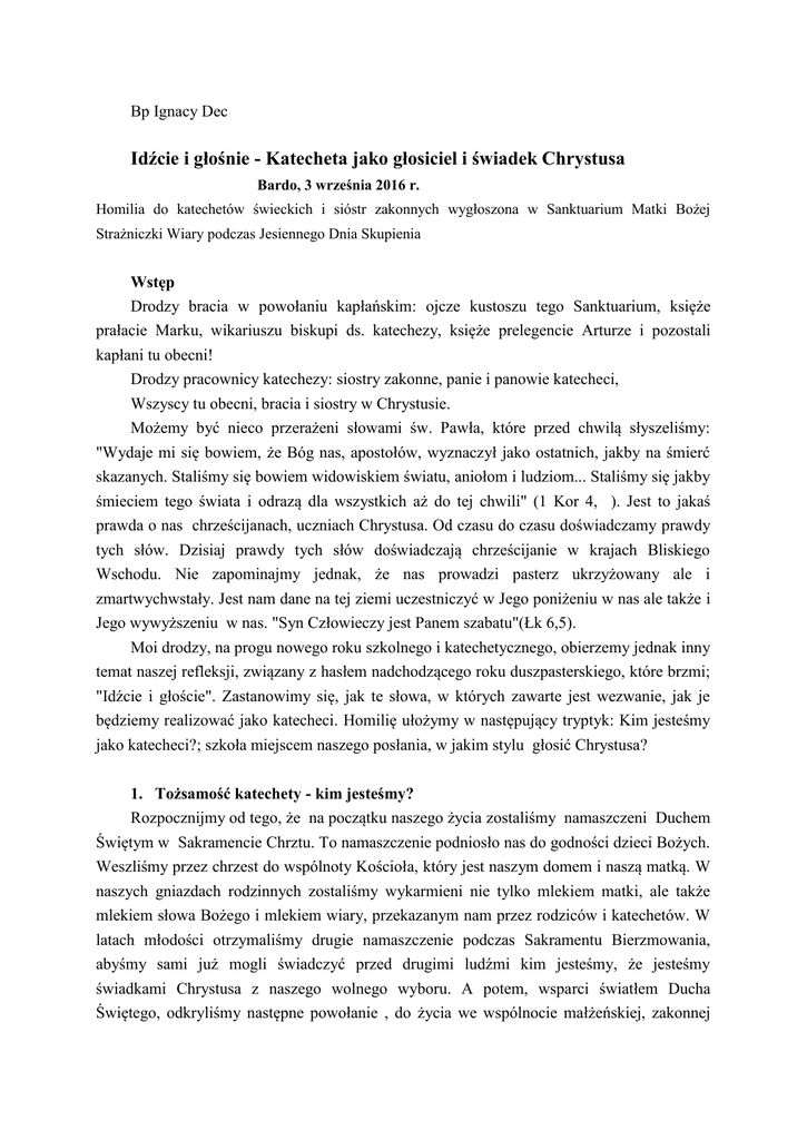 Bp Ignacy Dec Idźcie i głośnie - Katecheta jako głosiciel i świadek Chrystusa Bardo, 3 września 2016 r. Homilia do katechetów świeckich i sióstr zakonnych wygłoszona w Sanktuarium Matki Bożej Strażniczki Wiary podczas Jesiennego Dnia Skupienia Wstęp Drodzy bracia w powołaniu kapłańskim: ojcze kustoszu tego Sanktuarium, księże prałacie Marku, wikariuszu biskupi ds. katechezy, księże prelegencie Arturze i pozostali kapłani tu obecni! Drodzy pracownicy katechezy: siostry zakonne, panie i panowie katecheci, Wszyscy tu obecni, bracia i siostry w Chrystusie. Możemy być nieco przerażeni słowami św. Pawła, które przed chwilą słyszeliśmy: "Wydaje mi się bowiem, że Bóg nas, apostołów, wyznaczył jako ostatnich, jakby na śmierć skazanych. Staliśmy się bowiem widowiskiem światu, aniołom i ludziom... Staliśmy się jakby śmieciem tego świata i odrazą dla wszystkich aż do tej chwili" (1 Kor 4, ). Jest to jakaś prawda o nas chrześcijanach, uczniach Chrystusa. Od czasu do czasu doświadczamy prawdy tych słów. Dzisiaj prawdy tych słów doświadczają chrześcijanie w krajach Bliskiego Wschodu. Nie zapominajmy jednak, że nas prowadzi pasterz ukrzyżowany ale i zmartwychwstały. Jest nam dane na tej ziemi uczestniczyć w Jego poniżeniu w nas ale także i Jego wywyższeniu w nas. "Syn Człowieczy jest Panem szabatu"(Łk 6,5). Moi drodzy, na progu nowego roku szkolnego i katechetycznego, obierzemy jednak inny temat naszej refleksji, związany z hasłem nadchodzącego roku duszpasterskiego, które brzmi; "Idźcie i głoście". Zastanowimy się, jak te słowa, w których zawarte jest wezwanie, jak je będziemy realizować jako katecheci. Homilię ułożymy w następujący tryptyk: Kim jesteśmy jako katecheci?; szkoła miejscem naszego posłania, w jakim stylu głosić Chrystusa? 1. Tożsamość katechety - kim jesteśmy? Rozpocznijmy od tego, że na początku naszego życia zostaliśmy namaszczeni Duchem Świętym w Sakramencie Chrztu. To namaszczenie podniosło nas do godności dzieci Bożych. Weszliśmy przez chrzest do wspólnoty Kościoła, który jest naszym domem i naszą matką. W naszych gniazdach rodzinnych zostaliśmy wykarmieni nie tylko mlekiem matki, ale także mlekiem słowa Bożego i mlekiem wiary, przekazanym nam przez rodziców i katechetów. W latach młodości otrzymaliśmy drugie namaszczenie podczas Sakramentu Bierzmowania, abyśmy sami już mogli świadczyć przed drugimi ludźmi kim jesteśmy, że jesteśmy świadkami Chrystusa z naszego wolnego wyboru. A potem, wsparci światłem Ducha Świętego, odkryliśmy następne powołanie , do życia we wspólnocie małżeńskiej, zakonnej -2czy kapłańskiej, czy jakiejś jeszcze innej. W ten sposób otrzymaliśmy przestrzeń do służby innym w roli żony, męża, kapłana, siostry zakonnej czy osoby bezżennej. I następnie, odkryliście dodatkowe, ale bardzo ważne powołanie katechetyczne, aby być nauczycielem i przekazicielem wiary dla młodego pokolenia. We wszystkich tych rodzajach powołania towarzyszy nam modlitwa, aby światło i moc Ducha Świętego uzdalniało nas do służby drugim. 2. Szkoła miejscem naszego posłania - jako posłani do uczniów i nauczycieli Drodzy katecheci, waszym miejscem posługiwania katechetycznego jest przede wszystkim szkoła. Przez szkołę przechodziliśmy wszyscy. Jest to instytucja kształceniowo wychowawcza. Szkoła przekazuje uczniom na różnych poziomach informacje o człowieku, o świecie a także, głównie przez katechetów, wiedzę o Bogu, o Jego związku z człowiekiem i światem. Jest to cel informacyjny. O wiele ważniejszy jest cel wychowawczy. Szkoła winna przedłużać proces wychowania młodego człowieka zapoczątkowany w rodzinie. Szkoła jest wtedy dobra i wtedy spełnia oczekiwania rodziców, kiedy nie tylko obdarza uczniów wiedzą, ale czyni ich także lepszymi. W tym drugim o wiele trudniejszym zadaniu winniście wy, drodzy katecheci, mieć szczególny udział, właśnie w chrześcijańskim kształtowaniu osobowości ucznia. Podstawowym warunkiem owocnego kształtowania umysłów i serc uczniów jest miłość ze strony katechety do swoich wychowanków. Dzieci, czy młodzież mają prawo i życzenie spotykać w osobach katechetek, katechetów kompetentnych nauczycieli i dobrych wychowawców. Na uczniów oddziałujemy naszym umysłem i sercem, by właśnie w nich kształtować przymioty ich umysłów i serc. Obecność katechety w szkole ma także szerszy wymiar i szersze zadanie. Otóż pracownik katechezy winien także bardzo pozytywnie oddziaływać na grono nauczające, na grono pedagogiczne. Wiemy, że w tym gronie znajdują się różni ludzie, nie tylko różni pod względem kierunków i jakości wykształcenia, ale także o różnym światopoglądzie i różnej więzi z Kościołem. Nasza obecność jako katechetów w tym gronie winna być pokorna ale i odważna. Pamiętajmy, że dla niektórych nauczycieli możemy być jedyną religijną książką, którą oni mogą czytać i dowiadywać się o Bogu i o Kościele. Niech za każdym razem, kiedy udajecie się do szkoły, towarzyszy wam hasło, zdobywamy szkołę dla Chrystusa, a więc uczniów i nauczycieli. 3. Zdobywanie szkoły dla Chrystusa - jak ewangelizować przez katechezę? Jak zdobywać szkołę, a więc uczniów i nauczycieli, dla Chrystusa. W odpowiedzi na pytanie skorzystajmy z tryptyku św. Faustyny, która w swoim "Dzienniczku" podaje nam trzy środki świadczenia miłosierdzia: przez czyn, słowo i modlitwę. Możemy tę metodę zaaplikować do posługi katechetycznej w szkole. Nasza wszelka aktywność życiowa przejawia się najjaskrawiej w działaniu, w czynach. W szkolę najwięcej operujemy słowem, -3jednakże najbardziej wiarygodnym jest nasze postępowanie, zachowanie się wobec uczniów i nauczycieli. Mogą tu być ważne nawet małe gesty miłości, dobroci. one zwykle lepiej przemawiają do drugich niż najpiękniejsze słowa. Jutro Ojciec 