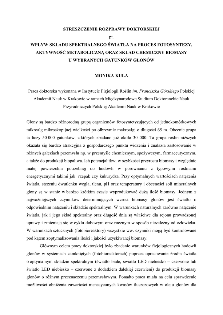 STRESZCZENIE ROZPRAWY DOKTORSKIEJ pt. WPŁYW SKŁADU SPEKTRALNEGO ŚWIATŁA NA PROCES FOTOSYNTEZY, AKTYWNOŚĆ METABOLICZNĄ ORAZ SKŁAD CHEMICZNY BIOMASY U WYBRANYCH GATUNKÓW GLONÓW MONIKA KULA Praca doktorska wykonana w Instytucie Fizjologii Roślin im. Franciszka Górskiego Polskiej Akademii Nauk w Krakowie w ramach Międzynarodowe Studium Doktoranckie Nauk Przyrodniczych Polskiej Akademii Nauk w Krakowie Glony są bardzo różnorodną grupą organizmów fotosyntetyzujących od jednokomórkowych mikroalg mikroskopijnej wielkości po olbrzymie makroalgi o długości 65 m. Obecnie grupa ta liczy 50 000 gatunków, z których zbadano już około 30 000. Ta grupa roślin niższych okazała się bardzo atrakcyjna z gospodarczego punktu widzenia i znalazła zastosowanie w różnych gałęziach przemysłu np. w przemyśle chemicznym, spożywczym, farmaceutycznym, a także do produkcji biopaliwa. Ich potencjał tkwi w szybkości przyrostu biomasy i względnie małej powierzchni potrzebnej do hodowli w porównaniu z typowymi roślinami energetycznymi takimi jak: rzepak czy kukurydza. Przy optymalnych wartościach natężenia światła, stężeniu dwutlenku węgla, tlenu, pH oraz temperatury i obecności soli mineralnych glony są w stanie w bardzo krótkim czasie wyprodukować dużą ilość biomasy. Jednym z najważniejszych czynników determinujących wzrost biomasy glonów jest światło o odpowiednim natężeniu i składzie spektralnym. W warunkach naturalnych zarówno natężenie światła, jak i jego skład spektralny oraz długość dnia są właściwe dla rejonu prowadzonej uprawy i zmieniają się w cyklu dobowym oraz rocznym w sposób niezależny od człowieka. W warunkach sztucznych (fotobioreaktory) wszystkie ww. czynniki mogą być kontrolowane pod kątem zoptymalizowania ilości i jakości uzyskiwanej biomasy. Głównym celem pracy doktorskiej było zbadanie warunków fizjologicznych hodowli glonów w systemach zamkniętych (fotobioreaktorach) poprzez opracowanie źródła światła o optymalnym składzie spektralnym (światło białe, światło LED niebiesko – czerwone lub światło LED niebiesko – czerwone z dodatkiem dalekiej czerwieni) do produkcji biomasy glonów o różnym przeznaczeniu przemysłowym. Ponadto praca miała na celu sprawdzenie możliwości obniżenia zawartości nienasyconych kwasów tłuszczowych w oleju glonów dla ulepszenia wyjściowego surowca do produkcji biopaliwa. Poszukiwano też prostych metod wskaźnikowych pozwalających na szybką ocenę stanu fizjologicznego i przewidywanie przyrostu biomasy glonów w celu ułatwienie kontroli procesu hodowli w fotobioreaktorach. Przeprowadzone badania dotyczyły wpływu składu spektralnego światła na: dynamikę wzrostu biomasy (metod wagowa), sprawność fotochemiczną PSII (pomiar parametrów kinetyki fluorescencji chlorofilu a), aktywność metaboliczną (kalorymetria izotermiczna), skład chemiczny biomasy w tym zawartość chlorofilu, fenoli oraz karotenoidów (spektofotometria UV-Vis, spektrometria FT-ramanowska i FT-IR oraz chromatografia gazowa), a także na widma emisyjne fluorescencji komórek w zakresie niebiesko – zielonym oraz czerwień – daleka czerwień (spektrofluorymetria) u trzech różnych szczepów glonów. Ponadto zbadano wpływ pulsacji światła oraz temperatury hodowli na produktywność biomasy, a także możliwość hodowli glonów na ściekach komunalnych. Na podstawie uzyskanych wyników stwierdzono, że skład spektralny światła wpływał na wzrost i wybrane parametry fizjologiczne u wszystkich szczepów. Wielkość tego wpływu była jednak silnie zależna od szczepu. Skład spektralny światła wpływał na sprawność aparatu fotosyntetycznego u Chlorella vulgaris. U Chlorella emersonii i Botryococcus braunii światło z dodatkiem dalekiej czerwieni zwiększało aktywność fotochemiczną PSII. Komórki badanych szczepów różniły się emisyjnymi widmami fluorescencyjnymi w zakresie niebiesko-zielonym, a ponadto widma te były, dla danego szczepu, zależne od składu spektralnego światła. Różnice te wynikały ze zmian składu chemicznego, zawartych w glonach związków fenolowych, pod wpływem składu spektralnego światła. Zmiany intensywności fluorescencji w zakresie czerwień – daleka czerwień (F690/F735) opisywały zmiany zawartości chlorofilu wynikającego ze wzrastającej liczby komórek w hodowli. Dla współczynników fluorescencji niebiesko-zielonej (F450/F530), niebiesko-czerwonej (F450/F690) oraz niebieskiej do dalekiej czerwieni (F450/F735) zaproponowano wartości liczbowe umożliwiające ocenę stopnia zestresowania hodowli glonów. I tak wartość F450/F530 powinna być mniejsza bądź równa 1,0; F450/F690 mniejsza od 0,1 natomiast F450/F735 mniejsza od 0,5. Wykazano, że największą zawartość fenoli i chlorofilu miały algi hodowane na świetle bogatym w daleką czerwień. Stwierdzono, że najlepsze parametry termiczne do hodowli Botyococcus braunii to 25°C do 30°C. Ocena pulsacji światła na wzrost hodowli wykazała, że oświetlanie hodowli światłem pulsacyjnym powoduje szybszy i większy przyrost jej biomasy pomimo mniejszej sprawności aparatu fotosyntetycznego. W przypadku hodowli glonów na ściekach komunalnych stwierdzono, czego można było oczekiwać, że miały one znacznie mniejsze przyrosty biomasy niż glony rosnące na pożywce. Niemniej stwierdzono istotne różnice pomiędzy kolejnymi hodowlami, zależnych od składu chemicznego ścieków, który z kolei był uzależniony od terminu ich pozyskania z oczyszczalni. Hodowle na ściekach posiadających mniejszą zawartość azotu azotanowego miały lepszy przyrost biomasy i porównywalny skład chemiczny, co algi rosnące na pożywce. Analiza składu kwasów tłuszczowych wykazała, że podwyższenie temperatury hodowli do 30°C znacznie obniża zawartość nienasyconych kwasów tłuszczowych, co może mieć praktyczne znaczenie dla branży paliwowej. W pracy doktorski