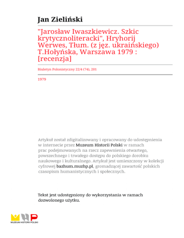 Jan Zieliński "Jarosław Iwaszkiewicz. Szkic krytycznoliteracki", Hryhorij Werwes, Tłum. (z jęz. ukraińskiego) T.Hołyńska, Warszawa 1979 : [recenzja] Biuletyn Polonistyczny 22/4 (74), 201 1979 /11/ W ERW ES H ry h o rij: J a ro sła w I w a s z k ie w ic z . S z k ic k r y ty c z n o lite r a c k i. T łu m . (z j ę z . u k r a iń s k ie g o ) T. H o ły ń sk a . W a r sz a w a 1 9 7 9 , C z y t ., s s . 232, z ł 4 8 .S z k ic m o n o g ra ficzn y o p olsk im p is a r z u , p ió r a zn a n eg o p o lo n is ty u k r a iń s k ie g o . U w aga a u to ra sk u p ia s i ę p r z e d e w sz y stk im n a w ie lo r a k ic h p o w ią za n ia ch ż y c ia i t w ó r c z o ś c i J a r o sła w a I w a s z k ie w ic z a z U k r a in ą . D la c z y te ln ik a p o ls k ie g o - s z c z e g ó ln ie in te r e s u ją c y j e s t r o z d z ia ł o m a w iający o k r e s k ijo w sk i w ż y c iu I w a s z k ie w ic z a . B P / 74./81 J .Z . /11/ W ESOŁOW SKI Jacek: P o ls k ie w izu a liu m , " T ek sty " 1 9 7 8 n r 4 s . 1 1 3 -1 2 6 . A utor p r z e d sta w ia n o w y r o d za j p u b lik a cji te k sto w e j i za ra z em d z ia ła ln o ś c i a r ty s ty c z n e j: w iz u a liu m , p o e z ję k o n k retn ą . A n a liz a "żartów g ra ficzn y ch " S ta n isła w a M ło d o żeń ca d ru k ow an ych na łam ach " M ie s ię c z n ik a L ite r a c k ie g o " s łu ż y e k s p lik a c ji jej p o d sta w o w y ch w ła ś c i w o ś c i. B P /7 4 /8 2 R.N.