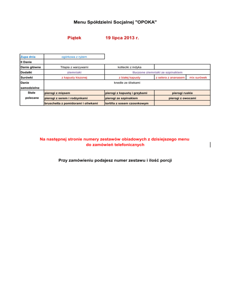 Menu Spółdzielni Socjalnej "OPOKA" Piątek 19 lipca 2013 r. ogórkowa z ryżem Zupa dnia II Danie Danie główne Tilapia z warzywami Dodatki ziemniaki Surówki z kapusty kiszonej kotleciki z indyka tłuczone ziemniaki ze szpinakiem z białej kapusty z selera z ananasem mix surówek knedle ze śliwkami Danie samodzielne Stale polecane pierogi z mięsem pierogi z kapustą i grzybami pierogi z serem i rodzynkami pierogi ze szpinakiem bruschetta z pomidorami i oliwkami tortilla z sosem czosnkowym pierogi ruskie pierogi z owocami Na następnej stronie numery zestawów obiadowych z dzisiejszego menu do zamówień telefonicznych Przy zamówieniu podajesz numer zestawu i ilość porcji 26 27 28 29 30 31 32 33 Zestawy obiadowe z dzisiejszego menu Piątek Zestaw nr 0 Zupa dnia danie główne 1 Tilapia z warzywami 2 Tilapia z warzywami 3 Tilapia z warzywami 4 Tilapia z warzywami 5 Tilapia z warzywami 6 Tilapia z warzywami 7 Tilapia z warzywami 8 Tilapia z warzywami 9 kotleciki z indyka 10 kotleciki z indyka 11 kotleciki z indyka 12 kotleciki z indyka 13 kotleciki z indyka 14 kotleciki z indyka 19 lipca 2013 r. cena w zł 4 ogórkowa z ryżem dodatek ziemniaki ziemniaki ziemniaki ziemniaki tłuczone ziemniaki ze szpinakiem tłuczone ziemniaki ze szpinakiem tłuczone ziemniaki ze szpinakiem tłuczone ziemniaki ze szpinakiem ziemniaki ziemniaki ziemniaki ziemniaki tłuczone ziemniaki ze szpinakiem tłuczone ziemniaki ze szpinakiem surówka z kapusty kiszonej z białej kapusty z selera z ananasem mix surówek z kapusty kiszonej z białej kapusty z selera z ananasem mix surówek z kapusty kiszonej z białej kapusty z selera z ananasem mix surówek z kapusty kiszonej z białej kapusty 8 8 8 8 8 8 8 8 8 8 8 8 8 8 15 kotleciki z indyka tłuczone ziemniaki ze szpinakiem z selera z ananasem 8 16 17 18 kotleciki z indyka knedle ze śliwkami pierogi z mięsem tłuczone ziemniaki ze szpinakiem mix surówek 8 8 8 19 20 21 22 23 24 25 26 27 28 29 30 31 32 33 pierogi z kapustą i grzybami pierogi ruskie pierogi z serem i rodzynkami pierogi ze szpinakiem pierogi z owocami bruschetta z pomidorami i oliwkami tortilla z sosem czosnkowym 8 8 8 8 8 4 8
