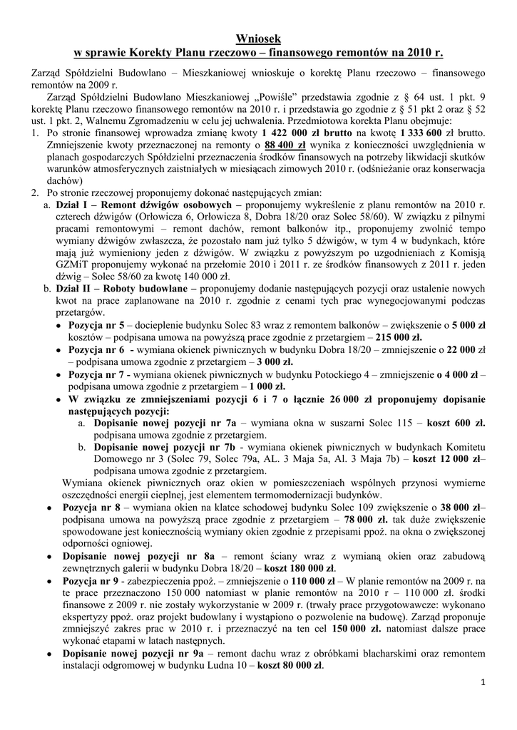 Wniosek w sprawie Korekty Planu rzeczowo – finansowego remontów na 2010 r. Zarząd Spółdzielni Budowlano – Mieszkaniowej wnioskuje o korektę Planu rzeczowo – finansowego remontów na 2009 r. Zarząd Spółdzielni Budowlano Mieszkaniowej „Powiśle” przedstawia zgodnie z § 64 ust. 1 pkt. 9 korektę Planu rzeczowo finansowego remontów na 2010 r. i przedstawia go zgodnie z § 51 pkt 2 oraz § 52 ust. 1 pkt. 2, Walnemu Zgromadzeniu w celu jej uchwalenia. Przedmiotowa korekta Planu obejmuje: 1. Po stronie finansowej wprowadza zmianę kwoty 1 422 000 zł brutto na kwotę 1 333 600 zł brutto. Zmniejszenie kwoty przeznaczonej na remonty o 88 400 zł wynika z konieczności uwzględnienia w planach gospodarczych Spółdzielni przeznaczenia środków finansowych na potrzeby likwidacji skutków warunków atmosferycznych zaistniałych w miesiącach zimowych 2010 r. (odśnieżanie oraz konserwacja dachów) 2. Po stronie rzeczowej proponujemy dokonać następujących zmian: a. Dział I – Remont dźwigów osobowych – proponujemy wykreślenie z planu remontów na 2010 r. czterech dźwigów (Orłowicza 6, Orłowicza 8, Dobra 18/20 oraz Solec 58/60). W związku z pilnymi pracami remontowymi – remont dachów, remont balkonów itp., proponujemy zwolnić tempo wymiany dźwigów zwłaszcza, że pozostało nam już tylko 5 dźwigów, w tym 4 w budynkach, które mają już wymieniony jeden z dźwigów. W związku z powyższym po uzgodnieniach z Komisją GZMiT proponujemy wykonać na przełomie 2010 i 2011 r. ze środków finansowych z 2011 r. jeden dźwig – Solec 58/60 za kwotę 140 000 zł. b. Dział II – Roboty budowlane – proponujemy dodanie następujących pozycji oraz ustalenie nowych kwot na prace zaplanowane na 2010 r. zgodnie z cenami tych prac wynegocjowanymi podczas przetargów. Pozycja nr 5 – docieplenie budynku Solec 83 wraz z remontem balkonów – zwiększenie o 5 000 zł kosztów – podpisana umowa na powyższą prace zgodnie z przetargiem – 215 000 zł. Pozycja nr 6 - wymiana okienek piwnicznych w budynku Dobra 18/20 – zmniejszenie o 22 000 zł – podpisana umowa zgodnie z przetargiem – 3 000 zł. Pozycja nr 7 - wymiana okienek piwnicznych w budynku Potockiego 4 – zmniejszenie o 4 000 zł – podpisana umowa zgodnie z przetargiem – 1 000 zł. W związku ze zmniejszeniami pozycji 6 i 7 o łącznie 26 000 zł proponujemy dopisanie następujących pozycji: a. Dopisanie nowej pozycji nr 7a – wymiana okna w suszarni Solec 115 – koszt 600 zł. podpisana umowa zgodnie z przetargiem. b. Dopisanie nowej pozycji nr 7b - wymiana okienek piwnicznych w budynkach Komitetu Domowego nr 3 (Solec 79, Solec 79a, AL. 3 Maja 5a, Al. 3 Maja 7b) – koszt 12 000 zł– podpisana umowa zgodnie z przetargiem. Wymiana okienek piwnicznych oraz okien w pomieszczeniach wspólnych przynosi wymierne oszczędności energii cieplnej, jest elementem termomodernizacji budynków. Pozycja nr 8 – wymiana okien na klatce schodowej budynku Solec 109 zwiększenie o 38 000 zł– podpisana umowa na powyższą prace zgodnie z przetargiem – 78 000 zł. tak duże zwiększenie spowodowane jest koniecznością wymiany okien zgodnie z przepisami ppoż. na okna o zwiększonej odporności ogniowej. Dopisanie nowej pozycji nr 8a – remont ściany wraz z wymianą okien oraz zabudową zewnętrznych galerii w budynku Dobra 18/20 – koszt 180 000 zł. Pozycja nr 9 - zabezpieczenia ppoż. – zmniejszenie o 110 000 zł – W planie remontów na 2009 r. na te prace przeznaczono 150 000 natomiast w planie remontów na 2010 r – 110 000 zł. środki finansowe z 2009 r. nie zostały wykorzystanie w 2009 r. (trwały prace przygotowawcze: wykonano ekspertyzy ppoż. oraz projekt budowlany i wystąpiono o pozwolenie na budowę). Zarząd proponuje zmniejszyć zakres prac w 2010 r. i przeznaczyć na ten cel 150 000 zł. natomiast dalsze prace wykonać etapami w latach następnych. Dopisanie nowej pozycji nr 9a – remont dachu wraz z obróbkami blacharskimi oraz remontem instalacji odgromowej w budynku Ludna 10 – koszt 80 000 zł. 1 c. Dział III – Roboty sanitarne. Pozycja nr 11 wymiana instalacji kanalizacyjnej (piony i poziomy) w budynku Dobra 17 zwiększenie o 50 000 zł – podpisana umowa na powyższą prace zgodnie z przetargiem – 100 000 zł. tak duże zwiększenie spowodowane jest koniecznością kompleksowej modernizacji instalacji kanalizacyjnej. Jednocześnie proponujemy wykreślenie z tej pozycji wymiany pionów kanalizacyjnych w budynku Solec 58/60 – prace te proponujemy umieścić w planie na 2011 r. Dopisanie nowej pozycji nr 11a – wymiana zestawu pomp w budynku Potockiego 4 – koszt 57000 zł. podpisana umowa zgodnie z przetargiem. Prace te były w planie na 2009 r. ich realizacja przesunęła się na 2010 r. – wymiana pomp zakończyła proces modernizacji instalacji wodno kanalizacyjnej w tym budynku. d. Dział IV – Awarie oraz prace nieprzewidziane. Pozycja nr 12 – zabezpieczenie środków finansowych na wypadek awarii– zmniejszenie o 15 000zł. Dopisanie nowej pozycji nr 13a – remont posadzki w piwnicy budynku Tamka 19/23 – koszt 20000 zł. – konieczność wykonania remontów ze względów technicznych. Dopisanie nowej pozycji nr 13b – remont szybu w budynku Orłowicza 6 – koszt 20 000 zł. – konieczność praca wykonana w 2009 r. podczas wymiany ślusarki okiennej klatki schodowej płatność przesunięta przez firmę wykonującą prace na rok 2010. Pozycja 14 – inne prace rezerwa proponujemy zwiększenie tej pozycji do 60 000 zł. Środki z tej pozycji proponujemy przeznaczać na drobne prace zgłaszane przez poszczególne Komitety Domowe w tym remont części nadziemnej hydroforni Solec 79a. W przypadku zgodnego z wnioskiem Zarządu podziału nadwyżki bilansowej i przeznaczenia kwoty 14 185,19 zł. do wykorzystania na fundusz remontowy na 2010 r. proponujemy zwiększenie o tą kwotę pozycji 14 inne prace rezerwowe do kwoty 74 185,19 zł. W ten sposób 
