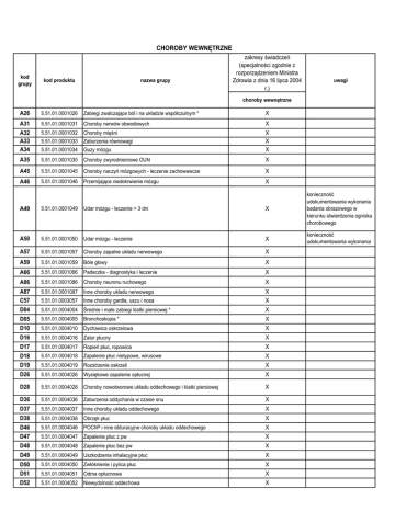 CHOROBY WEWNĘTRZNE kod grupy kod produktu nazwa grupy zakresy świadczeń (specjalności zgodnie z rozporządzeniem Ministra Zdrowia z dnia 16 lipca 2004 r.) uwagi choroby wewnętrzne A26 5.51.01.0001026 Zabiegi zwalczające ból i na układzie współczulnym * X A31 5.51.01.0001031 Choroby nerwów obwodowych X A32 A33 A34 5.51.01.0001032 Choroby mięśni 5.51.01.0001034 Guzy mózgu X X X A35 5.51.01.0001035 Choroby zwyrodnieniowe OUN X A45 5.51.01.0001045 Choroby naczyń mózgowych - leczenie zachowawcze X A46 5.51.01.0001046 Przemijające niedokrwienie mózgu X 5.51.01.0001033 Zaburzenia równowagi A49 5.51.01.0001049 Udar mózgu - leczenie > 3 dni X A50 5.51.01.0001050 Udar mózgu - leczenie X A57 5.51.01.0001057 Choroby zapalne układu nerwowego X A59 5.51.01.0001059 Bóle głowy X A66 5.51.01.0001066 Padaczka - diagnostyka i leczenie X A86 5.51.01.0001086 Choroby neuronu ruchowego X A87 C57 5.51.01.0001087 Inne choroby układu nerwowego 5.51.01.0003057 Inne choroby gardła, uszu i nosa X X D04 5.51.01.0004004 Średnie i małe zabiegi klatki piersiowej * X D05 5.51.01.0004005 Bronchoskopia * X D10 5.51.01.0004010 Dychawica oskrzelowa X D16 5.51.01.0004016 Zator płucny X D17 5.51.01.0004017 Ropień płuc, ropowica X D18 5.51.01.0004018 Zapalenie płuc nietypowe, wirusowe X D19 5.51.01.0004019 Rozstrzenie oskrzeli X D26 5.51.01.0004026 Wysiękowe zapalenie opłucnej X D28 5.51.01.0004028 Choroby nowotworowe układu oddechowego i klatki piersiowej X D36 5.51.01.0004036 Zaburzenia oddychania w czasie snu X D37 5.51.01.0004037 Inne choroby układu oddechowego X D38 5.51.01.0004038 Obrzęk płuc X D46 5.51.01.0004046 POChP i inne obturacyjne choroby układu oddechowego X D47 5.51.01.0004047 Zapalenie płuc z pw X D48 5.51.01.0004048 Zapalenie płuc bez pw X D49 5.51.01.0004049 Uszkodzenia inhalacyjne płuc X D50 5.51.01.0004050 Zwłóknienie i pylica płuc X D51 5.51.01.0004051 Odma opłucnowa X D52 5.51.01.0004052 Niewydolność oddechowa X konieczność udokumentowania wykonania badania obrazowego w kierunku stwierdzenia ogniska chorobowego konieczność udokumentowania wykonania badania obrazowego w CHOROBY WEWNĘTRZNE kod grupy kod produktu nazwa grupy zakresy świadczeń (specjalności zgodnie z rozporządzeniem Ministra Zdrowia z dnia 16 lipca 2004 r.) choroby wewnętrzne D53 5.51.01.0004053 Nadciśnienie płucne > 17 r.ż. X D54 5.51.01.0004054 Zapalenie opłucnej X E16 5.51.01.0005016 OZW > 69 r.ż. lub z pw X E17 5.51.01.0005017 OZW < 70 r.ż. X E18 5.51.01.0005018 OZW bez uniesienia ST X E19 5.51.01.0005019 E51 5.51.01.0005051 Zapalenie wsierdzia X E53 5.51.01.0005053 Niewydolność krążenia > 69 r.ż. lub z pw X E54 5.51.01.0005054 Niewydolność krążenia < 70 r.ż. bez pw X E55 5.51.01.0005055 Zakrzepica żył głębokich X E56 5.51.01.0005056 Choroba niedokrwienna serca > 69 r.ż. lub z pw X E57 5.51.01.0005057 Choroba niedokrwienna serca > 17 r.ż. < 70 r.ż. bez pw X E59 5.51.01.0005059 Nagłe zatrzymanie krążenia X E61 5.51.01.0005061 Zaburzenia rytmu serca > 69 r.ż. lub z pw X E62 5.51.01.0005062 Zaburzenia rytmu serca > 17 r.ż. < 70 r.ż. bez pw X E71 5.51.01.0005071 Omdlenie i zapaść X E72 5.51.01.0005072 Nieinwazyjna diagnostyka bólu w klatce piersiowej > 17 r.ż. X E73 5.51.01.0005073 Choroby zastawek serca > 17 r.ż. X E74 5.51.01.0005074 Wrodzone wady serca > 17 r.ż. X E77 5.51.01.0005077 Inne choroby układu krążenia > 17 r.ż. X E86 5.51.01.0005086 Nadciśnienie tętnicze oporne i wtórne X E87 5.51.01.0005087 Ciężkie nadciśnienie tętnicze > 17 r.ż. X E88 5.51.01.0005088 Nadciśnienie tętnicze > 17 r.ż. X F04 5.51.01.0006004 Diagnostyczne zabiegi przewodu pokarmowego * X F07 5.51.01.0006007 Choroby przełyku X F13 5.51.01.0006013 Zabiegi lecznicze żołądka i dwunastnicy * X F16 5.51.01.0006016 Choroby żołądka i dwunastnicy X F26 5.51.01.0006026 Choroby jelita cienkiego (bez chorób zapalnych) X F33 5.51.01.0006033 Średnie i endoskopowe zabiegi jelita grubego * X F36 5.51.01.0006036 Choroby jelita grubego X F43 5.51.01.0006043 Średnie i endoskopowe lecznicze zabiegi jamy brzusznej * X F44 5.51.01.0006044 Diagnostyczne i lecznicze zabiegi jamy brzusznej * X F46 5.51.01.0006046 Choroby jamy brzusznej X F47 5.51.01.0006047 Choroby infekcyjne jelit X F53 5.51.01.0006053 Średnie i endoskopowe zabiegi w chorobach zapalnych jelit * X F56 5.51.01.0006056 Choroby zapalne jelit > 17 r.ż. X F63 5.51.01.0006063 F66 5.51.01.0006066 Krwawienia z przewodu pokarmowego - leczenie zachowawcze OZW - leczenie z zastosowaniem leku trombolitycznego drugiej/ trzeciej generacji Średnie i endoskopowe diagnostyczne zabiegi w krwawieniach z przewodu pokarmowego * X X X uwagi CHOROBY WEWNĘTRZNE kod grupy kod produktu nazwa grupy zakresy świadczeń (specjalności zgodnie z rozporządzeniem Ministra Zdrowia z dnia 16 lipca 2004 r.) choroby wewnętrzne F86 5.51.01.0006086 Choroby wyrostka robaczkowego X F96 5.51.01.0006096 Choroby odbytu X G14 5.51.01.0007014 Małe zabiegi wątroby * X G16 5.51.01.0007016 Ostre choroby wątroby X G17 5.51.01.0007017 Przewlekłe choroby wątroby z pw X G18 5.51.01.0007018 Przewlekłe choroby wątroby bez pw X G26 5.51.01.0007026 Choroby dróg żółciowych X G28 5.51.01.0007028 Nowotwory dróg żółciowych X G33 5.51.01.0007033 Zabiegi endoskopowe i przezskórne dróg żółciowych i trzustki z wprowadzeniem protezy samorozprężalnej * X G34 5.51.01.0007034 Zabiegi endoskopowe i przezskórne dróg żółciowych i trzustki * X G35 5.51.01.0007035 Zabiegi diagnostyczne dróg żółciowych i trzustki * X G37 5.51.01.0007037 Ostre zapalenie trzustki X G38 5.51.01.0007038 Przewlekłe choroby trzustki X H56 5.51.01.0008056 Zespoły bólowe kręgosłupa X H86 5.51.01.0008086 Choroby tkanek miękkich X H87 5.51.01.0008087 Choroby zapalne stawów i tkanki łącznej X H88 5.51.01.0008088 Choroby infekcyjne kości i stawów X H89 5.51.01.0008089 Choroby niezapalne kości i stawów X H96 5.51.01.0008096 Układowe choroby tkanki łącznej X