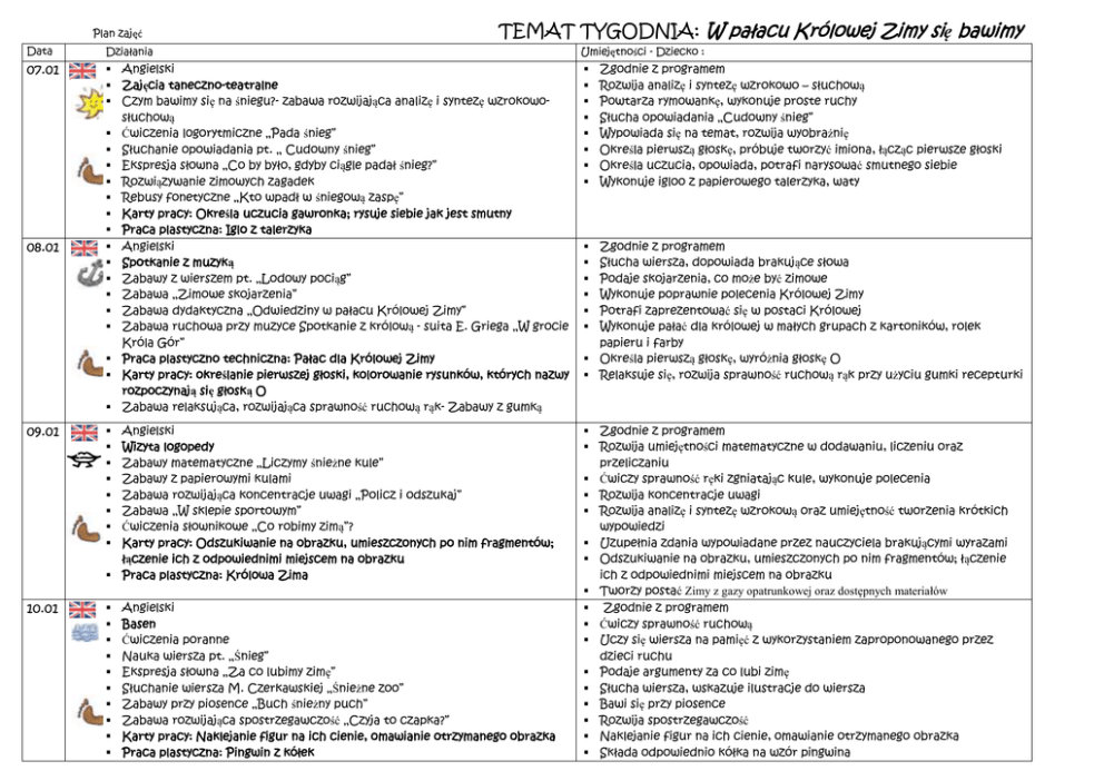 Plan zajęć TEMAT TYGODNIA: W pałacu Królowej Zimy się bawimy Data Działania Umiejętności - Dziecko : 07.01 Angielski Zajęcia taneczno-teatralne Czym bawimy się na śniegu?- zabawa rozwijająca analizę i syntezę wzrokowosłuchową Ćwiczenia logorytmiczne „Pada śnieg” Słuchanie opowiadania pt. „ Cudowny śnieg” Ekspresja słowna „Co by było, gdyby ciągle padał śnieg?” Rozwiązywanie zimowych zagadek Rebusy fonetyczne „Kto wpadł w śniegową zaspę” Karty pracy: Określa uczucia gawronka; rysuje siebie jak jest smutny Praca plastyczna: Iglo z talerzyka Angielski Spotkanie z muzyką Zabawy z wierszem pt. „Lodowy pociąg” Zabawa „Zimowe skojarzenia” Zabawa dydaktyczna „Odwiedziny w pałacu Królowej Zimy” Zabawa ruchowa przy muzyce Spotkanie z królową - suita E. Griega „W grocie Króla Gór” Praca plastyczno techniczna: Pałac dla Królowej Zimy Karty pracy: określanie pierwszej głoski, kolorowanie rysunków, których nazwy rozpoczynają się głoską O Zabawa relaksująca, rozwijająca sprawność ruchową rąk- Zabawy z gumką Angielski Wizyta logopedy Zabawy matematyczne „Liczymy śnieżne kule” Zabawy z papierowymi kulami Zabawa rozwijająca koncentracje uwagi „Policz i odszukaj” Zabawa „W sklepie sportowym” Ćwiczenia słownikowe „Co robimy zimą”? Karty pracy: Odszukiwanie na obrazku, umieszczonych po nim fragmentów; łączenie ich z odpowiednimi miejscem na obrazku Praca plastyczna: Królowa Zima Zgodnie z programem Rozwija umiejętności matematyczne w dodawaniu, liczeniu oraz przeliczaniu Ćwiczy sprawność ręki zgniatając kule, wykonuje polecenia Rozwija koncentracje uwagi Rozwija analizę i syntezę wzrokową oraz umiejętność tworzenia krótkich wypowiedzi Uzupełnia zdania wypowiadane przez nauczyciela brakującymi wyrazami Odszukiwanie na obrazku, umieszczonych po nim fragmentów; łączenie ich z odpowiednimi miejscem na obrazku Tworzy postać Zimy z gazy opatrunkowej oraz dostępnych materiałów Zgodnie z programem Ćwiczy sprawność ruchową Uczy się wiersza na pamięć z wykorzystaniem zaproponowanego przez dzieci ruchu Podaje argumenty za co lubi zimę Słucha wiersza, wskazuje ilustracje do wiersza Bawi się przy piosence Rozwija spostrzegawczość Naklejanie figur na ich cienie, omawianie otrzymanego obrazka Składa odpowiednio kółka na wzór pingwina 08.01 09.01 10.01 Angielski Basen Ćwiczenia poranne Nauka wiersza pt. „Śnieg” Ekspresja słowna „Za co lubimy zimę” Słuchanie wiersza M. Czerkawskiej „Śnieżne zoo” Zabawy przy piosence „Buch śnieżny puch” Zabawa rozwijająca spostrzegawczość „Czyja to czapka?” Karty pracy: Naklejanie figur na ich cienie, omawianie otrzymanego obrazka Praca plastyczna: Pingwin z kółek Zgodnie z programem Rozwija analizę i syntezę wzrokowo – słuchową Powtarza rymowankę, wykonuje proste ruchy Słucha opowiadania „Cudowny śnieg” Wypowiada się na temat, rozwija wyobraźnię Określa pierwszą głoskę, próbuje tworzyć imiona, łącząc pierwsze głoski Określa uczucia, opowiada, potrafi narysować smutnego siebie Wykonuje igloo z papierowego talerzyka, waty Zgodnie z programem Słucha wiersza, dopowiada brakujące słowa Podaje skojarzenia, co może być zimowe Wykonuje poprawnie polecenia Królowej Zimy Potrafi zaprezentować się w postaci Królowej Wykonuje pałać dla królowej w małych grupach z kartoników, rolek papieru i farby Określa pierwszą głoskę, wyróżnia głoskę O Relaksuje się, rozwija sprawność ruchową rąk przy użyciu gumki recepturki 11.01 Angielski Zabawa językowa Tworzenie długiego zdania Słuchanie wiersza H. Szayerowej „Zagadka”. Układanie zdrobnień do słów opisujących bałwanka w wierszu Zabawa wymyślamy nazwy dla bałwanka Zabawa ruchowa rozwijająca spostrzegawczość „Małe i duże bałwanki” Karty pracy: Naklejanie słoneczek przy obrazkach przedstawiających prawidłowe zachowania , a przy nieprawidłowych – chmurki, z uzasadnieniem wyboru Praca plastyczna: Zimowy obrazek Zgodnie z programem Próbuje ułożyć zdanie dodając słowa do poprzedniej części Słucha wiersza H. Szayerowej „Zagadka”. Układa zdrobnienia do słów opisujących bałwanka w wierszu Wymyśla nazwy dla bałwanka Podczas przerwy gry na tamburynie układa sylwety bałwanków według poleceń nauczyciela Nakleja słoneczka przy obrazkach przedstawiających prawidłowe zachowania , a przy nieprawidłowych – chmurki, z uzasadnieniem wyboru Wykonuje obrazek przedstawiający bałwana z wykorzystaniem płatków kosmetycznych, papieru