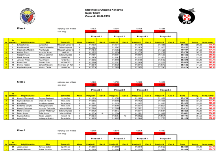 Klasyfikacja Oficjalna Końcowa Super Sprint Zamarski 28-07-2013 Klasa 4 najlepszy czas w klasie 1:15,38 1:15,44 1:14,05 1:12,56 czas taryfy 1:53,07 1:53,16 1:51,08 1:48,84 Przejazd 1 Lp 1 2 3 4 5 6 7 8 9 10 Nr startowy 1 2 5 6 4 7 9 11 10 8 Imię i Nazwisko Łukasz Kobiela Kamil Handzel Przemysław Mendrek Anrdzej Rduch Grzegorz Fujcik Marek Szpunar Jarosław Walek Paweł Ernst Dariusz Heczko Krystian Kasprzak Pilot Łukasz Kuś Dawid Pudarewisz Artur Kałuża Krzysztof Korus Tomasz Sztymon Dariusz Polak Paweł Walek Barbara Ernst Janusz Przywara Mariusz Cieślar Klasa 3 Samochód Mitsubishi Lancer IX Subaru Impreza Mitsubishi Lancer IX Audi 90 Subaru Impreza BMW E36 Honda Civic VW Golf TD Seat Ibiza GT TDI BMW E36 Klasa 4 4 4 4 4 4 4 4 4 4 Przejazd 1 01:15,38 01:18,61 01:18,75 01:16,39 01:18,91 01:29,76 01:25,52 01:26,46 01:25,19 01:27,14 Kara 1 Lp 1 2 3 4 5 6 7 8 9 Imię i Nazwisko Krzysztof Borowiecki Szymon Bekasiński Kamil Bolek Bartłomiej Gałązka Konrad Pietruszka Michał Michalski Dawid Szpyra Krystian Kubica Adam Branc Pilot Bartosz Gawłowski Wojciech Nowak Arkadiusz Jaworski Katarzyna Kolarz Krzysztof Pietruszka Damian Włodarczyk Rafał Konior Marcin Lapczyk Katarzyna Szalbot Klasa 2 Lp 1 2 Pilot Tomasz Caban Robert Pocański Kara 2 Przejazd 3 01:15,45 01:14,36 01:14,05 01:17,56 01:20,01 01:21,23 01:21,60 01:24,06 01:24,43 01:23,79 Kara 3 Przejazd 4 Przejazd 4 01:12,56 01:14,33 01:15,28 01:17,27 01:15,96 01:19,31 01:21,92 01:22,79 01:25,12 01:21,43 1:16,36 1:17,80 1:16,68 1:16,78 czas taryfy 1:54,54 1:56,70 1:55,02 1:55,17 Samochód Honda Civic Opel Astra Renault Clio Opel Astra Mitsubishi Colt Subaru Impreza Mitsubishi Colt Renault R5 Renault Clio Klasa 3 3 3 3 3 3 3 3 3 Przejazd 1 01:16,36 01:23,82 01:26,51 01:26,95 01:29,44 01:31,29 01:27,34 01:32,73 01:41,50 Kara 1 10 Przejazd 2 Przejazd 2 01:17,80 01:20,86 01:21,36 01:25,66 01:26,66 01:28,72 01:27,04 01:26,87 01:33,93 Kara 2 10 Przejazd 3 Przejazd 3 01:16,68 01:19,20 01:20,77 01:26,74 01:25,91 01:26,44 01:25,91 01:28,22 01:29,40 Kara 3 Przejazd 4 01:16,78 01:18,05 01:20,93 01:22,27 01:25,10 01:25,84 01:24,62 01:29,71 01:27,75 1:21,90 1:20,45 1:20,36 1:19,63 czas taryfy 2:02,85 2:00,68 2:00,54 1:59,45 Samochód Opel Corsa Honda Civic Klasa 2 2 Przejazd 1 01:23,67 01:21,90 Kara 1 Przejazd 2 Przejazd 2 01:24,69 01:20,45 Kara 2 10 Przejazd 3 Przejazd 3 01:23,49 01:22,70 Kara 3 Kara 4 Suma 04:58,83 05:02,75 05:04,61 05:07,76 05:16,92 05:31,91 05:33,10 05:40,32 05:41,02 05:42,34 Punkty Suma punkty 298,80 298,80 302,80 302,80 304,60 304,60 307,80 307,80 316,90 316,90 331,90 331,90 333,10 333,10 340,30 340,30 341,00 341,00 342,30 342,30 Suma 05:07,62 05:21,93 05:29,57 05:41,62 05:47,11 05:52,29 05:44,91 05:57,53 06:12,58 Punkty Suma punkty 307,60 307,60 321,90 321,90 329,60 329,60 341,60 341,60 347,10 347,10 352,30 352,30 354,90 344,90 367,50 357,50 372,60 372,60 Suma 05:33,07 05:24,68 Punkty Suma punkty 333,10 333,10 334,70 324,70 Przejazd 4 najlepszy czas w klasie Przejazd 1 Nr Imię i Nazwisko startowy 24 Jacek Jurasz 31 Dominik Beczała Przejazd 2 01:15,44 01:15,45 01:16,53 01:16,54 01:22,04 01:21,61 01:24,06 01:27,01 01:26,28 01:29,98 Przejazd 3 najlepszy czas w klasie Przejazd 1 Nr startowy 18 20 13 15 23 14 21 22 16 Przejazd 2 Kara 4 Przejazd 4 Przejazd 4 01:21,22 01:19,63 Kara 4 3 4 5 6 7 8 9 27 30 28 26 25 29 32 Marcin Korczyk GrzegorzPudełko Marcin Pytel Szymon Żarłok Józef Mirocha Mariusz Bytko Robert Niemiec Natalia Wrona Sebastian Sabik Bartłomiej Mazur Dariusz Goryczka Tobiasz Szpratek Patryk Siąkała Krzysztof Cieślar Klasa 1 Citroen Saxo Honda Civic Peugeot 106 Honda Civic Skoda 135L Honda Civic Opel Corsa 2 2 2 2 2 2 2 01:24,00 01:27,51 01:26,05 01:30,80 01:25,15 01:28,88 01:29,29 5 Nr startowy 37 43 33 38 40 45 48 41 42 47 36 46 44 Imię i Nazwisko Piotr Słomski Damian Kostka Michał Sołtysiak Marcin Szajter Marek Mendela Andrzej Szewczyk Kajetan Tatar Jakub Sulej Michał Michalczyk Andrzej Kobielusz Artur Bal Arkadiusz Wantulok Bartosz Tondryk Pilot Łukasz Zieja Marcin Mąka Adam Mielcarz Lesław Polok Robert Krzuza Gabriela Cienciała Martyna Maciusiak Sebastian Jaźwa Marcin Godyń Łukasz Madusiok Marcin Bieniak Łukasz Chrapek Dawid Krzempek Klasa Markowa 10 10 10 01:20,36 01:24,77 01:22,98 01:24,52 01:24,81 01:29,95 01:32,92 01:22,09 01:22,25 01:24,71 01:22,95 01:23,82 01:27,81 01:42,01 najlepszy czas w klasie 1:20,75 1:21,48 1:19,41 1:18,97 czas taryfy 2:01,13 2:02,22 1:59,12 1:58,46 Przejazd 1 Lp 1 2 3 4 5 6 7 8 9 10 11 12 13 01:21,65 01:23,77 01:24,05 01:26,14 01:23,83 01:28,96 01:24,87 Samochód Suzuki Swift Suzuki Swift Fiat SC Fiat SC Fiat SC Mazda 323 Fiat CC Fiat SC Fiat SC Fiat SC Fiat SC Fiat CC Ford Fiesta Klasa 1 1 1 1 1 1 1 1 1 1 1 1 1 Przejazd 1 01:20,75 01:24,16 01:26,96 01:25,43 01:27,75 01:27,40 01:25,05 01:30,27 01:32,08 01:32,16 01:30,48 01:30,42 01:36,87 Kara 1 10 10 10 Przejazd 2 Przejazd 2 01:21,48 01:22,47 01:24,37 01:23,09 01:25,29 01:28,17 01:24,09 01:28,84 01:28,81 01:26,35 01:29,73 01:29,69 01:33,95 Kara 2 20 Przejazd 3 Przejazd 3 01:20,24 01:19,41 01:20,75 01:22,60 01:25,21 01:25,59 01:23,81 01:27,09 01:28,77 01:27,37 01:32,31 01:28,14 01:33,89 Kara 3 Przejazd 4 01:20,25 01:18,97 01:20,82 01:23,31 01:26,30 01:23,72 01:34,18 01:28,15 01:28,94 01:24,63 01:29,16 01:28,32 01:33,88 1:26,83 1:25,05 1:31,44 1:24,47 czas taryfy 2:10,25 2:07,58 2:17,16 2:06,71 Przejazd 2 Przejazd 3 328,10 338,30 337,80 344,40 337,60 355,60 369,10 Kara 4 20 Suma 05:22,72 05:25,01 05:32,90 05:34,43 05:44,55 05:44,88 05:47,13 05:54,35 05:58,60 05:50,51 06:01,68 05:56,57 06:18,59 Punkty Suma punkty 322,70 322,70 325,00 325,00 332,90 332,90 334,40 334,40 344,60 344,60 344,90 344,90 347,13 347,13 354,40 354,40 358,60 358,60 360,50 350,50 361,70 361,70 386,60 356,60 408,60 378,60 Suma Punkty Przejazd 4 Lp Nr startowy Samochód Klasa 1 54 Tomasz Łukosz Agata Mazurek Fiat 126p Markowa 01:26,83 01:25,05 01:31,44 01:24,47 05:47,79 347,80 2 3 4 5 6 49 53 51 52 50 Daniel Opioła Piotr Filapek Mariusz 
