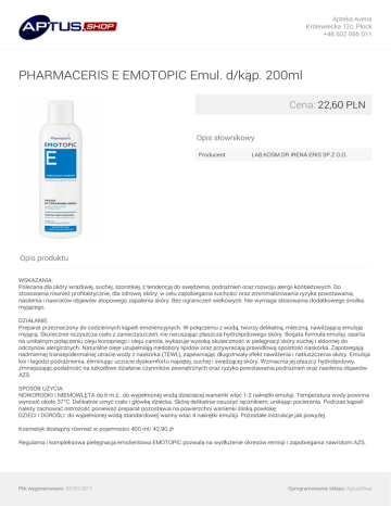 Apteka Avena Królewiecka 12c, Płock +48 502 666 011 PHARMACERIS E EMOTOPIC Emul. d/kąp. 200ml Cena: 22,60 PLN Opis słownikowy Producent LAB.KOSM.DR IRENA ERIS SP.Z O.O. Opis produktu WSKAZANIA: Polecana dla skóry wrażliwej, suchej, szorstkiej, z tendencją do swędzenia, podrażnień oraz rozwoju alergii kontaktowych. Do stosowania również profilaktycznie, dla zdrowej skóry, w celu zapobiegania suchości oraz zminimalizowania ryzyka powstawania, nasilenia i nawrotów objawów atopowego zapalenia skóry. Bez ograniczeń wiekowych. Nie wymaga stosowania dodatkowego środka myjącego. DZIAŁANIE: Preparat przeznaczony do codziennych kąpieli emoliencyjnych. W połączeniu z wodą, tworzy delikatną, mleczną, nawilżającą emulsję myjącą. Skutecznie oczyszcza ciało z zanieczyszczeń, nie naruszając płaszcza hydrolipidowego skóry. Bogata formuła emulsji, oparta na unikalnym połączeniu oleju konopnego i oleju canola, wykazuje wysoką skuteczność w pielęgnacji skóry suchej i skłonnej do odczynów alergicznych. Naturalne oleje uzupełniają niedobory lipidów oraz przywracają prawidłową spoistość naskórka. Zapobiegają nadmiernej transepidermalnej utracie wody z naskórka (TEWL), zapewniając długotrwały efekt nawilżenia i natłuszczenia skóry. Emulsja koi i łagodzi podrażnienia, eliminując uczucie dyskomfortu napiętej, suchej i swędzącej skóry. Wzmacnia jej płaszcz hydrolipidowy, zmniejszając podatność na szkodliwe działanie czynników zewnętrznych oraz ryzyko powstawania podrażnień oraz nasilenia objawów AZS. SPOSÓB UŻYCIA: NOWORODKI I NIEMOWLĘTA do 6 m.ż.: do wypełnionej wodą dziecięcej wanienki wlać 1-2 nakrętki emulsji. Temperatura wody powinna wynosić około 37°C. Delikatnie umyć ciało i główkę dziecka. Skórę delikatnie osuszyć ręcznikiem, unikając pocierania. Podczas kąpieli należy zachować ostrożość ponieważ preparat pozostawia na powierzchni wanienki śliską powłokę. DZIECI I DOROŚLI: do wypełnionej wodą standardowej wanny wlać 4 nakrętki emulsji. Pozostałe instrukcje jak powyżej. Kosmetyk dostępny również w pojemności 400 ml/ 42.90 zł Regularna i kompleksowa pielęgnacja emolientowa EMOTOPIC pozwala na wydłużenie okresów remisji i zapobiegania nawrotom AZS. Plik wygenerowano: 03-03-2017 Oprogramowanie sklepu: AptusShop Apteka Avena Królewiecka 12c, Płock +48 502 666 011 Produkt rekomendowany przez Polskie Towarzystwo Pediatryczne od 1. dnia życia. Bez wody, detergentów, parabenów, barwników, konserwantów, substancji zapachowych, SLS, SLES, mydła. Produkt hipoalergiczny. Zapewnia wysoki stopień tolerancji. Receptura opracowana i przebadana dermatologicznie i klinnicznie pod nadzorem dermatologów dziecięcych. Plik wygenerowano: 03-03-2017 Powered by TCPDF (www.tcpdf.org) Oprogramowanie sklepu: AptusShop