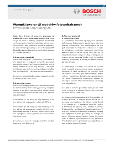 pl www.bosch-solarenergy.com Warunki gwarancji modułów fotowoltaicznych firmy Bosch Solar Energy AG Bosch Solar Energy AG zapewnia gwarancję na C: Warunki gwarancji produkt (A.) oraz gwarancję na moc (B.). Gwa- 1. Informacje ogólne rancja na produkt dotyczy wyłącznie materiałów 1.1 Gwarancje udzielane są wyłącznie klientowi i wykorzystania modułów, natomiast utrata mocy końcowemu. Zobowiązania gwarancyjne nie obo- (degradacja) i moc minimalna modułów są wyłącz- wiązują pośredników, firm montażowych ani dru- nie przedmiotem gwarancji na moc. W rozdziale C: gich nabywców modułów. Klienci końcowi to wszy- Warunki gwarancji zawarto warunki obowiązujące scy ci nabywcy modułów, którzy sami nabyli je na dla obydwu gwarancji. własny użytek (a nie do celów odsprzedaży) lub nabyli budynek, na którym moduły zostaną zamon- A: Gwarancja na produkt towane po raz pierwszy. Moduł musi być częścią Bosch Solar Energy AG (zwana dalej „gwarantem“), instalacji słonecznej, w której jest eksploatowany przy zachowaniu niniejszych warunków gwarancji, po raz pierwszy. gwarantuje nabywcy końcowemu (klientowi końcowemu) na okres 10 lat od daty dostawy (z naszej fa- 1.2 Gwarancje te istnieją niezależnie od ustawo- bryki lub z magazynu), że moduły nie będą miały błę- wych roszczeń gwarancyjnych wobec sprzedawcy dów materiałowych i związanych z wykorzystaniem. modułów, a także niezależnie od roszczeń pozaumownych. Gwarancja jest samodzielnym, dobro- Gwarancja na produkt obowiązuje wszystkie modu- wolnym i bezpłatnym świadczeniem gwaranta wo- ły słoneczne serii Bosch c-Si. bec klienta końcowego, niemającym wpływu na umowę w sprawie właściwości między sprzedają- B: Gwarancja na moc cym a kupującym. Bosch Solar Energy AG udziela klientowi końcowemu samodzielnej, dobrowolnej gwarancji na sprze- 1.3 Jeśli te warunki gwarancji różnią się od infor- dawane przez siebie moduły według wymienionych macji podanych w arkuszu danych, priorytet mają poniżej warunków: Bosch Solar Energy AG gwaran- niniejsze warunki gwarancji. tuje, że moduły 1.4 Gwarancje obowiązują w Unii Europejskiej lub a) w okresie 10 lat, licząc od daty dostawy (z na- w kraju trzecim, w którym moduł został po raz szej fabryki lub magazynu), będą miały 90 %, a pierwszy wprowadzony do obrotu przez Bosch Solar Energy AG, z wyjątkiem Australii, Amery- b) w okresie 25 lat, licząc od daty dostawy (z na- ki Północnej (w szczeg. USA, Kanady) i Ameryki szej fabryki lub magazynu), co najmniej 80 % mocy Środkowej (w tym Meksyku, Wysp Karaibskich). W minimalnej podanej w arkuszu danych (dolna gra- Australii, Ameryce Północnej i Środkowej obowią- nica wydajności poszczególnych klas mocy minus zują wyłącznie warunki gwarancji dla danego re- tolerancja mocy). gionu. Roszczeń gwarancyjnych można dochodzić tylko w okresie obowiązywania danej gwarancji. Gwarancja na moc obowiązuje wszystkie moduły Przedłużenie okresu gwarancji, bez względu na po- słoneczne serii Bosch c-Si. wód prawny, jest wykluczone. Warunki gwarancji modułów fotowoltaicznych | Bosch Solar Energy AG, Robert-Bosch-Straße 1, 99310 Arnstadt, Niemcy, Tel. + 49(0)3628 66 44-0 pl www.bosch-solarenergy.com 2. Wykluczenia odpowiedzialności / ograniczenia 2.2 Wysunięcie roszczeń gwarancyjnych jest ponad- odpowiedzialności to uwarunkowane tym, że moduły są wykorzystywa- 2.1 Gwarancje te obowiązują przy normalnym i ne prawidłowo zgodnie ze swoim przeznaczeniem zgodnym z przeznaczeniem zastosowaniu, mon- i nie ma na nich oznak zużycia ani uszkodzeń ze- tażu, użytkowaniu, a także tylko w typowych wa- wnętrznych większych niż wynikające z normalne- runkach zastosowania. Warunkiem gwarancji jest, go użycia, a także nie doszło do uszkodzeń numeru aby wydajność modułów nie została zredukowana seryjnego i/lub etykiety produktu. Należy również przez środki lub zdarzenia, które znajdują się poza bezwzględnie przestrzegać instrukcji montażu i zakresem kontroli firmy Bosch Solar Energy AG: obsługi. Przestrzeganie wymienionych tam wskazó- ▶ zmiana/uszkodzenia w wyniku działania siły wek bezpieczeństwa i ostrzeżeń, a także podanej wyższej (zła pogoda, grad, pożar, awaria zasi- na arkuszu danych dozwolonej instrukcji montażu lania, uderzenie pioruna, powódź, śnieżyce, la- i obsługi, jest wymagalnym warunkiem wysunięcia winy, mróz, trzęsienia ziemi, trąby powietrzne, roszczeń gwarancyjnych. wybuchy wulkanów, osunięcia ziemi, plagi owadów oraz inne działania zwierząt, itd.), a także 2.3 Roszczeń gwarancyjnych nie można przenosić szkody spowodowane przez osoby trzecie w na osoby trzecie. wyniku wandalizmu i kradzieży, ▶ nieprawidłowy montaż, uruchomienie, eksploatacja lub nieprawidłowy demontaż i/ 3.1 Jeśli dojdzie do zdarzenia podlegającego gwa- lub ponowny montaż modułów (np. z powodu nieprzestrzegania instrukcji montażu 3. Świadczenia gwarancyjne 1 obowią- zującej w czasie instalacji), rancji, Bosch Solar Energy AG według własnego uznania wymieni moduł na sprawny moduł tego samego typu, usunie wady lub zrekompensuje utra- ▶ użytkowanie na jednostkach ruchomych, takich cony zysk z danego modułu. Jeśli w momencie zda- jak pojazdy i statki oraz inne niezależne od sieci rzenia podlegającego gwarancji dany typ modułu zastosowanie modułów, nie będzie już produkowany, Bosch Solar Energy ▶ szkodliwy wpływ warunków zewnętrznych (np. AG zastrzega sobie prawo dostarczenia modułów brud, dym, sól, środki chemiczne i inne zabru- słonecznych innego typu (inny rozmiar, kształt, ko- dzenia), lor i/lub moc). ▶ połączenie z modułami innych producentów o innej konstrukcji, ▶ uszkodzenia systemu, w którym zamontowany 3.2 Nie ma innych roszczeń wynikających z tych gwarancji. jest moduł, ▶ niewystarczająca wentylacja, przy czym pod 3.3 Dla nowo dostarczonych lub naprawionych żadnym pozorem nie 