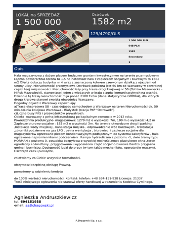 Ostrówek LOKAL na SPRZEDAŻ 1582 m2 1 500 000 125/4790/OLS 1 500 000 PLN 948 PLN 1582 Secondary 1 Opis Hala magazynowa z dużym placem będącym gruntem inwestycyjnym na terenie przemysłowym Łączna powierzchnia terenu to 1,5 ha natomiast hala z zapleczem socjalnym i biurowym to 1582 m2 Oferta dotyczy budynku nr 4 wraz z zaznaczoną kolorem czerwonym działką z wjazdem od strony ulicy .Nieruchomość przemysłowa Ostrówek położona jest 60 km od Warszawy w centralnej części teej miejscowości .Nieruchomość leży przy trasie drogi krajowej nr 50 (Ostrów Mazowiecka Mińsk Mazowiecki), stanowiącej jeden z wiodących w kraju ciągów komunikacyjnych na wschód. Dziennie tą trasą nieruchomość mija ponad 2100 Tirów (dane statystyczne GDDKiA), dla których droga krajowa stanowi swoistą obwodnicę Warszawy. Dogodny dojazd z Warszawy zapewniają: a)Trasa ekspresowa S8 - czas dojazdu samochodem z Warszawy na teren Nieruchomości ok. 50 min.b)Linia kolejowa Warszawa - Białystok (stacja PKP "Ostrówek"). c)Liczne busy PKS i przewoźników prywatnych. Obiekt murowany z pełną infrastrukturą po kapitalnym remoncie w 2012 roku. Powierzchnia produkcyjno- magazynowa: 1270 m2 o wysokości 7m, 100 m o wysokości 4,2 m Zaplecze biurowo socjalne : 182 m2 o wysokości 3m. Na terenie utwardzone drogi i parkingi ,Instalacja wody miejskiej , kanalizacja miejska , odprowadzenie wód burzowych , trafostacja ,zbiorniki podziemne na gaz LPG , pełna wentylacja , biurowiec i zaplecze socjalne dla magazynierów ogrzewane piecem kondensacyjnym podłączonym do systemu kaloryferów , hala ogrzewana napromiennikami podczerwieni .Rampa hydrauliczna z poziomu -1, dwie bramy typu HORMAN z poziomu 0. posadzka bezpyłowa o wysokiej nośności,nowe plastykowe okna ,teren ogrodzony i oświetlony ,przygotowana i wyposażona część socjalno-biurowa.Bardzo przyjazna gmina i burmistrz .Dostępność ludzi do pracy (w tym także mechaników, operatorów maszyn). Oszczędź czas i pieniądze, załatwiamy za Ciebie wszystkie formalności, otrzymasz bezpłatną obsługę Prawną, pomożemy w udzieleniu kredytu do 100% wartości nieruchomości. Kontakt: telefon: +48 694-151-938 Licencja: 21337 Treść niniejszego ogłoszenia nie stanowi oferty handlowej w rozumieniu Kodeksu Cywilnego. Agnieszka Andruszkiewicz tel. 694151938 email: [email protected] A.Drągowski Sp. z o.o. A.Drągowski Sp. z o.o. Powered by TCPDF (www.tcpdf.org)