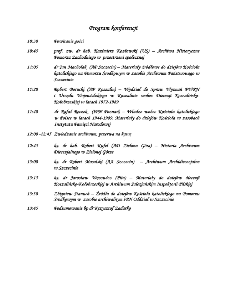 Program konferencji 10:30 Powitanie gości 10:45 prof. zw. dr hab. Kazimierz Kozłowski (US) – Archiwa Historyczne Pomorza Zachodniego w przestrzeni społecznej 11:05 dr Jan Macholak (AP Szczecin) – Materiały źródłowe do dziejów Kościoła katolickiego na na Pomorzu Środkowym w zasobie Archiwum Państwowego w Szczecinie 11:20 Robert Borucki (AP Koszalin) – Wydział do Spraw Wyznań PWRN Koszalińsko-i Urzędu Wojewódzkiego w Koszalinie wobec Diecezji Koszalińsko Kołobrzeskiej w latach 19721972-1989 11:40 dr Rafał Reczek (IPN (IPN Poznań) – Władze wobec Kościoła katolickiego w Polsce w latach 19441944-1989. Materiały do dziejów Kościoła w zasobach Instytutu Pamięci Narodowej 12:00 -12:45 Zwiedzanie archiwum, przerwa na kawę 12:45 ks. dr hab. Robert Kufel (AD Zielona Góra) – Historia Historia Archiwum Diecezjalnego w Zielonej Górze 13:00 ks. dr Robert Masalski (AA Szczecin) w Szczecinie 13:15 ks. dr Jarosław Wąsowicz (Piła) – Materiały do dziejów diecezji KoszalińskoKoszalińsko-Kołobrzeskiej w Archiwum Salezjańskim Inspektorii Inspektorii Pilskiej 13:30 Zbigniew Stanuch – Źródła do dziejów Kościoła katolickiego na Pomorzu Środkowym w zasobie archiwalnym IPN Oddział w Szczecinie 13:45 13:45 Podsumowanie bp dr Krzysztof Zadarko – Archiwum Archidiecezjalne