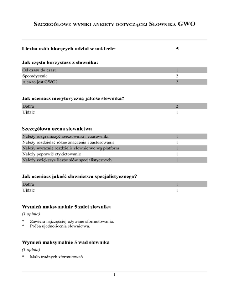 SZCZEGÓŁOWE WYNIKI ANKIETY DOTYCZĄCEJ SŁOWNIKA GWO Liczba osób biorących udział w ankiecie: 5 Jak często korzystasz z słownika: Od czasu do czasu Sporadycznie A co to jest GWO? 1 2 2 Jak oceniasz merytoryczną jakość słownika? Dobra Ujdzie 2 1 Szczegółowa ocena słownictwa Należy rozgraniczyć rzeczowniki i czasowniki Należy rozdzielać różne znaczenia i zastosowania Należy wyraźnie rozdzielić słownictwo wg platform Należy poprawić etykietowanie Należy zwiększyć liczbę słów specjalistycznych 1 1 1 1 1 Jak oceniasz jakość słownictwa specjalistycznego? Dobra Ujdzie 1 1 Wymień maksymalnie 5 zalet słownika (1 opinia) * * Zawiera najczęściej używane sformułowania. Próba ujednolicenia słownictwa. Wymień maksymalnie 5 wad słownika (1 opinia) * Mało trudnych sformułowań. -1- Jak oceniasz obsługę słownika? Mało intuicyjna, ale po przyzwyczajeniu się jest OK 2 Podaj maksymalnie 5 propozycji zmian w interfejsie (brak opinii) Czy korzystasz z informacji w artykułach na Wiki? Na ogół kieruję się własną wiedzą i doświadczeniem Stosuję się do wytycznych mojego projektu 1 1 Czy bierzesz udział w dyskusjach na Wiki? Nie interesuje mnie to 2 Podaj maksymalnie 5 uwag do artykułów i dyskusji na Wiki (brak opinii) Czy uważasz, że projekt ten powinien zostać upubliczniony? Tak Nie Jeszcze nie teraz 2 1 1 Kto, Twoim zdaniem, powinien być poinformowany i zaproszony do współtworzenia GWO? (brak opinii) Przynależność do zespołów WO? KDE Jestem osobą niezrzeszoną i niezależną 4 1 Czy chciałabyś/chciałbyś brać udział w pracach nad GWO? Tak Nie 1 1 -2- Hyde Park Czy bierzesz udział w dyskusjach na Wiki? → brakująca opcja „nie zauważyłam/em wcześniej takiej możliwości” Jeszcze raz dziękuję za poświęcenie czasu na wypełnienie ankiety. Wojciech Przeworsk, 29 listopada 2010 -3-