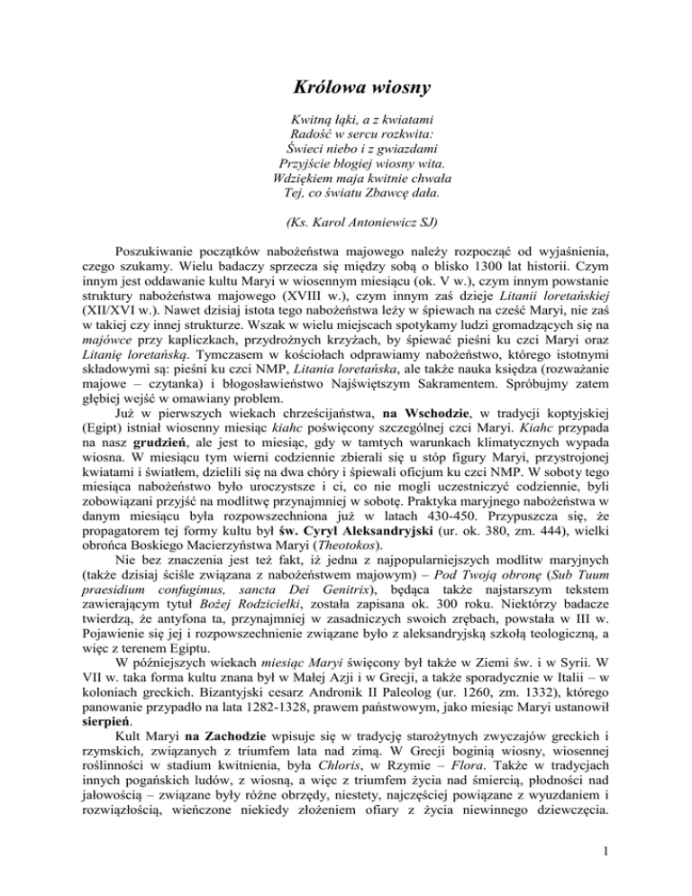 Królowa wiosny Kwitną łąki, a z kwiatami Radość w sercu rozkwita: Świeci niebo i z gwiazdami Przyjście błogiej wiosny wita. Wdziękiem maja kwitnie chwała Tej, co światu Zbawcę dała. (Ks. Karol Antoniewicz SJ) Poszukiwanie początków nabożeństwa majowego należy rozpocząć od wyjaśnienia, czego szukamy. Wielu badaczy sprzecza się między sobą o blisko 1300 lat historii. Czym innym jest oddawanie kultu Maryi w wiosennym miesiącu (ok. V w.), czym innym powstanie struktury nabożeństwa majowego (XVIII w.), czym innym zaś dzieje Litanii loretańskiej (XII/XVI w.). Nawet dzisiaj istota tego nabożeństwa leży w śpiewach na cześć Maryi, nie zaś w takiej czy innej strukturze. Wszak w wielu miejscach spotykamy ludzi gromadzących się na majówce przy kapliczkach, przydrożnych krzyżach, by śpiewać pieśni ku czci Maryi oraz Litanię loretańską. Tymczasem w kościołach odprawiamy nabożeństwo, którego istotnymi składowymi są: pieśni ku czci NMP, Litania loretańska, ale także nauka księdza (rozważanie majowe – czytanka) i błogosławieństwo Najświętszym Sakramentem. Spróbujmy zatem głębiej wejść w omawiany problem. Już w pierwszych wiekach chrześcijaństwa, na Wschodzie, w tradycji koptyjskiej (Egipt) istniał wiosenny miesiąc kiahc poświęcony szczególnej czci Maryi. Kiahc przypada na nasz grudzień, ale jest to miesiąc, gdy w tamtych warunkach klimatycznych wypada wiosna. W miesiącu tym wierni codziennie zbierali się u stóp figury Maryi, przystrojonej kwiatami i światłem, dzielili się na dwa chóry i śpiewali oficjum ku czci NMP. W soboty tego miesiąca nabożeństwo było uroczystsze i ci, co nie mogli uczestniczyć codziennie, byli zobowiązani przyjść na modlitwę przynajmniej w sobotę. Praktyka maryjnego nabożeństwa w danym miesiącu była rozpowszechniona już w latach 430-450. Przypuszcza się, że propagatorem tej formy kultu był św. Cyryl Aleksandryjski (ur. ok. 380, zm. 444), wielki obrońca Boskiego Macierzyństwa Maryi (Theotokos). Nie bez znaczenia jest też fakt, iż jedna z najpopularniejszych modlitw maryjnych (także dzisiaj ściśle związana z nabożeństwem majowym) – Pod Twoją obronę (Sub Tuum praesidium confugimus, sancta Dei Genitrix), będąca także najstarszym tekstem zawierającym tytuł Bożej Rodzicielki, została zapisana ok. 300 roku. Niektórzy badacze twierdzą, że antyfona ta, przynajmniej w zasadniczych swoich zrębach, powstała w III w. Pojawienie się jej i rozpowszechnienie związane było z aleksandryjską szkołą teologiczną, a więc z terenem Egiptu. W późniejszych wiekach miesiąc Maryi święcony był także w Ziemi św. i w Syrii. W VII w. taka forma kultu znana był w Małej Azji i w Grecji, a także sporadycznie w Italii – w koloniach greckich. Bizantyjski cesarz Andronik II Paleolog (ur. 1260, zm. 1332), którego panowanie przypadło na lata 1282-1328, prawem państwowym, jako miesiąc Maryi ustanowił sierpień. Kult Maryi na Zachodzie wpisuje się w tradycję starożytnych zwyczajów greckich i rzymskich, związanych z triumfem lata nad zimą. W Grecji boginią wiosny, wiosennej roślinności w stadium kwitnienia, była Chloris, w Rzymie – Flora. Także w tradycjach innych pogańskich ludów, z wiosną, a więc z triumfem życia nad śmiercią, płodności nad jałowością – związane były różne obrzędy, niestety, najczęściej powiązane z wyuzdaniem i rozwiązłością, wieńczone niekiedy złożeniem ofiary z życia niewinnego dziewczęcia. 1 Czciciele Maryi Dziewicy, widząc jak nienawidzący człowieka szatan korzysta z piękna wiosny i odżywania fizycznych sił człowieka, doprowadzając do wynaturzenia i śmierci niewinnego człowieka – postanowili zwrócić wiosenne uniesienie ku szlachetnemu celowi. Między innymi tak zrodził się na Zachodzie pomysł związania najbardziej wiosennego miesiąca, jakim jest maj, z osobą Maryi Dziewicy, a więc z największym arcydziełem rąk Wszechmocnego, piękniejszym nad najpiękniejsze kwiaty. Maryja jest Kwiatem, który po śmierci grzechu rozkwita, by narodzić owoc dający życie wieczne – Jezusa Chrystusa. W ten sposób wiosenne uniesienie człowieka skierowano ku czystości i pięknu. Hiszpański król Alfons X Mądry (ur. 1221, zm. 1284) rozpowszechnił ten pomysł poprzez swoją poetycką twórczość i królewski autorytet. Jest on m.in. autorem ok. 450 pieśni religijnych ku czci Matki Boskiej (Cantigas de Santa Maria), pośród których znajduje się poemat Ben vennas, Mayo. Król błogosławi w nim nadejście miesiąca maja, który swym pięknem zaprasza nas do modlitwy i śpiewu na cześć Maryi, by wyrwać człowieka z nocy błędów, obronić przed napaściami szatana, zachować od wszelkiej przeciwności i nieszczęścia. Dzięki królowi, w Hiszpanii rozpowszechnił się zwyczaj gromadzenia się codziennie w maju przed wizerunkami Bogarodzicy. Z Hiszpanii zwyczaj ten szybko rozprzestrzenił się na sąsiednią Portugalię, a następnie trafił do Włoch i do niektórych części Niemiec. Także w Notre Dame w Paryżu, od połowy XIV w., cech paryskich złotników corocznie w dniu 1 maja kwiatami i zielenią stroił ołtarz Matki Bożej. Drugim na Zachodzie gorącym propagatorem kultu maryjnego w miesiącu maju był niemiecki dominikanin bł. Henryk Suzo (ur. 1295, zm. 1366) – przyjaciel mistyka Jana Taulera i uczeń najwybitniejszego mistyka szkoły nadreńskiej Mistrza Eckharta. Już jako dziecko zbierał w maju kwiaty i niósł je do stóp Matki Bożej. Lubił z kwiatów pleść wieńce (zwłaszcza korony z róż) i kłaść je na głowę figur Bożej Rodzicielki. Był jednym z największych mistyków średniowiecza, wybitnych intelektualistów o poetyckiej wrażliwości. Jego kult Maryja nagrodziła wizjami chwały, jaką odbiera od Aniołów. W majowe dni, w swych wizjach słyszał śpiewy czystych duchów, które m.in. uwielbiały Ją ulubionym hymnem Maryi – Magnificat. W swyc